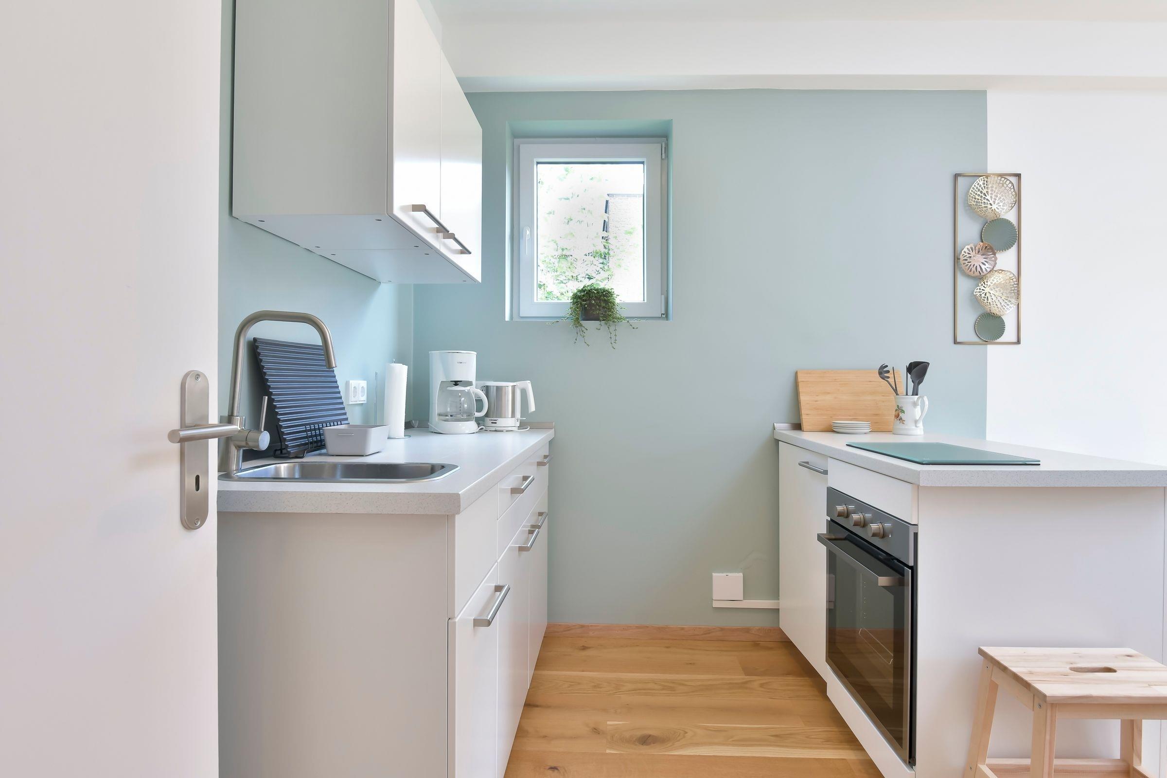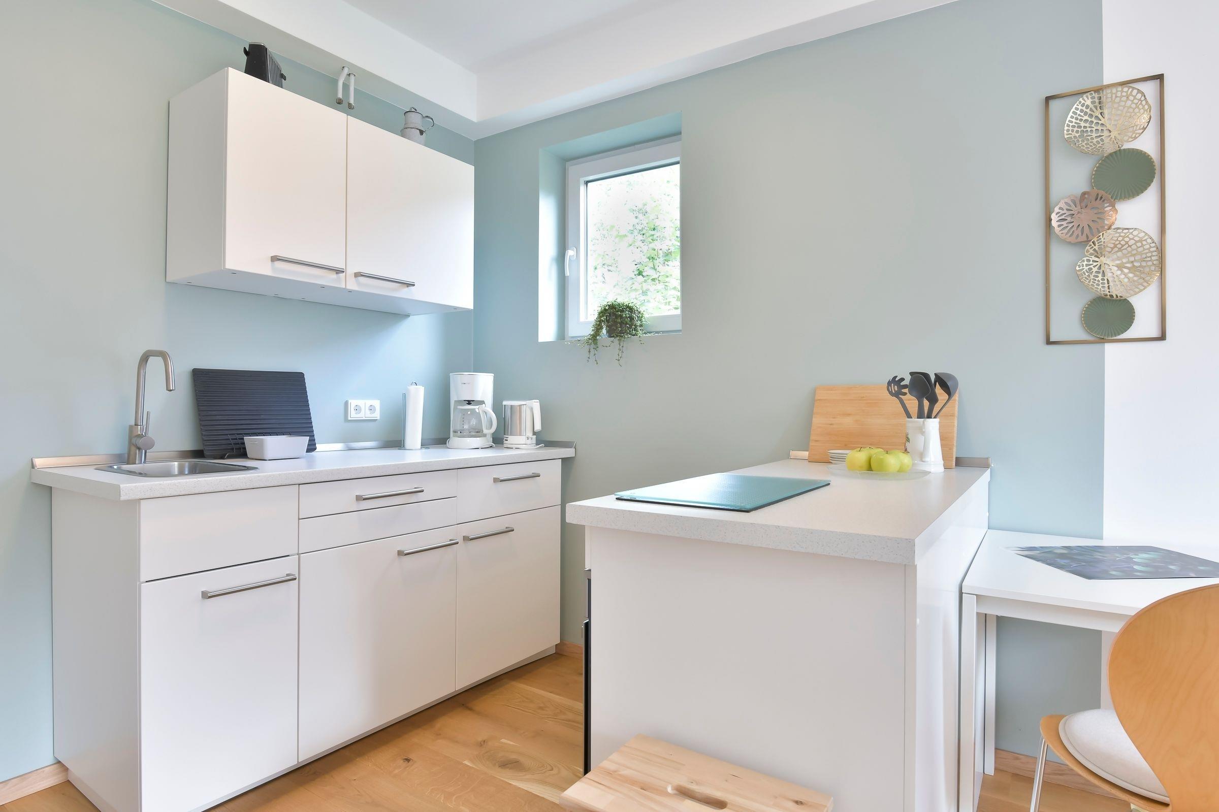 Das Wohnzimmer ist gemütlich mit Sofa und Sessel sowie Flatscreen-TV möbliert, Plissées sorgen für angenehmen Licht- und Sichtschutz. Die moderne Küchenzeile sowie ein Essplatz für zwei ist in den Wohnbereich integriert. Ein WLAN-Anschluss ist inklusive. In der clever ausgestatteten Küche lassen sich mit Induktionsherd mit 2 Kochfeldern und Backofen leckere Urlaubsgerichte zaubern.