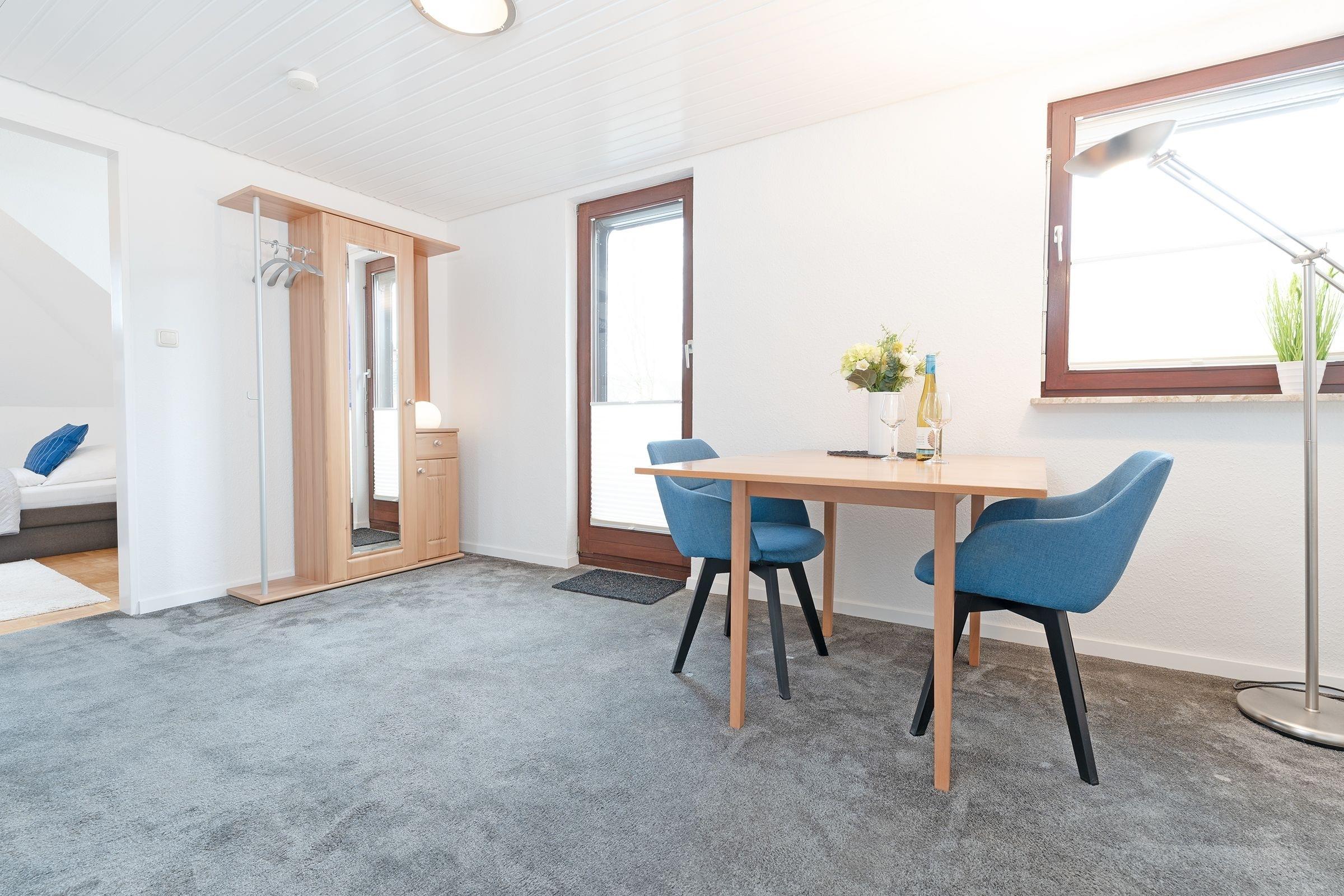 Der helle Wohnbereich wartet mit einer gemütlichen Couch, einem Smart-TV und einem zusätzlichen Bett (ca. 90x200cm) auf. Von hier aus gelangen Sie auch auf den 3,4 m² großen, möblierten Südbalkon, auf dem Sie zahlreiche Sonnenstunden genießen können. In der separaten kleinen Küche finden alles, was Sie für das Zubereiten Ihrer Mahlzeiten benötigen, die Sie anschließend im angrenzenden Esszimmer gemeinsam einnehmen können. Das Schlafzimmer ist mit einem Doppelbett (2x 90x200 cm) und einem Kleiderschrank ausgestattet. Frisch ausgeruht können Sie dann im Tageslicht-Duschbad in den neuen Urlaubstag starten.