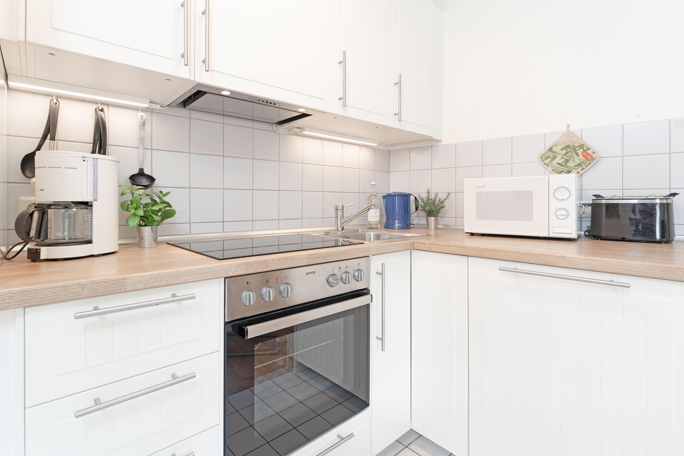 Wasser und Wälder prägen die Holsteinische Schweiz. Sie suchen Erholung und Abwechslung gleichermaßen? Dann sind Sie hier genau richtig: Die gemütliche Ferienwohnung befindet sich in einer gepflegten Appartementanlage. Schon beim Betreten des Wohn-/Esszimmers werden Sie sich wohlfühlen: von der bequemen Polstergarnitur aus können Sie sich vom TV-Gerät unterhalten lassen – oder Sie genießen den Blick ins Grüne durch die große Fensterfront. Von hier aus lässt sich auch die kleine überdachte Terrasse betreten. Dank der Südwest-Ausrichtung können Sie sich über zahlreiche schöne Stunden im Freien freuen – auch der Gemeinschaftsgarten lädt dazu ein. Wie wäre es zum Sonnenuntergang mit einem Glas Wein? Zurück im Wohn-/Esszimmer bietet Ihnen die offen gestaltete Küche eine gute Grundausstattung, die Sie für eine Verpflegung im Urlaub benötigen. In der netten Sitzecke genau davor können Sie Ihre Speisen genießen und auch wunderbar Ihre Ausflüge planen. Nach einem zauberhaften Urlaubstag verspricht das Doppelbett (2x 90x200 cm) im Schlafzimmer eine erholsame Nachtruhe. Ihre Urlaubsgarderobe lässt sich im Kleiderschrank verstauen. Leider ist hier kein Platz für ein Babybett - aber im Flur direkt vor dem Schlafzimmer oder auch im Wohnzimmer kann ein Babybett dazu gestellt werden. Den nächsten Tag beginnen Sie im hell gefliesten Duschbad mit Föhn und Handtuchwärmer.