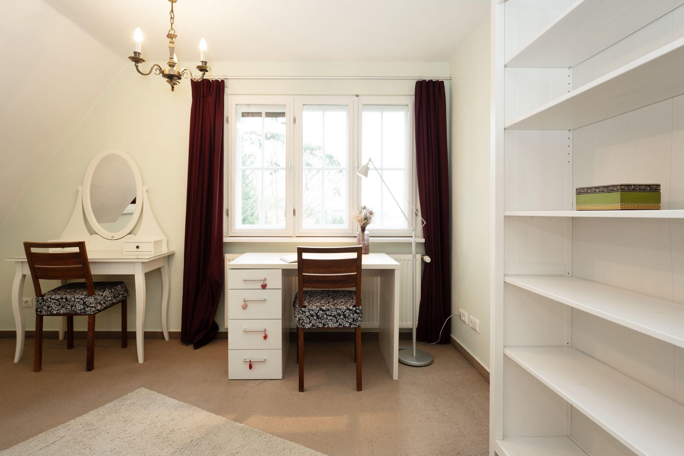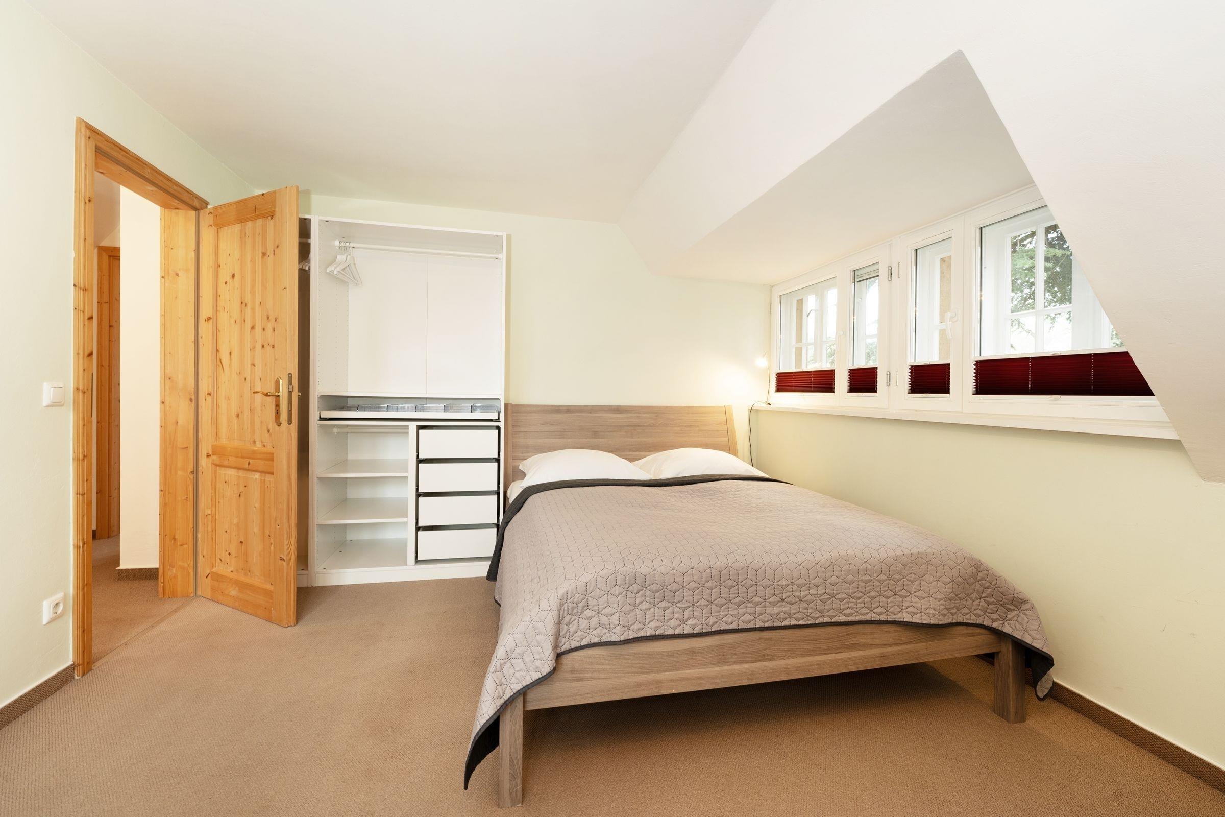 Schlafzimmer 2: Doppelbett (2x 80x200 cm), 1. OG, Verdunkelung: Vorhänge, kein Platz für Babybett vorhanden