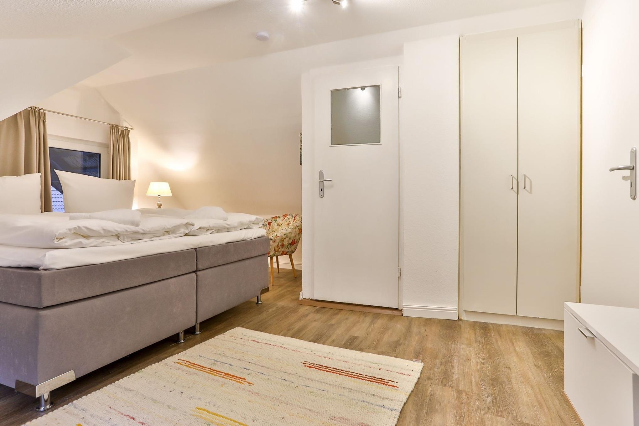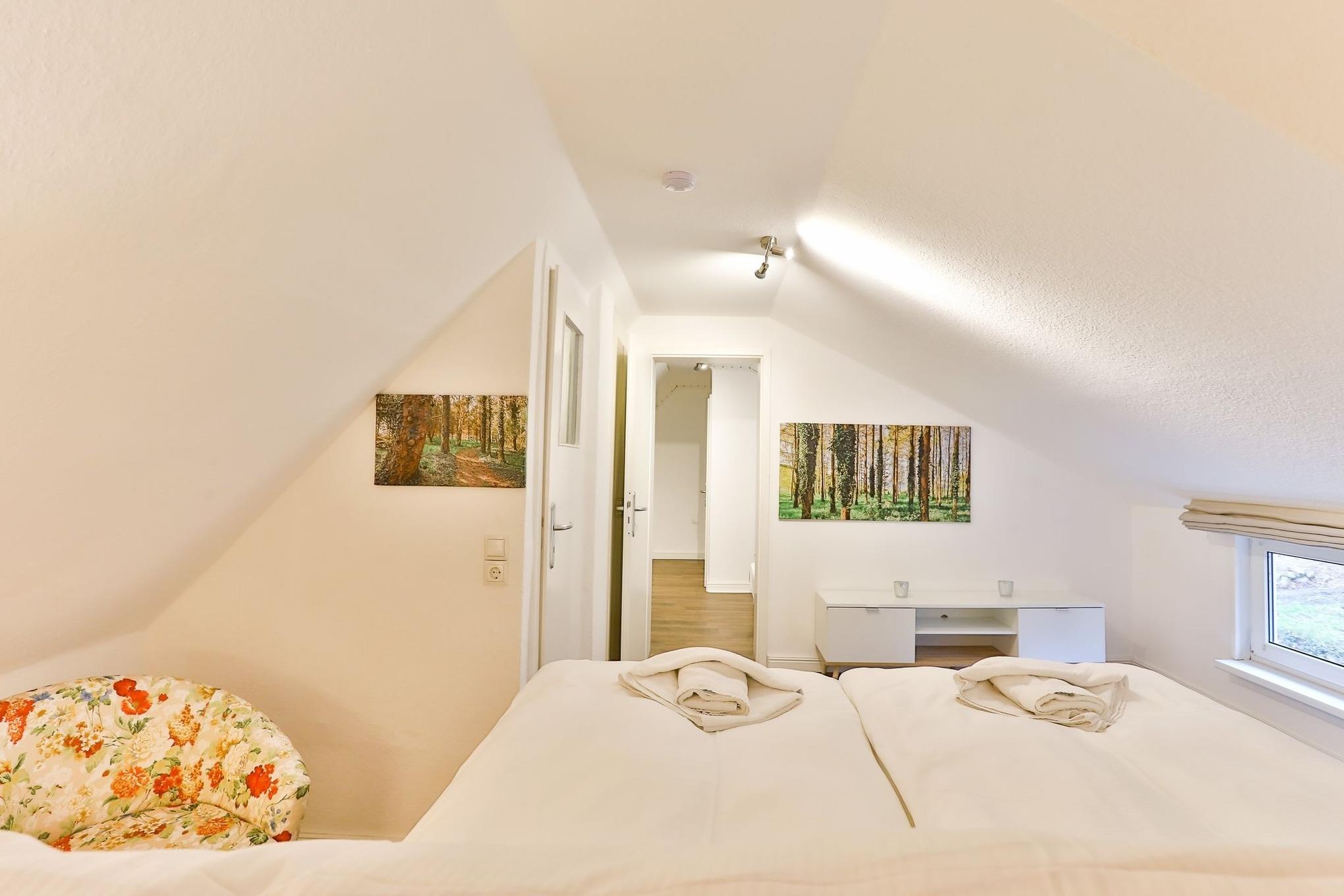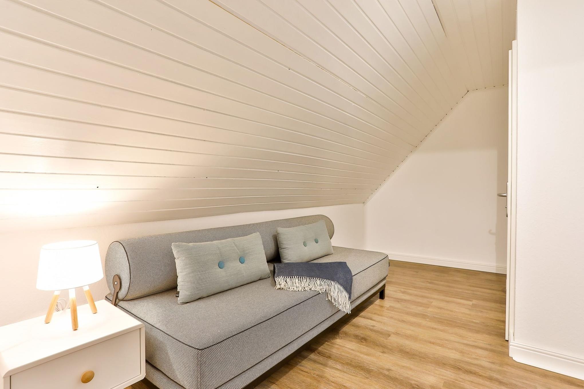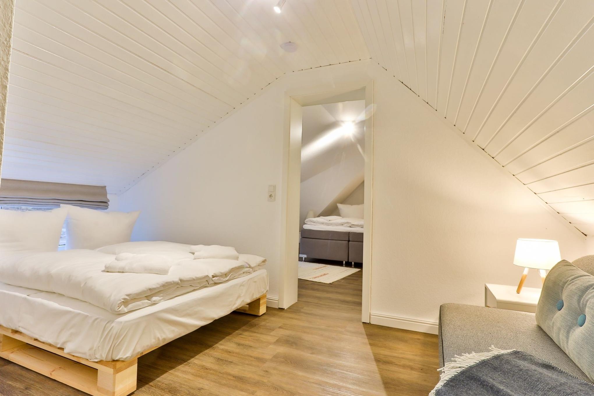Im Erdgeschoss unseres "Raumwunders Rotbuche" befindet sich ein gemütlicher Wohn- und Essbereich mit einer kleinen Küchenzeile und einem Badezimmer mit WC und Dusche. Im Obergeschoss ist das Reethus mit zwei Schlafzimmern und einem kleinen WC ausgestattet. Vor dem Hauseingang befindet sich eine kleine, überdachte Terrasse. Bitte beachten sie, dass das Reethus eine eingeschränkte Deckenhöhe von 2 m hat.