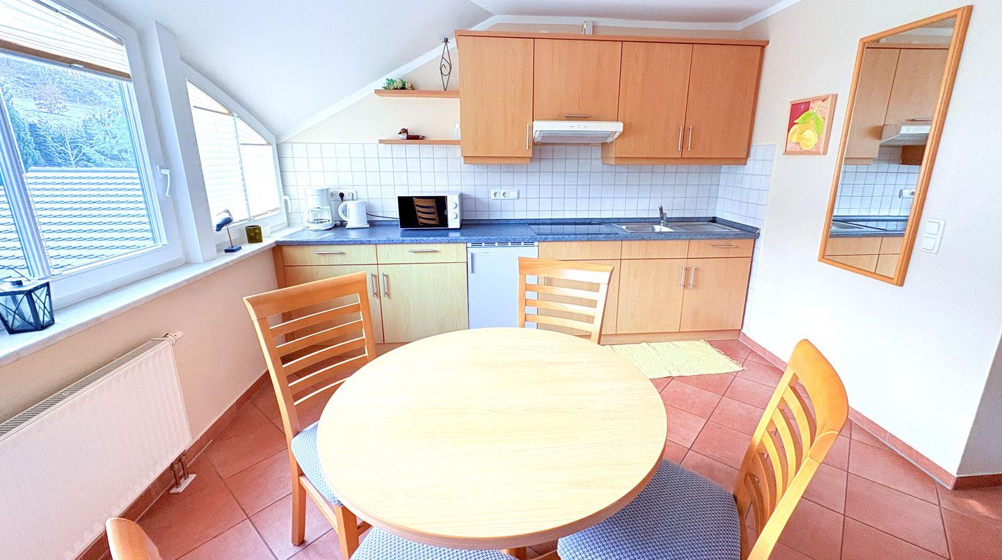 Wohnung 2 für 4 Personen, im ersten Obergeschoss gelegen, bietet auf 48 m² ein offenes, lichtdurchflutetes Wohn-/Schlafzimmer mit integrierter Küchenzeile und Essecke. Das gemütliche Schlafzimmer ist mit einem Doppelbett ausgestattet.