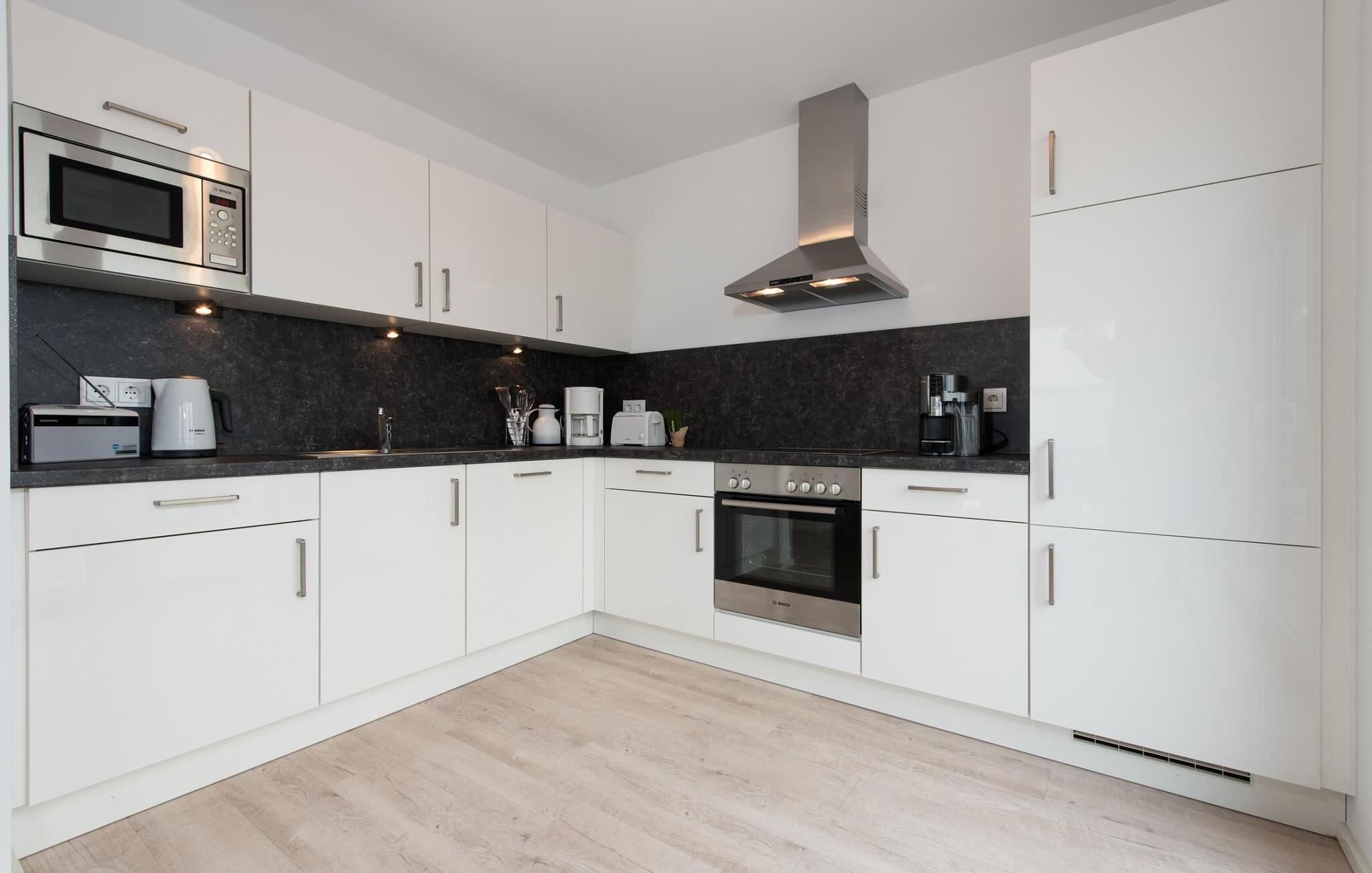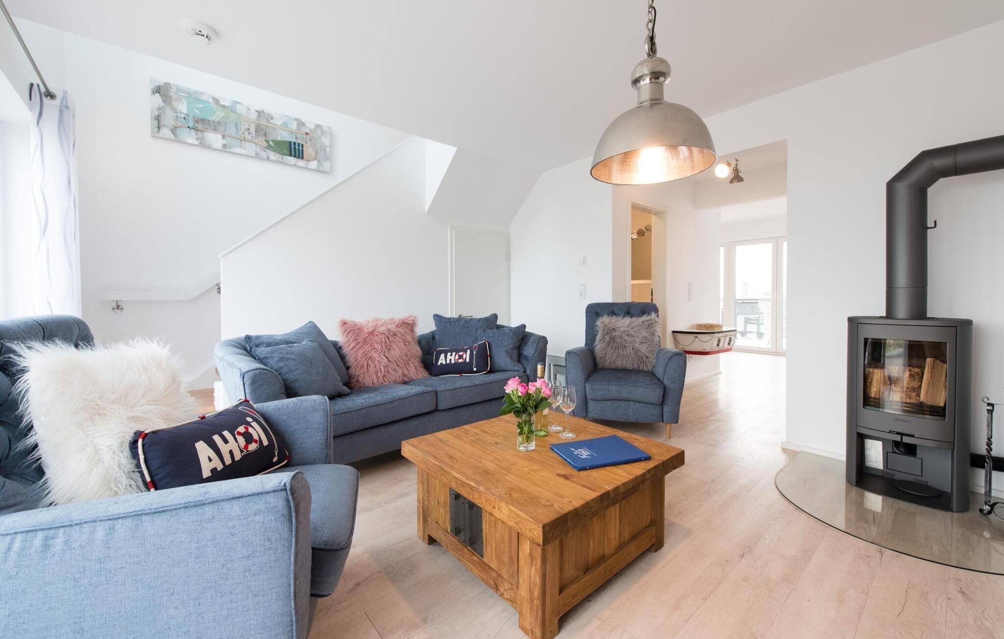 Im Urlaub ist Zeit für kreatives Kochen, die rundum ausgestattete Wohnküche lässt hierbei keine Wünsche offen. Kuschelig wird es im Wohnzimmer, denn hier lädt eine gemütliche Sitzlandschaft auch an nordischen Schietwettertagen zu einem Kaminabend ein. Auf der zweiten Ebene befindet sich der Ruhebereich des Ferienobjekts. Das Hauptschlafzimmer verfügt über einen traumhaften Hafenblick. Einschlafen unter
