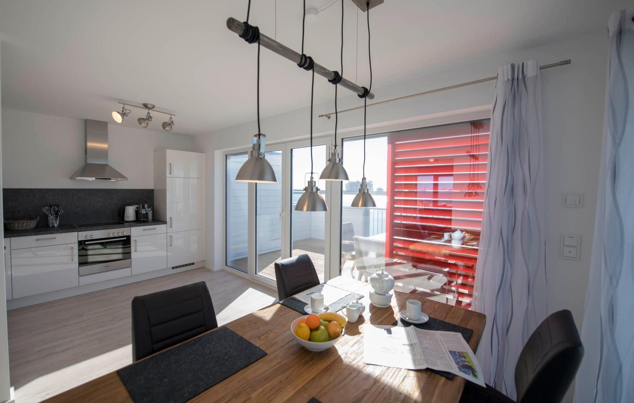 Lichtdurchflutet gestaltet sich der Wohn- /Essbereich des Ferienobjekts mit bodentiefen Panorama-Fensterfronten zu den anliegenden Terrassen auf beiden Seiten. Traumhafte Aussichten eröffnen sich auf der an den Essbereich angrenzenden Terrasse mit Blick über den Segel- und Sportboothafen des OstseeResort Olpenitz. Ob romantisches Candle-Light-Dinner oder gesellige GrillrundeHafenkino und traumhafte Sonnenansichten sind hier garantiert. Frühaufsteher dürfen sich an der einmaligen Morgenstimmung erfreuenein wahres Naturspektakel, wenn Enten, Gänse und Schwäne auf der Schlei ihre Flugkünste ausprobieren.