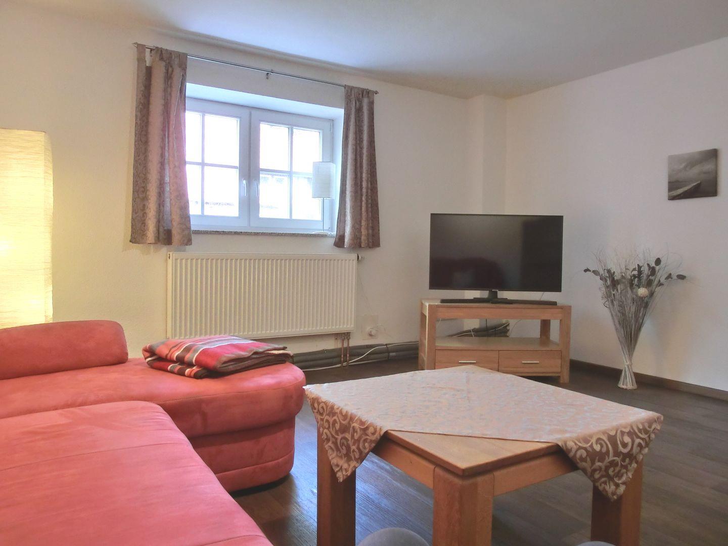 - Das Wohnzimmer ist mit einem Sitzbereich und Sat-TV eingerichtet.