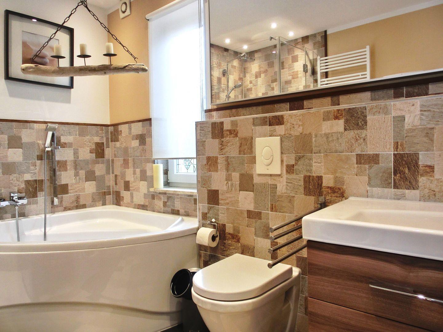 • Modernes Tageslichtbad im Erdgeschoss mit Dusche, Eckbadewanne, Haartrockner und Waschmaschine, plus separates Gäste-WC.
