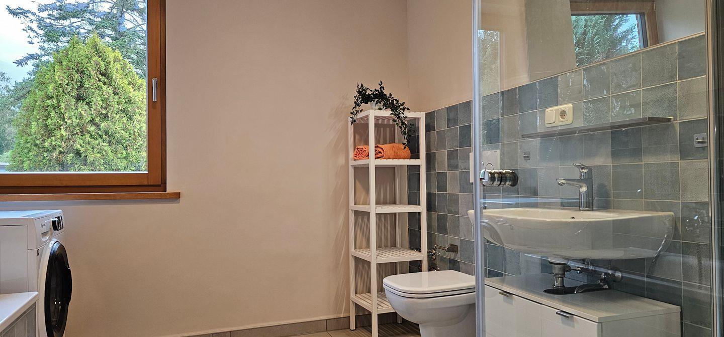 Das Tageslichtbadezimmer ist ein Highlight: Es bietet sowohl eine Badewanne als auch eine ebenerdige Dusche, sodass Sie die Wahl haben, ob Sie sich entspannen oder schnell frisch machen möchten. Auch ein Haartrockner und eine Waschmaschine können gerne genutzt werden.