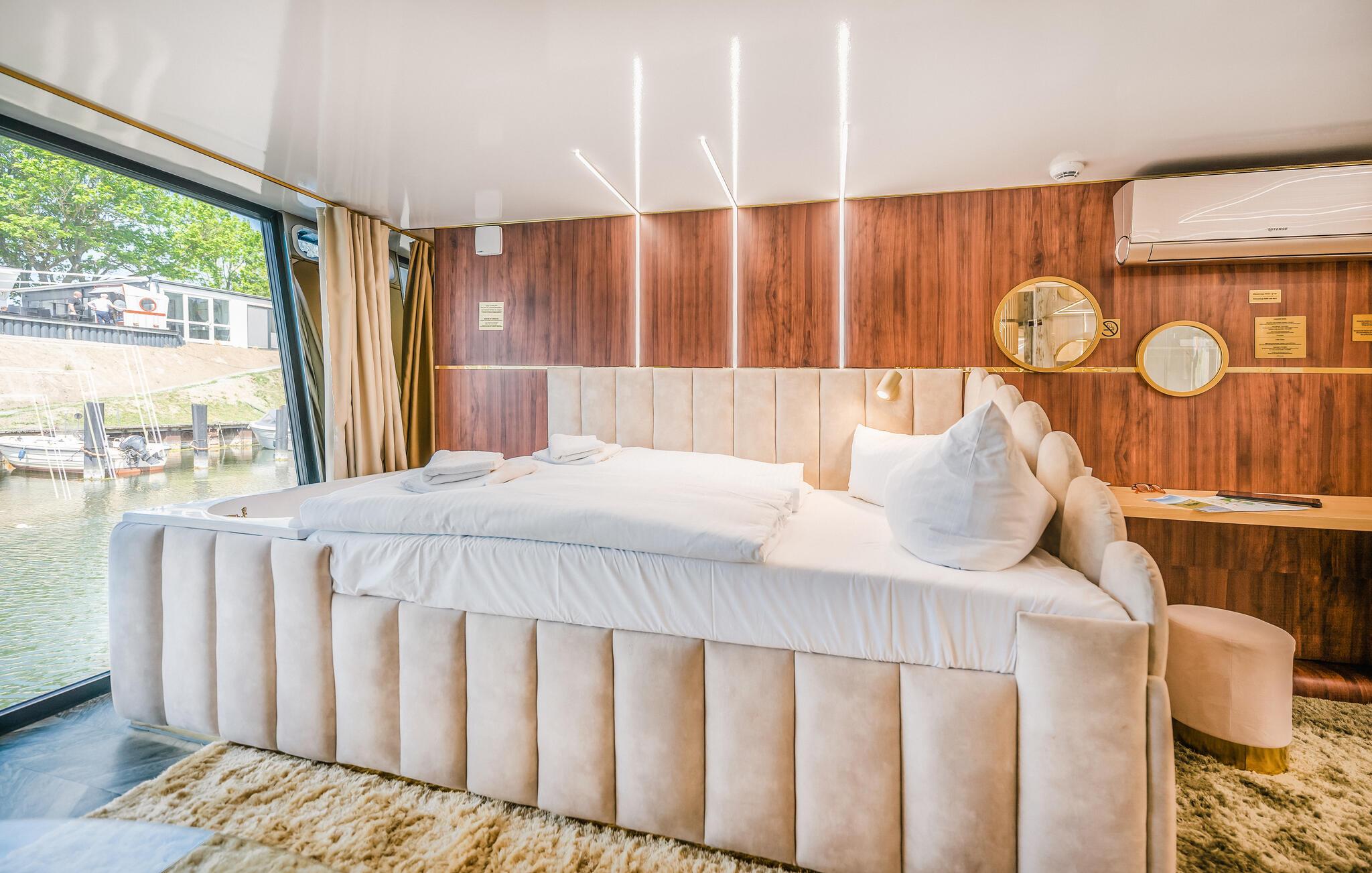 Das festliegende Hausboot Relax verbindet eindrucksvoll Luxus auf dem Wasser mit der Nähe zur Natur in der Marina Martinshafen.