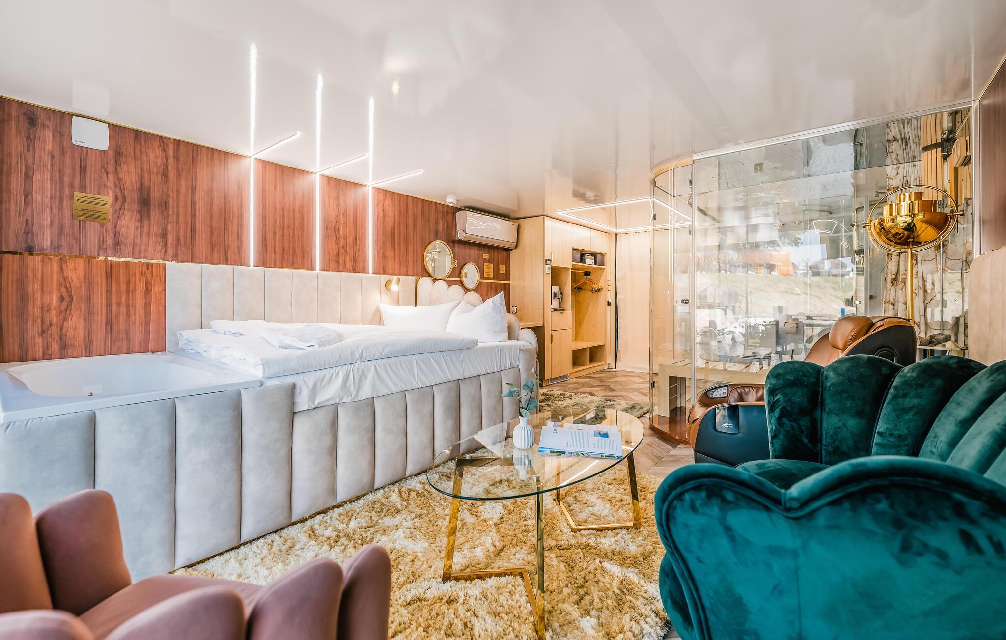 Sie betreten die Wassersuite über eine Terrasse mit Loungesitzmöbeln und gelangt in den Hauptwohnbereich mit großem Panoramafenster. Der Wohnbereich verfügt über ein Doppelbett und eine Schlafcouch. Darüber hinaus ist ein Flachbild-TV vorhanden. Ein kleiner Kühlschrank, eine Kaffeemaschine und ein Wasserkocher sind ebenfalls an Bord. Das kleine Bad ist mit einer Dusche, einem Waschbecken und einem WC ausgestattet. Hier integriert befindet sich eine kleine Dampfsauna. Ein elektrischer Massagesessel rundet das Wellnessangebot dieser Wassersuite ab. Eine Klimaanlage sorgt für angenehmes Klima auf der Luxus-Location.