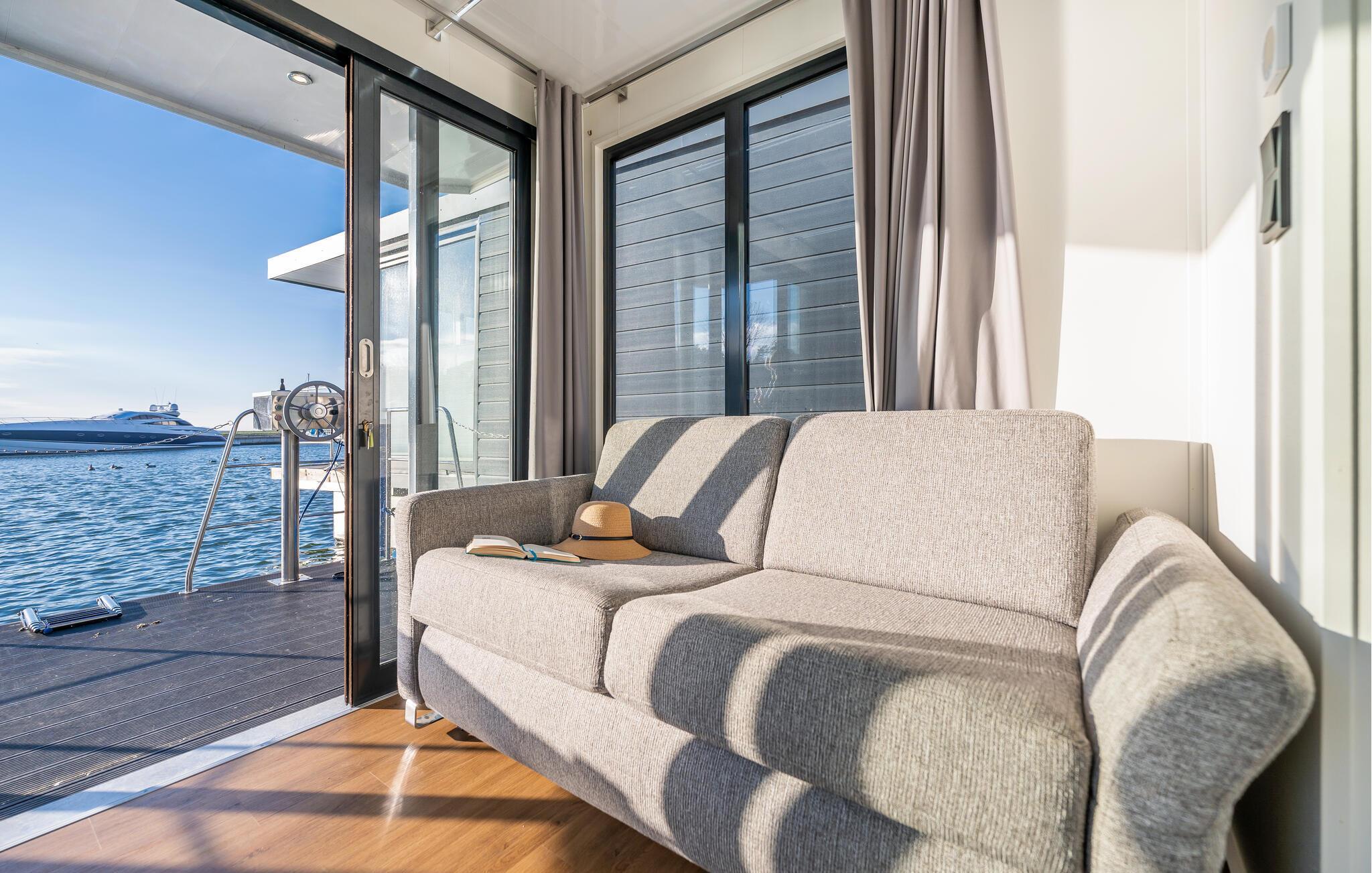 Das Tiny-Hausboot, als Mobilheim auf dem Wasser, verfügt über einen kleinen Wohnbereich mit Schlafcouch und Flachbild-SAT-TV. Ein kleines separates Schlafzimmer verfügt über ein ausziehbares Bett. Sowohl Wohnzimmer als Schlafzimmer verfügen über einen Ein- und Ausgang zu einer jeweiligen Außenterrasse. Ein kleines Badezimmer ist mit einer Dusche, einem Waschbecken und WC, sowie einem Haartrockner ausgestattet. Der Wohnbereich ist zusätzlich mit einem kleinen Kühlschrank, einer Spüle, einem Wasserkocher und einer Kaffeemaschine ausgestattet. Eine Klimaanlage sorgt für angenehmes Klima auf dem kleinen Raumwunder. Eine Terrasse mit Sitzgelegenheiten bietet den schönsten Blick auf Hafenkino und den Jasmunder Bodden.