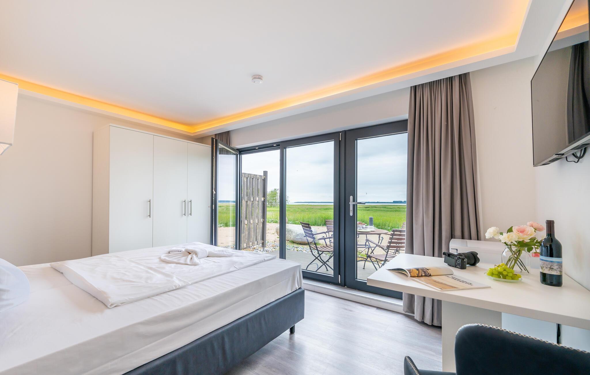 Das 2-Zimmer-Apartment Boddenblick in Martinshafen bietet Natur pur, Wasserblick und Sauna in idyllischer Marina-Lage.