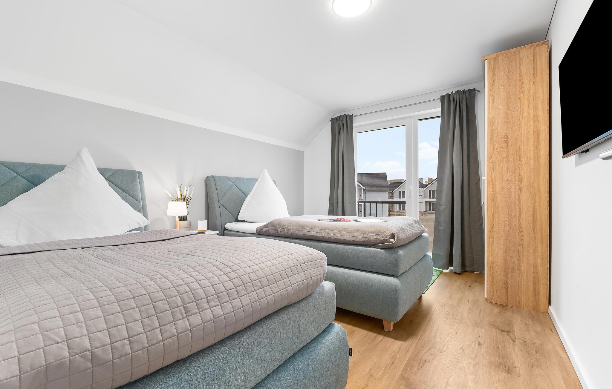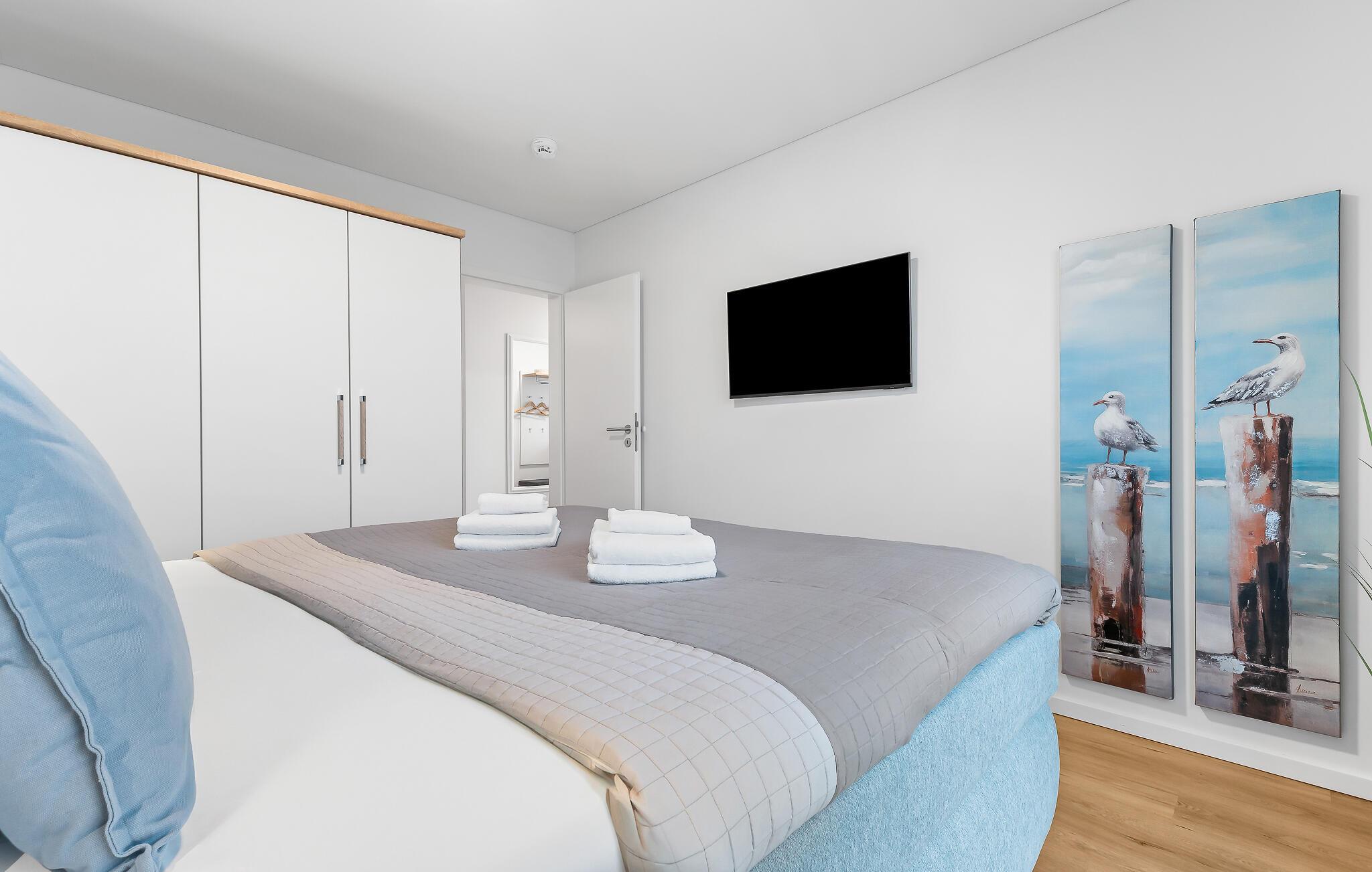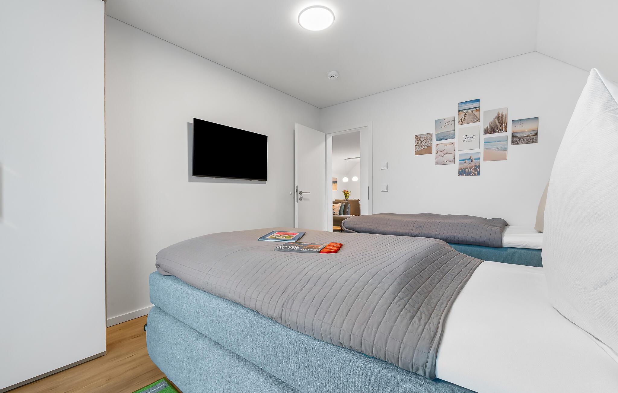 Die Ferienwohnung verfügt über zwei Schlafzimmer: Das erste Schlafzimmer ist mit einem gemütlichen Doppelbett (180x200cm) und einem Smart-TV ausgestattet, während das zweite Schlafzimmer über zwei Einzelbetten (100x200cm) und ebenfalls einen Smart-TV verfügt. Die besonders kinderfreundliche Matrosenkoje verfügt über eine Spielzeugkiste mit Spielsachen und Büchern, sowie gesicherte Steckdosen.