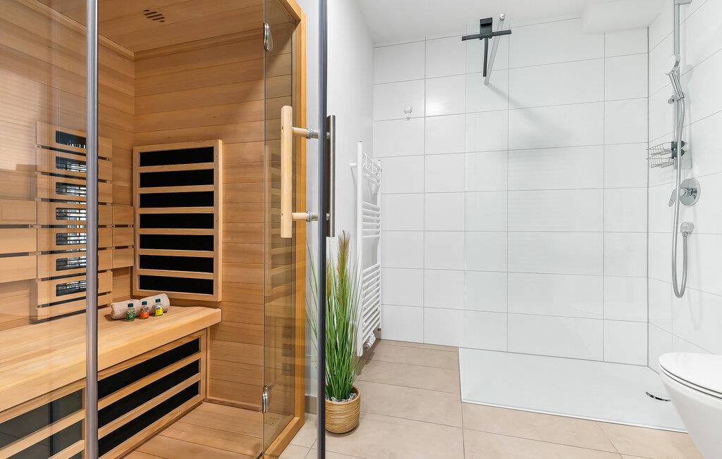 Das moderne Badezimmer ist mit einer bodengleichen Dusche und einer Infrarotkabine ausgestattet, die Ihnen nach einem langen Strandtag die perfekte Entspannung bieten.