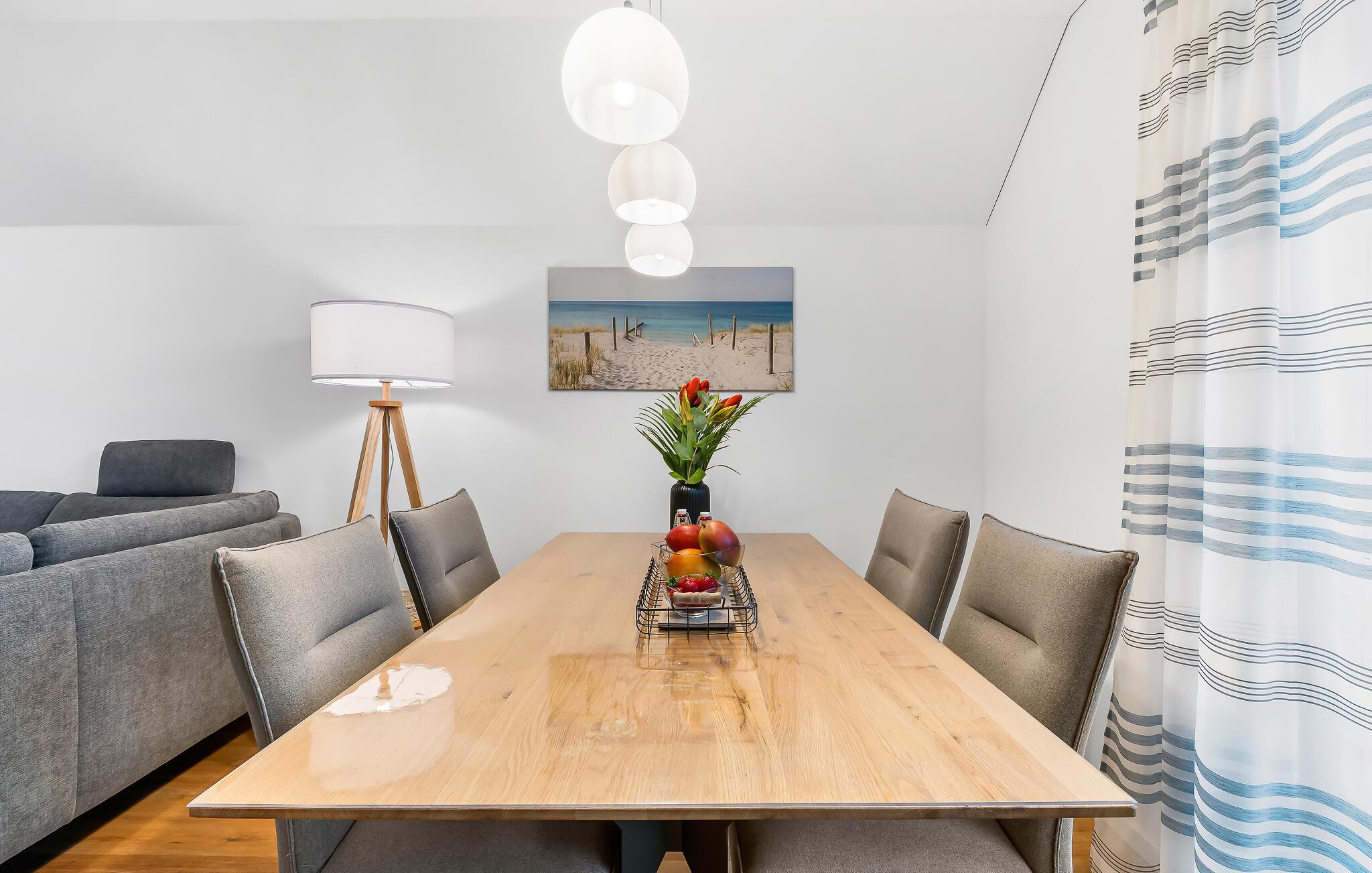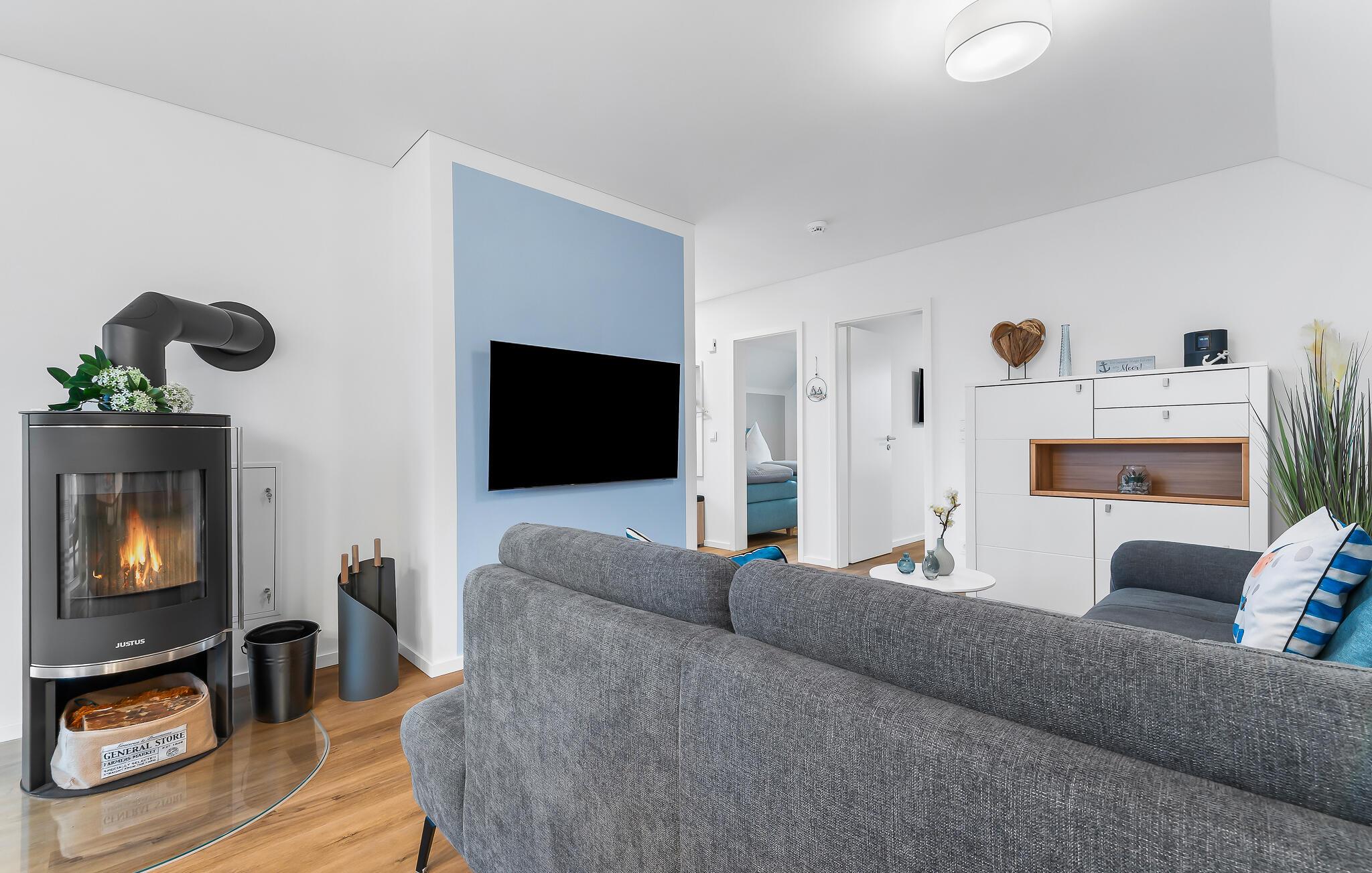 Der offene Wohn-Essbereich ist der perfekte Ort, um gemeinsam Zeit zu verbringen. Das Wohnzimmer ist mit einem modernen Smart-TV und einem Bose Internetradio ausgestattet. Bei nordischem Schlechtwetter können Sie es sich auf dem Sofa vor dem Kamin gemütlich machen.