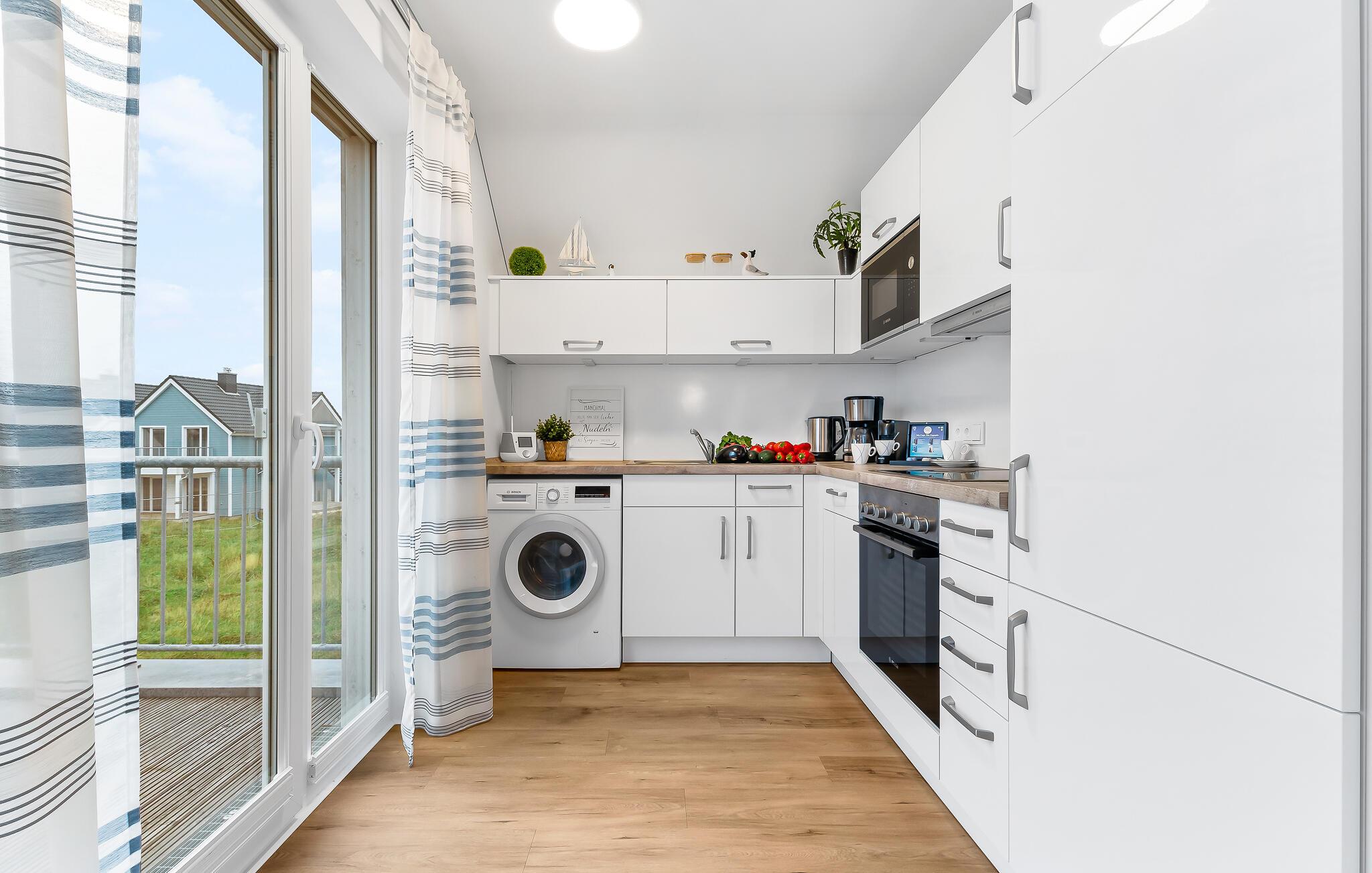 Die angrenzende, voll ausgestattete Küche lässt keine Wünsche offen und bietet alles, was Sie zum Kochen benötigen. Von hier aus gelangen Sie auf den großzügigen Balkon – der ideale Ort, um den Tag morgens mit einer Tasse Kaffee zu beginnen, oder ihn gemütlich mit einem Glas Wein in der Hand ausklingen zu lassen.