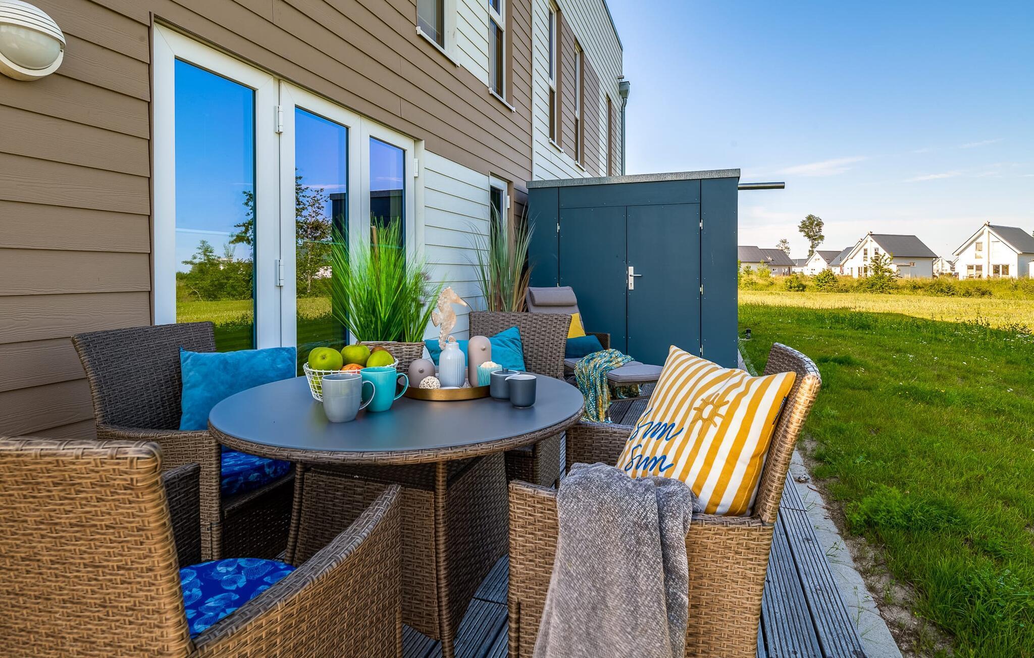 Direkt vom Wohnbereich aus betretet die große Terrasse mit Süd-West-Ausrichtung. Diese bietet erholsame Stunden fernab von dem Trubel des restlichen OstseeResorts. Nach hinten ausgerichtet mit Blick auf die Naturschutz-Salzwiesen, Felder laden die bereitstehenden Gartenliegen zu erholsamen Urlaubstagen ein.