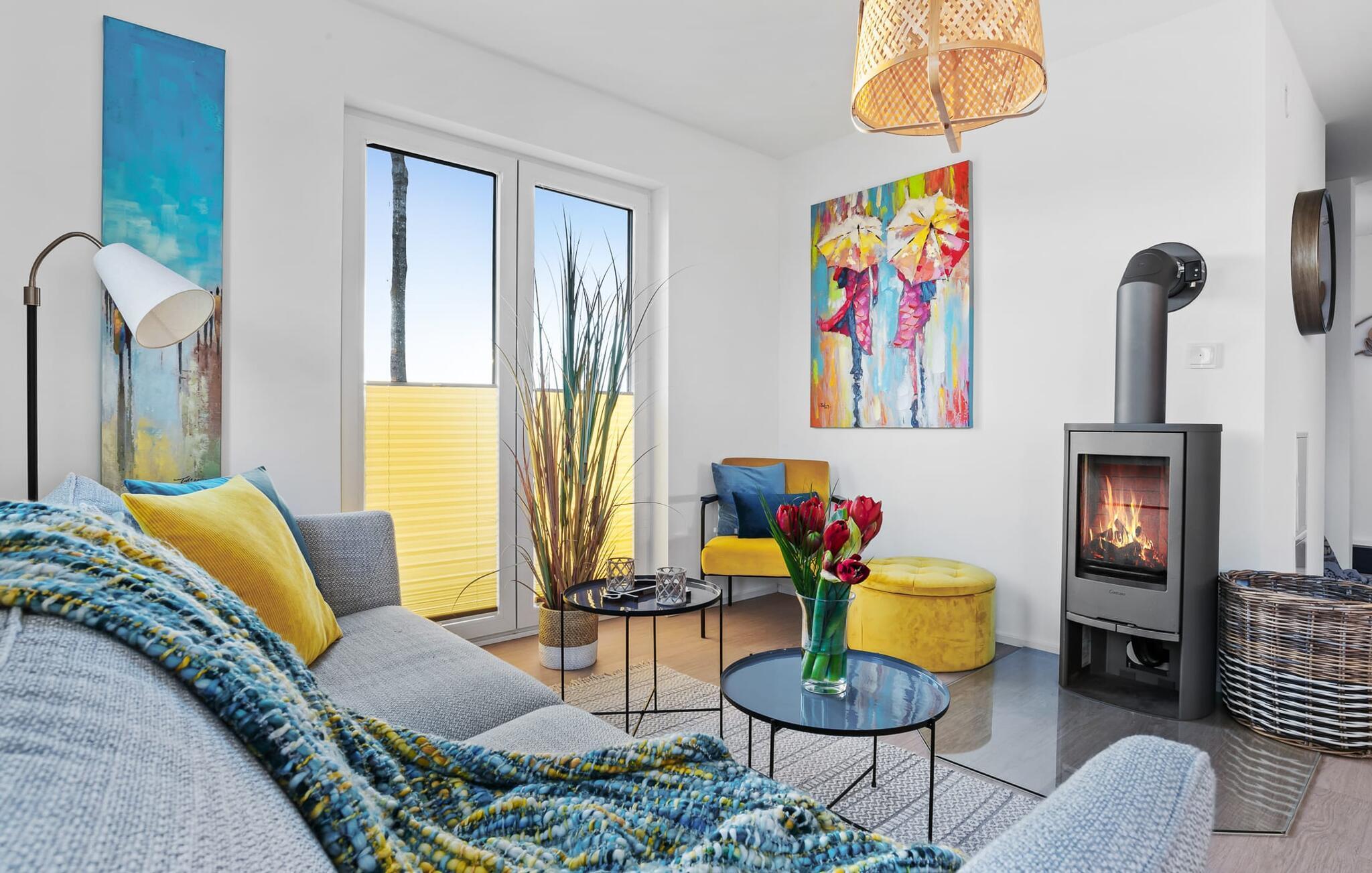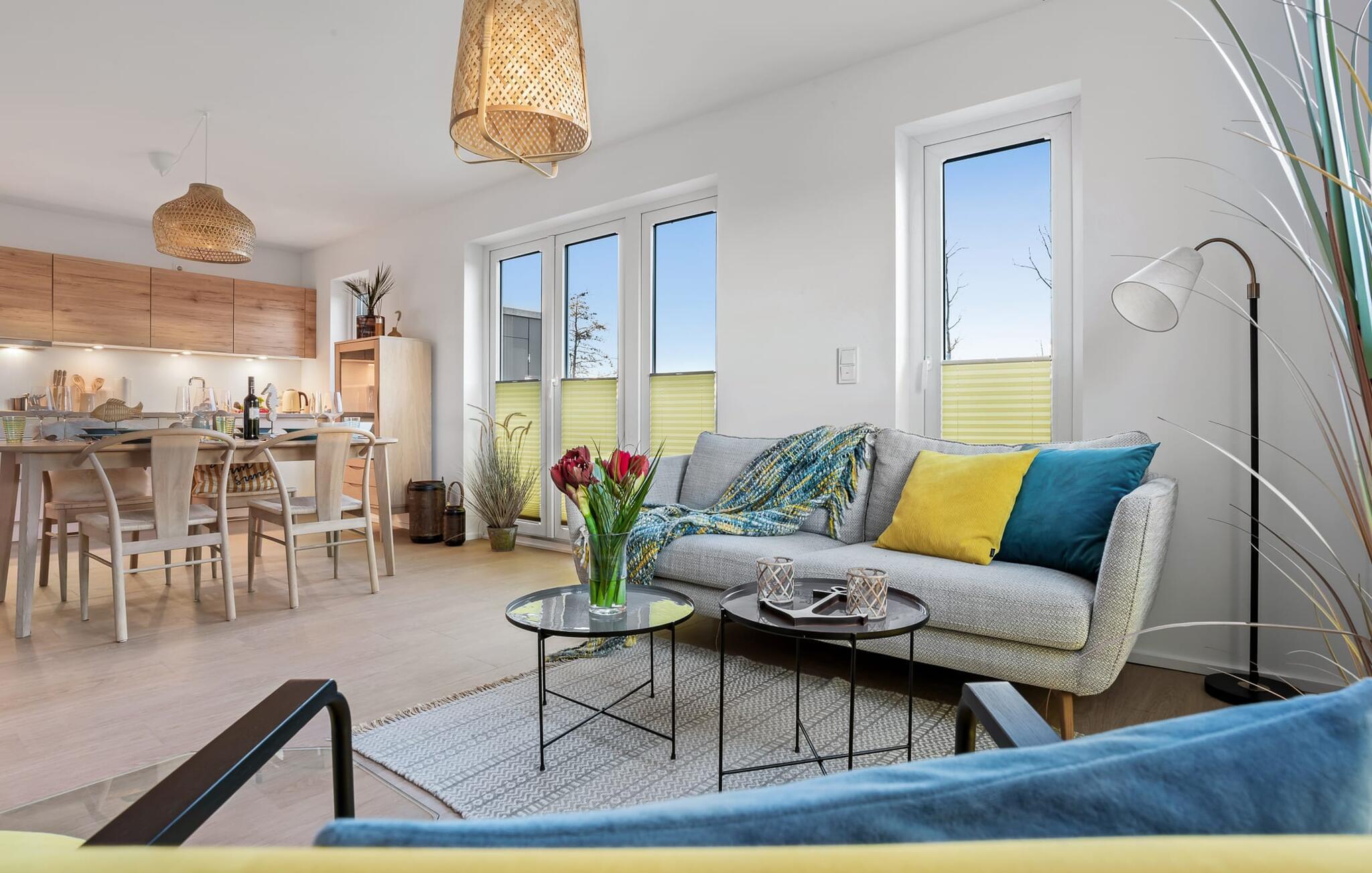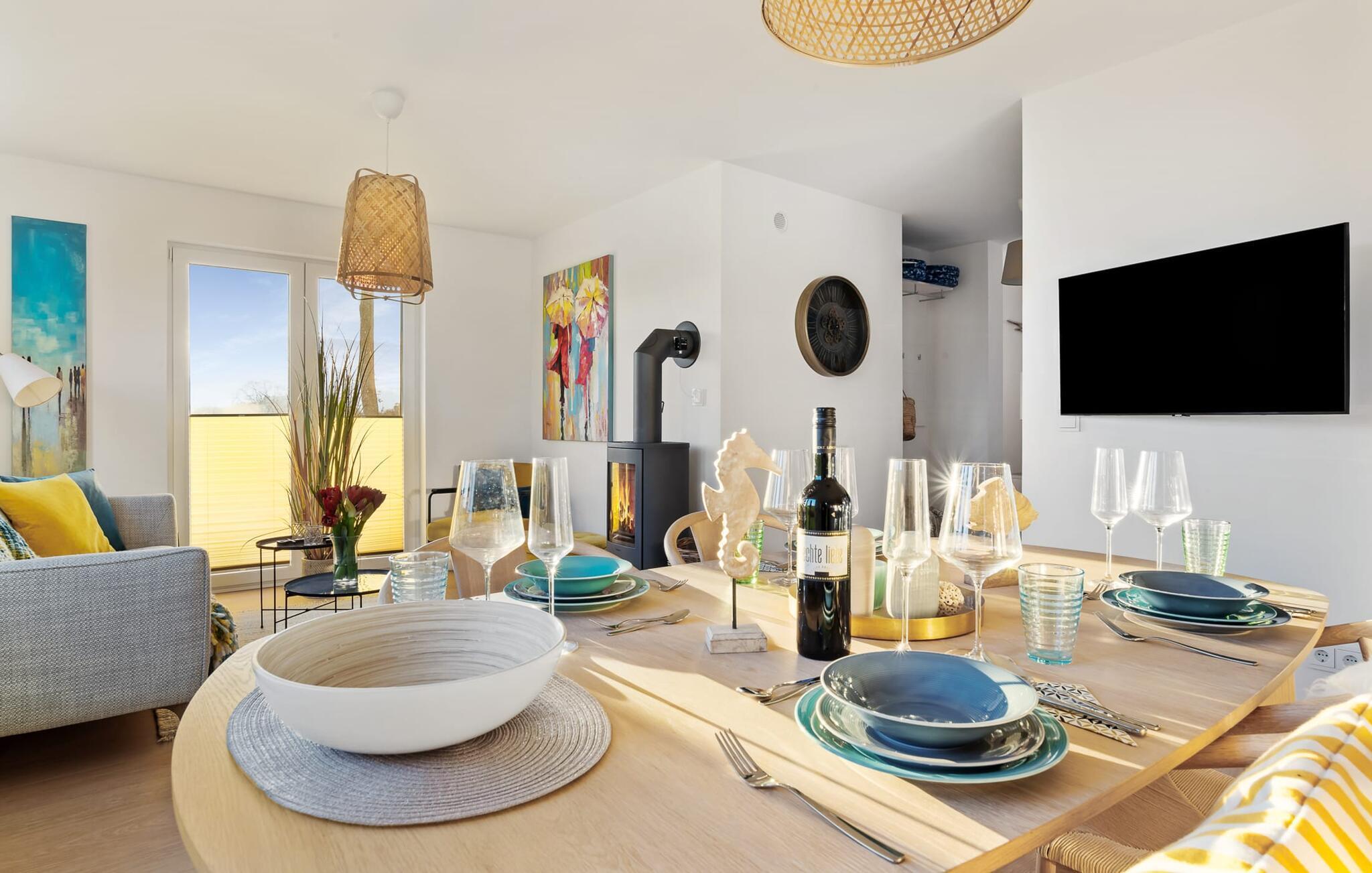 Mit seiner bodentiefen Fensterfront und der angrenzenden großen Terrasse ist der offene Wohn-/Essbereich das Herz der Wohnung. Hier hineinkommen und sich sofort Zuhause fühlen ist eins. Auf der Wohnlandschaft mit Kuschelfaktor zu entspannen, aus dem Fenster die Ruhe der Natur genießen oder fernsehen ist Entspannung und Erholung pur! Der Alltag entrückt immer mehr. Sollte das Wetter sich einmal von der nordischen Seite zeigen, sorgt der Kaminofen mit seinem prasselnden Feuer für weitere Behaglichkeit.