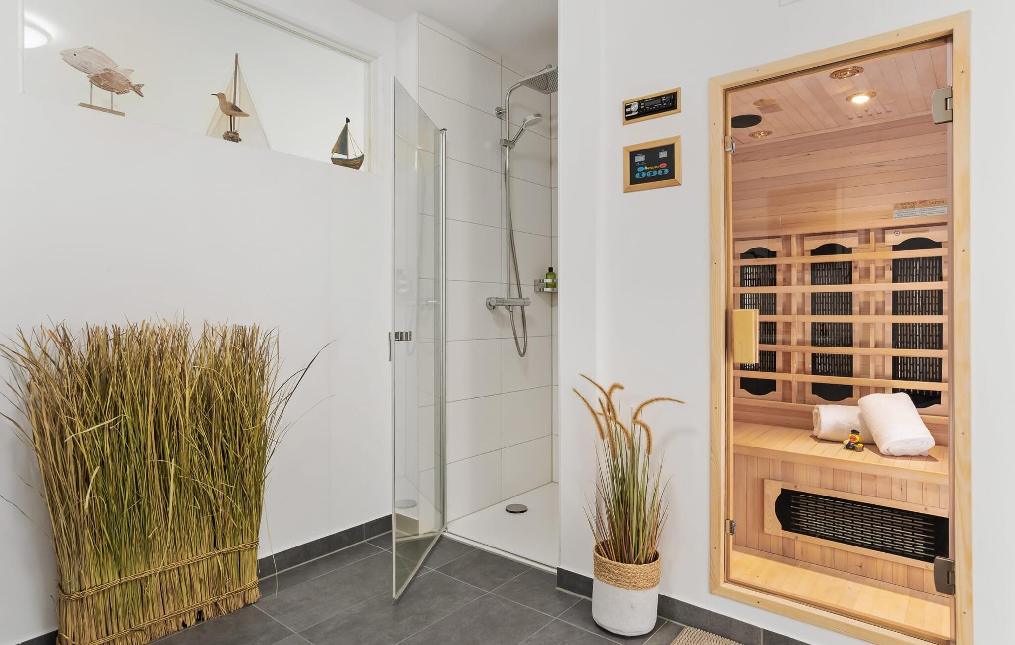 Das Duschbad mit bodengleicher Dusche und einer Infrarot-Sauna sorgt für unvergessliche Wellnessmomente von denen ihr noch lange zehren könnt.