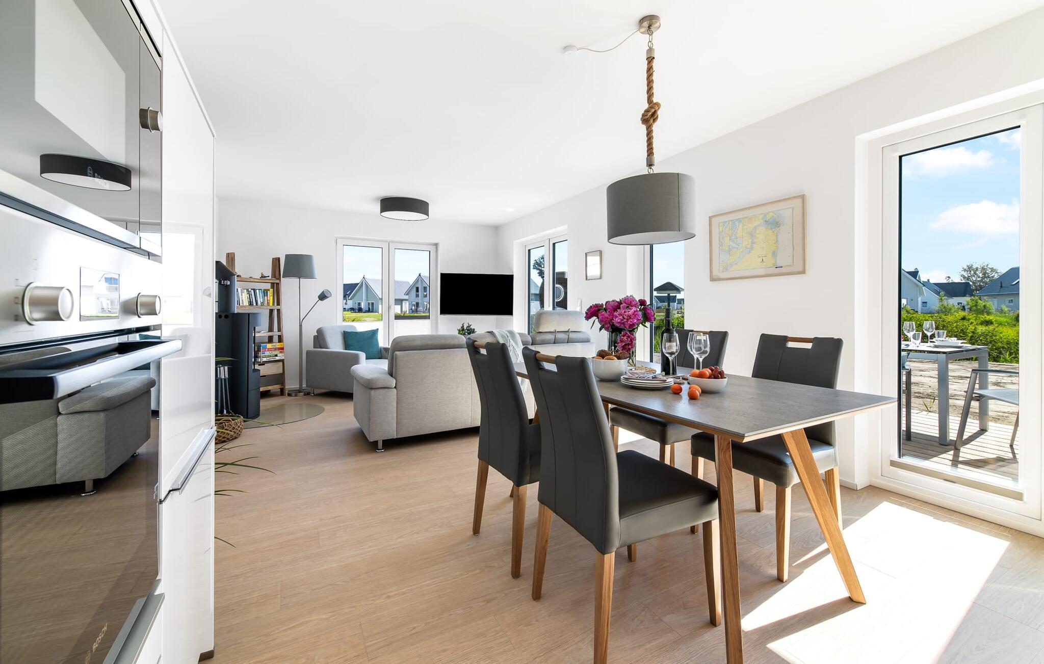 Mit den bodentiefen Fensterfronten und der angrenzenden Terrasse ist der offene Wohn- und Essbereich das Herz der Matrosenlounge.