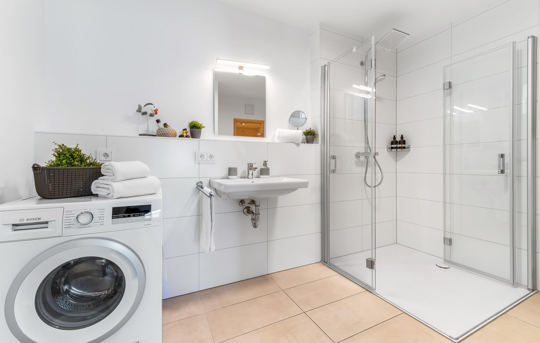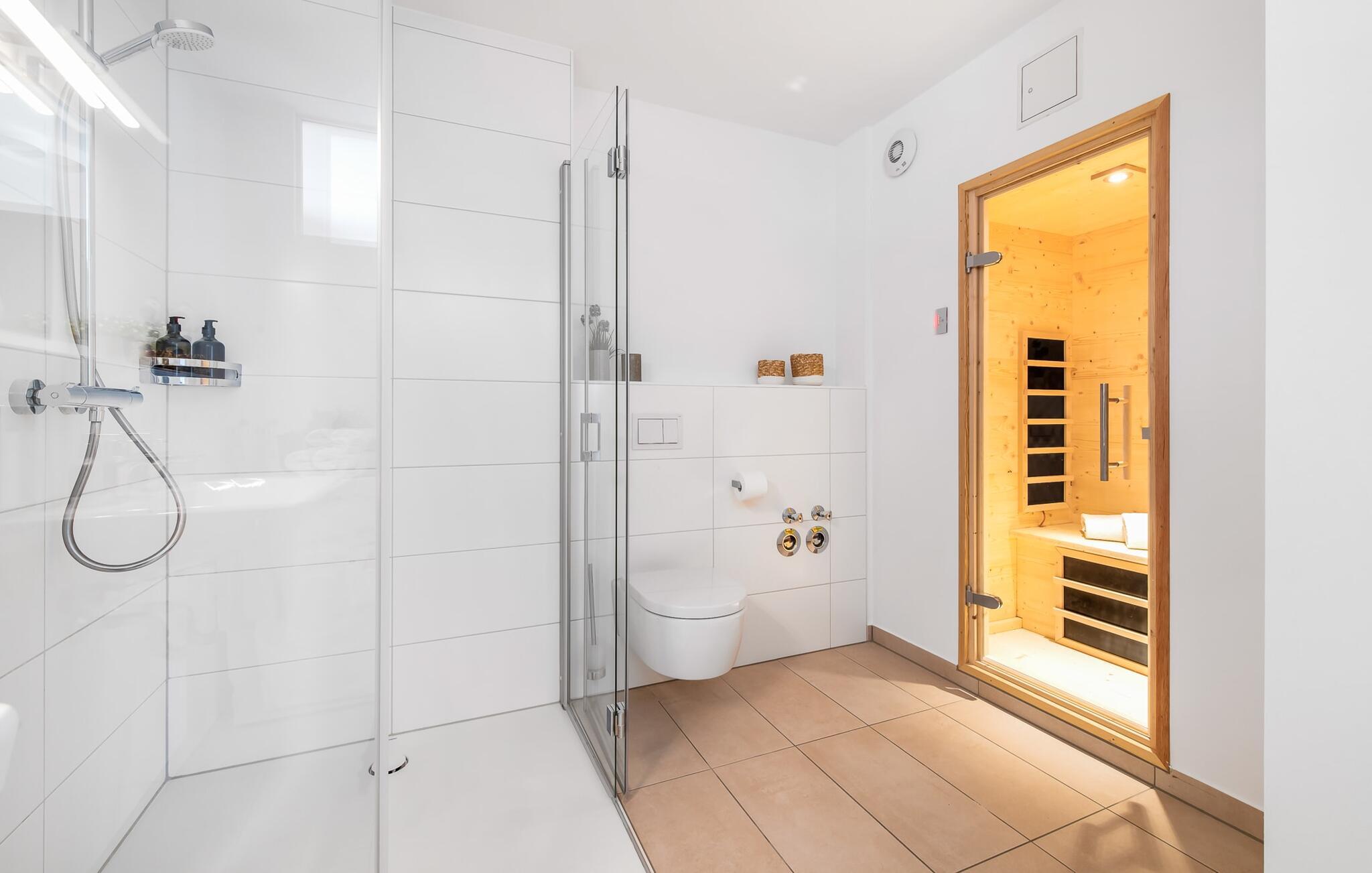 Das Duschbad mit bodengleicher Dusche und Infrarot-Sauna sorgt für unvergessliche Wellnessmomente und rundet den perfekten Urlaubstag ab.