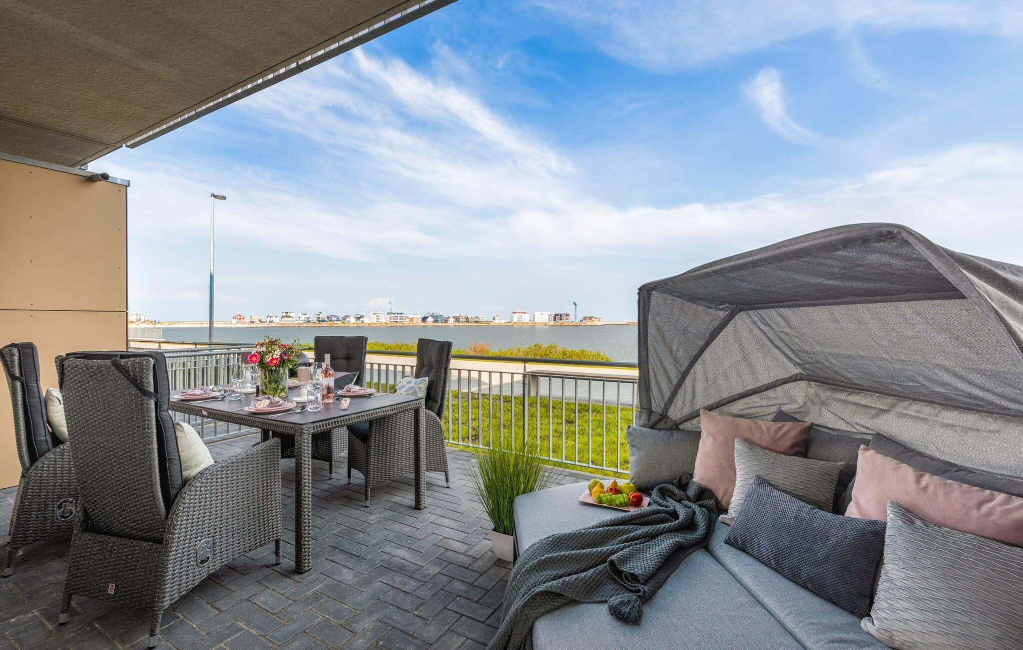 Lichtdurchflutet gestaltet sich der offene Wohn-/Essbereich mit seiner großen bodentiefen Fensterfront mit direktem Meerblick ein wahrer MEERCHENTRAUM! Die sehr großzügige daran angrenzende Terrasse ist, genau wie die Wohnung, hochwertig möbliert. Die gesamte Terrasse ist mit einem geschlossenen Geländer umrundet.