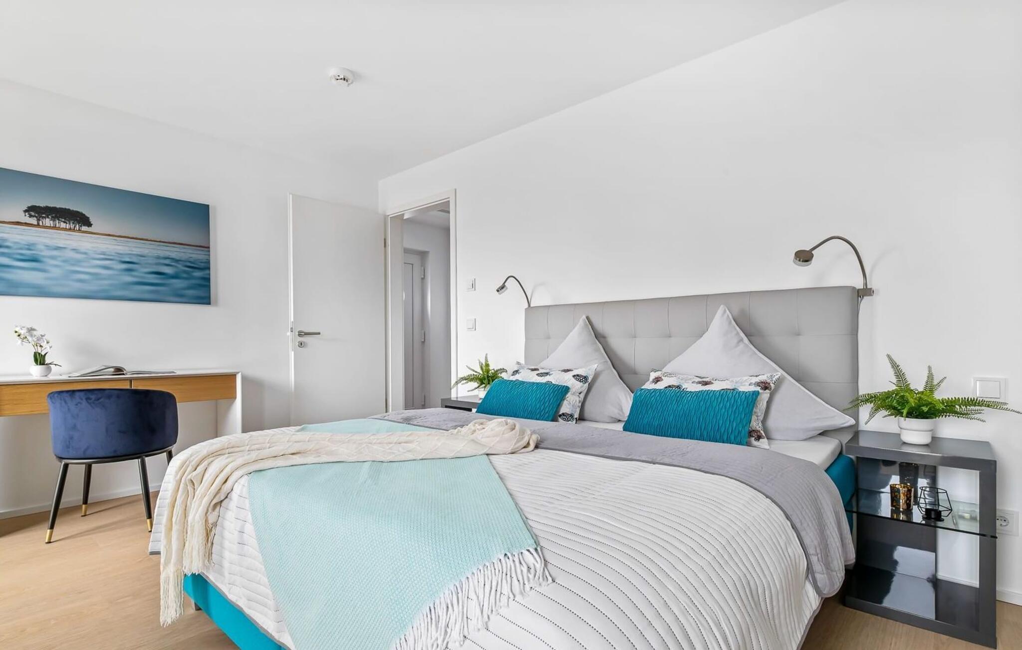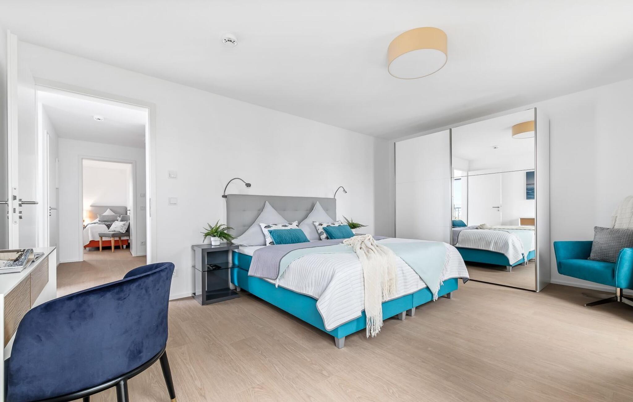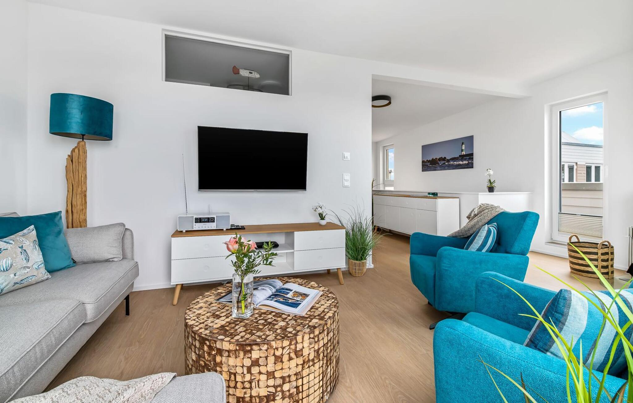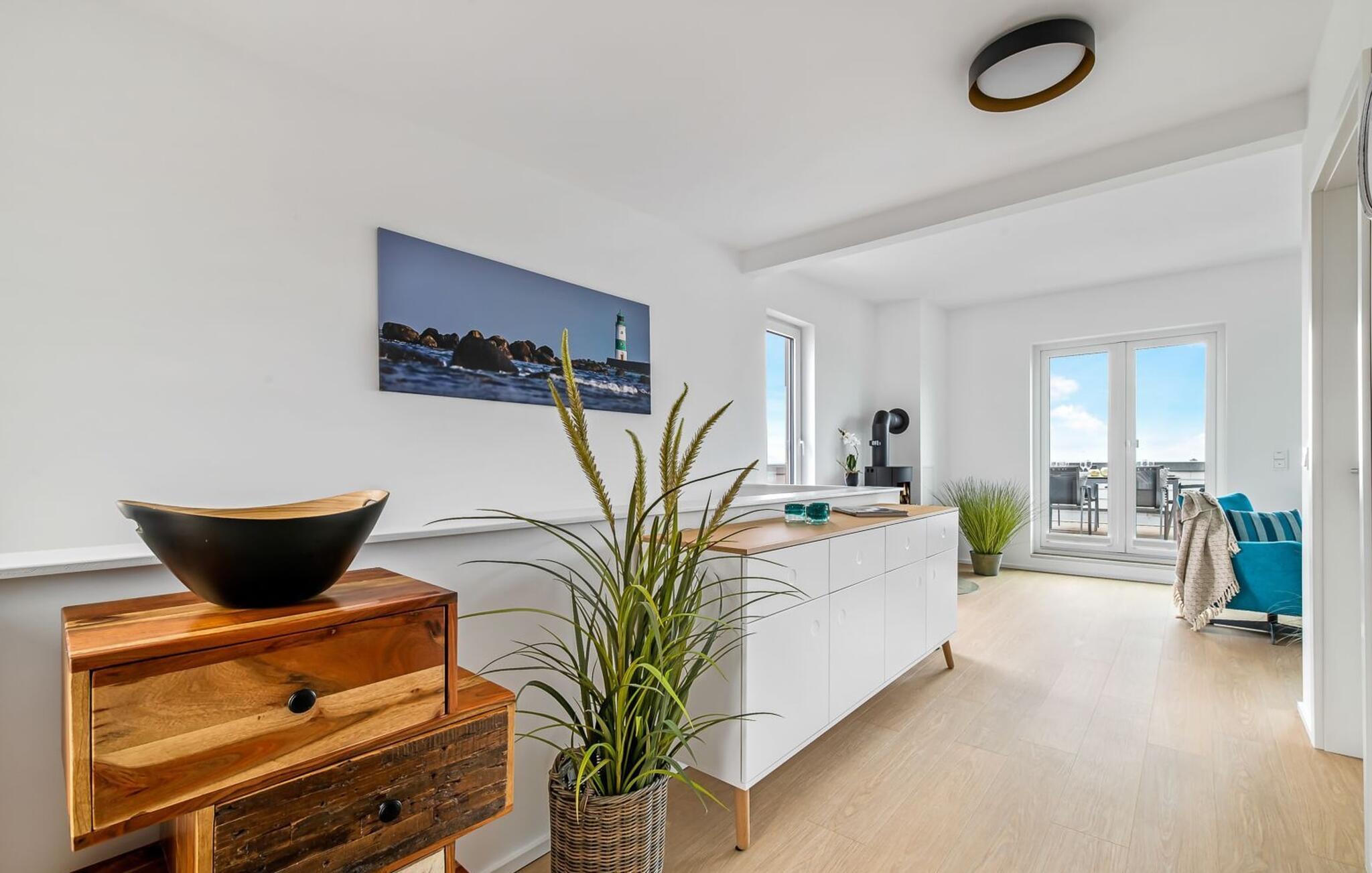 Im zweiten Obergeschoss angekommen, erwartet euch der exklusiv eingerichtete Wohnbereich mit maritimen Flair und bodentiefen Fensterfronten.