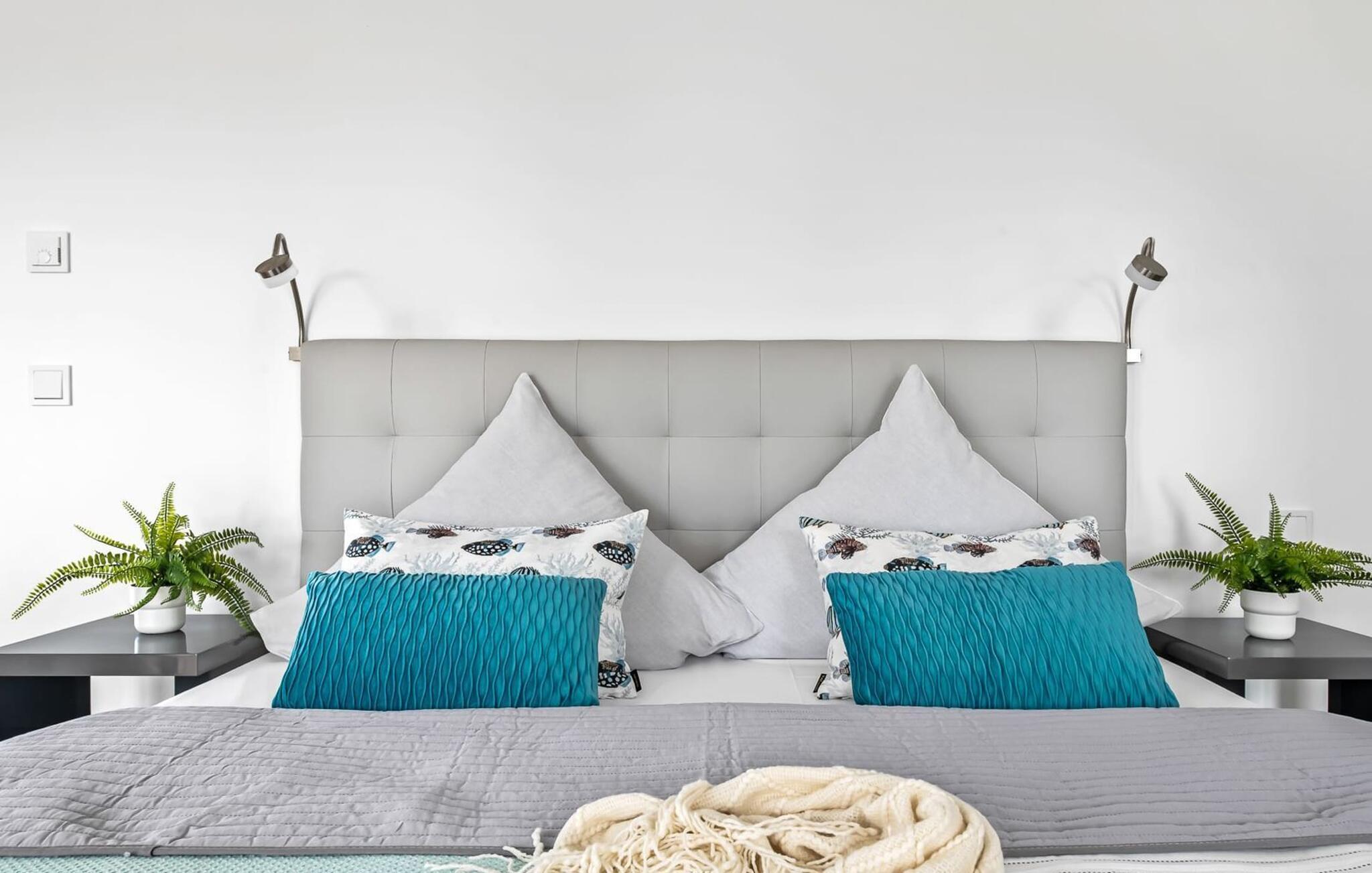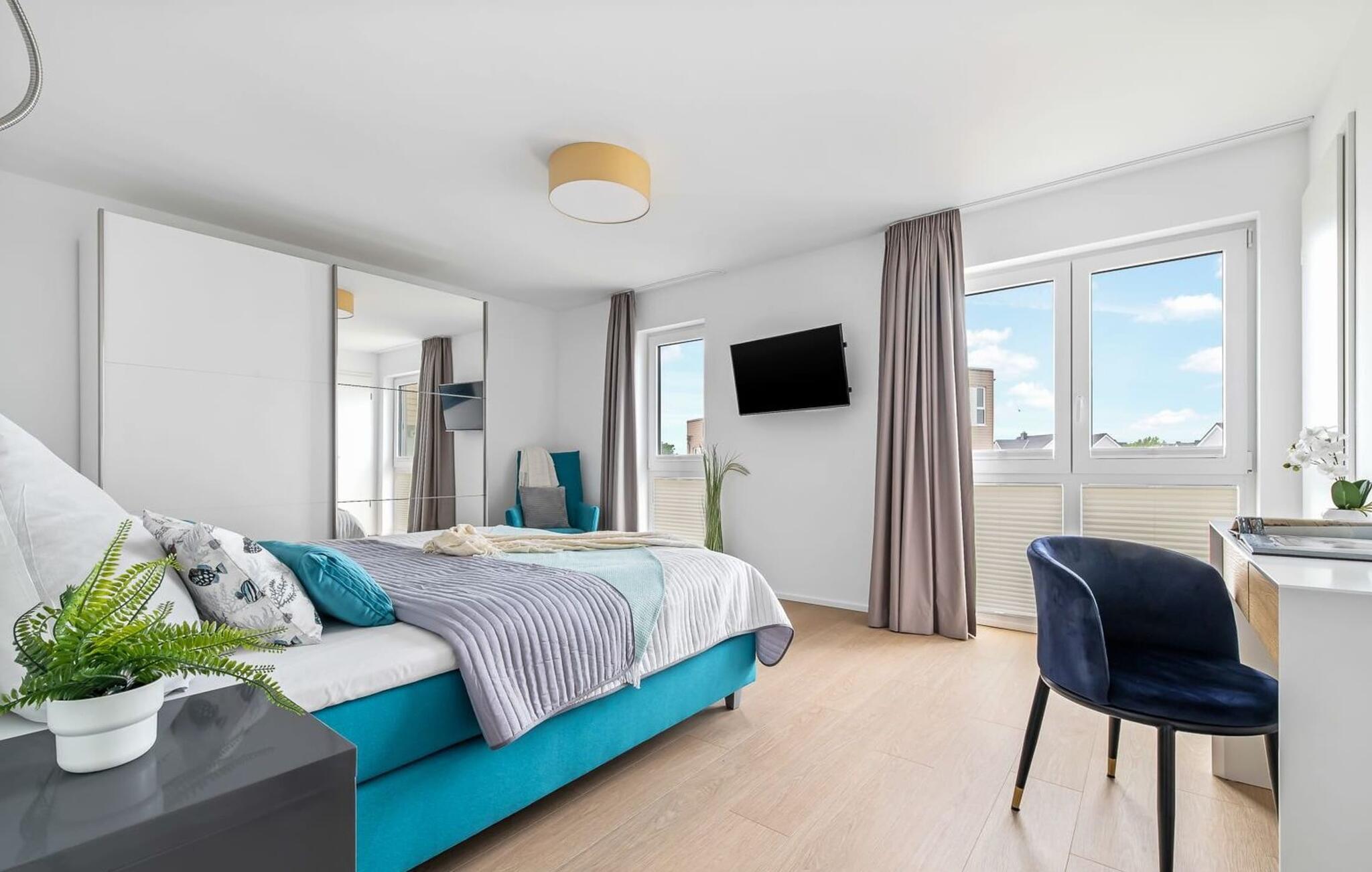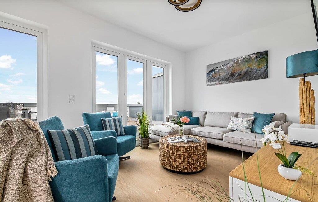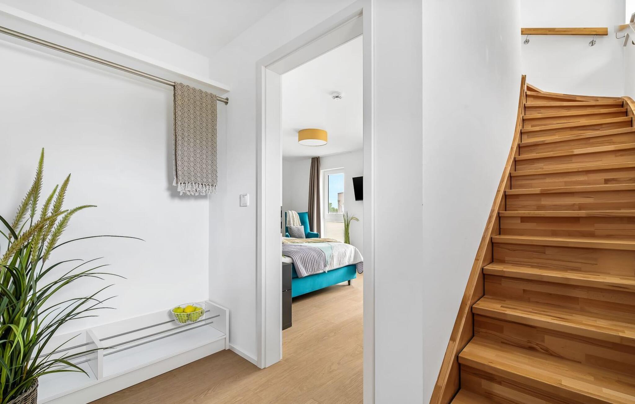 Im zweiten Obergeschoss angekommen, erwartet euch der exklusiv eingerichtete Wohnbereich mit maritimen Flair und bodentiefen Fensterfronten.