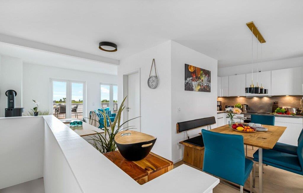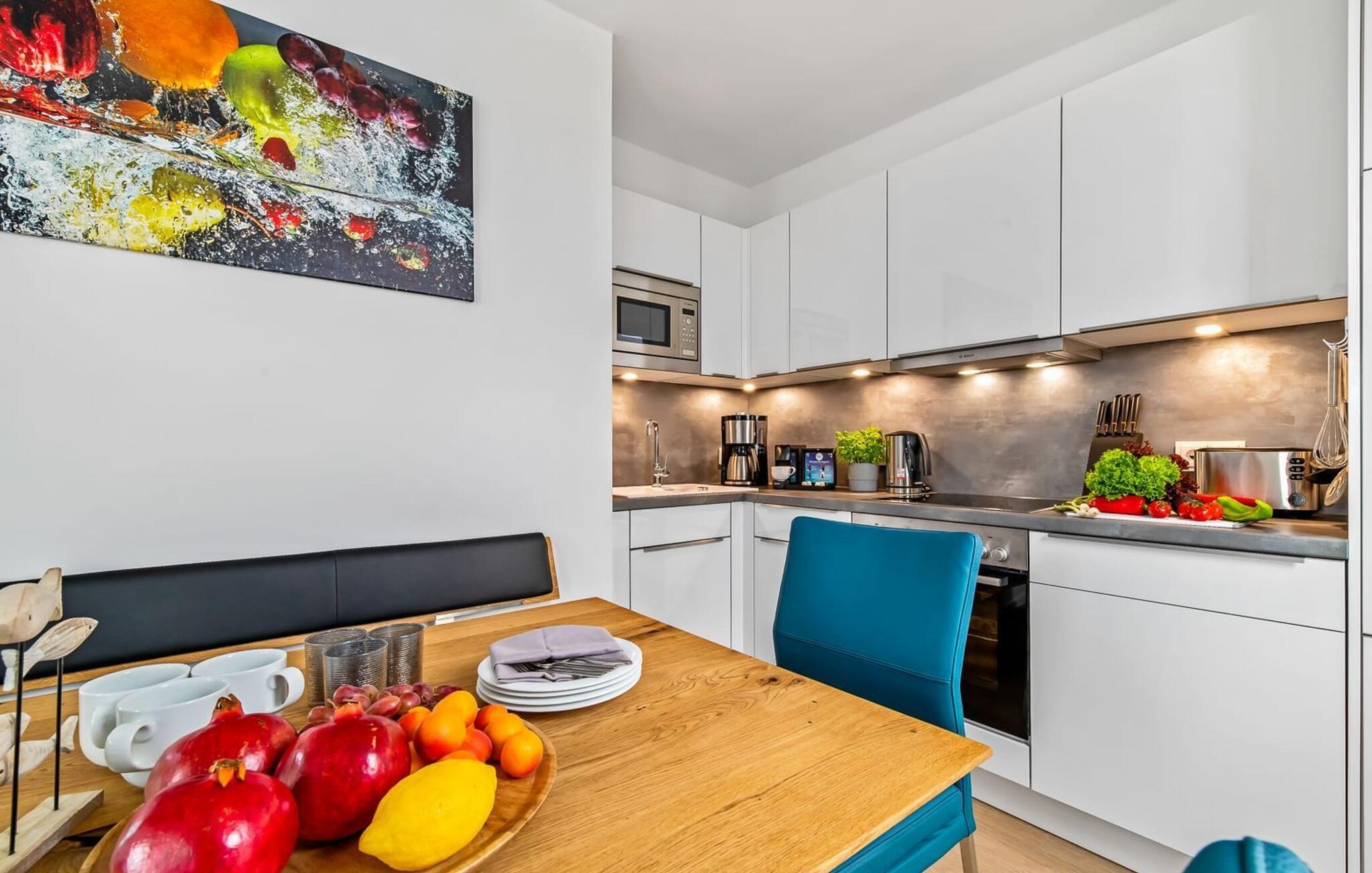 Die moderne, offene Küche mit gemütlichem Essbereich ist rundum ausgestattet und lässt Hobbykoch-Herzen höher schlagen. Hier habt ihr Platz für kulinarische Ausflüge.