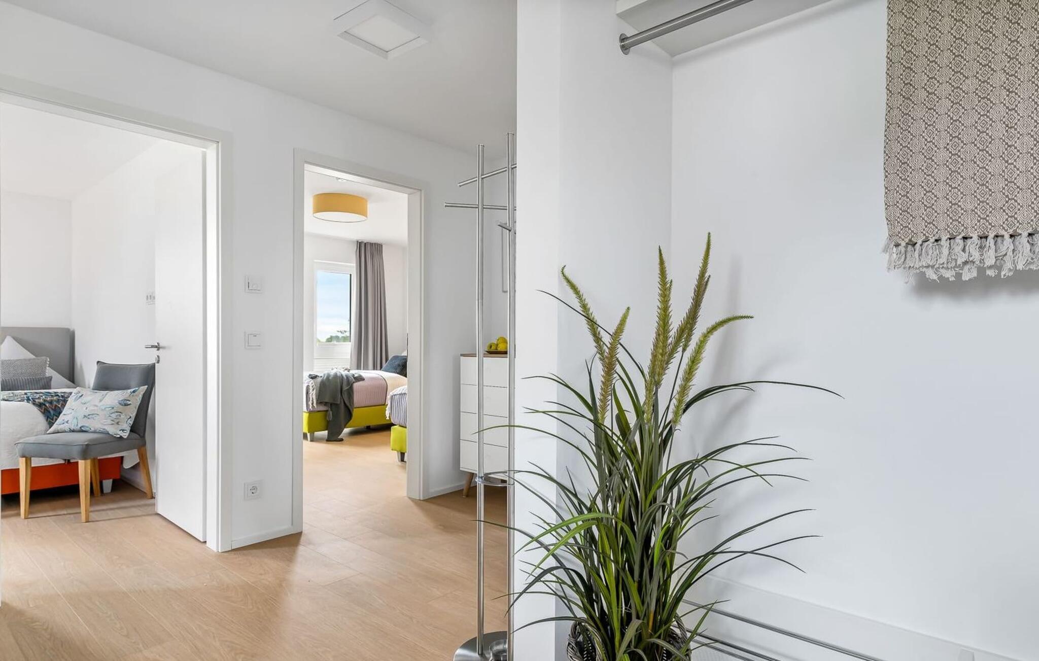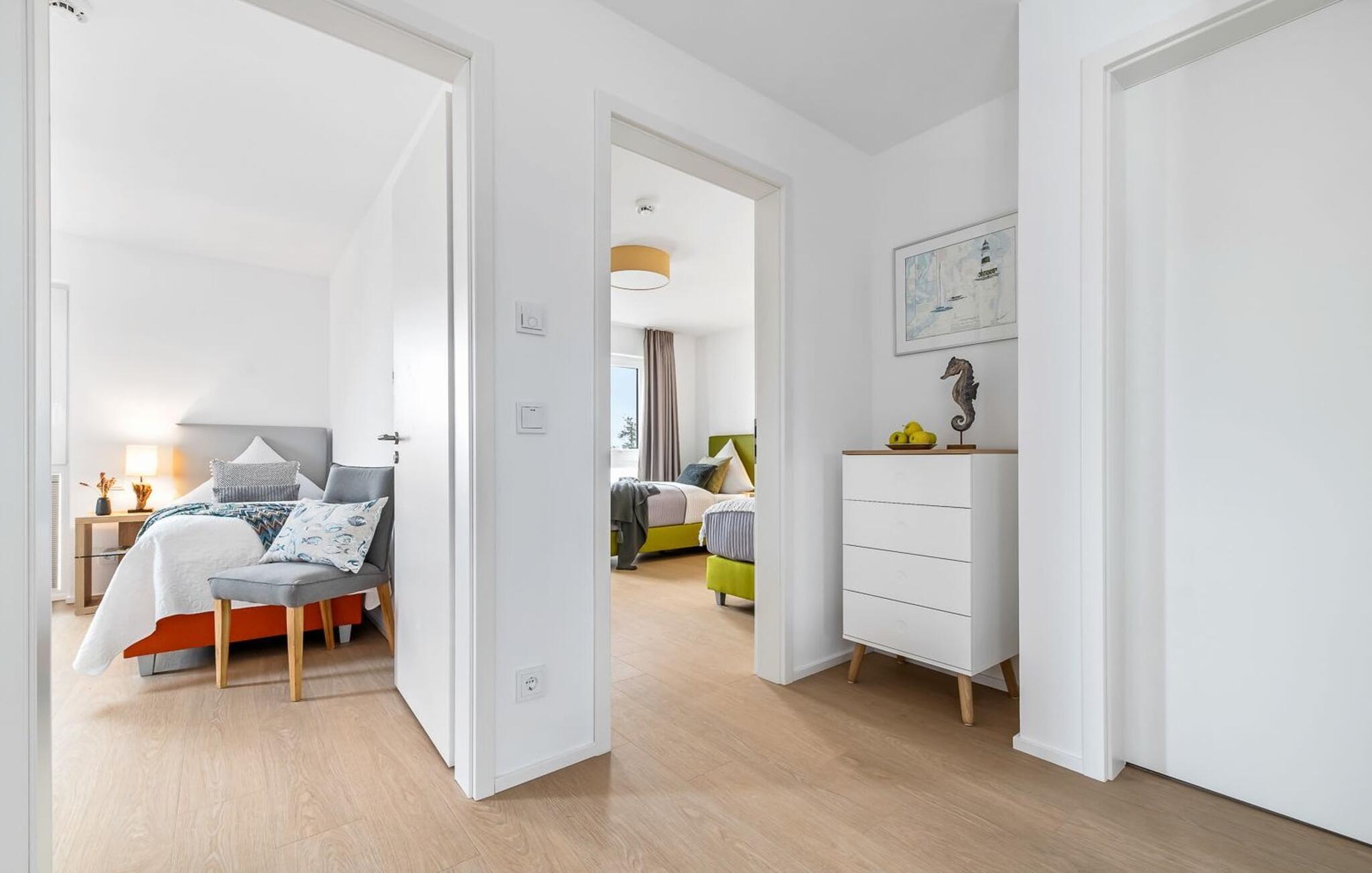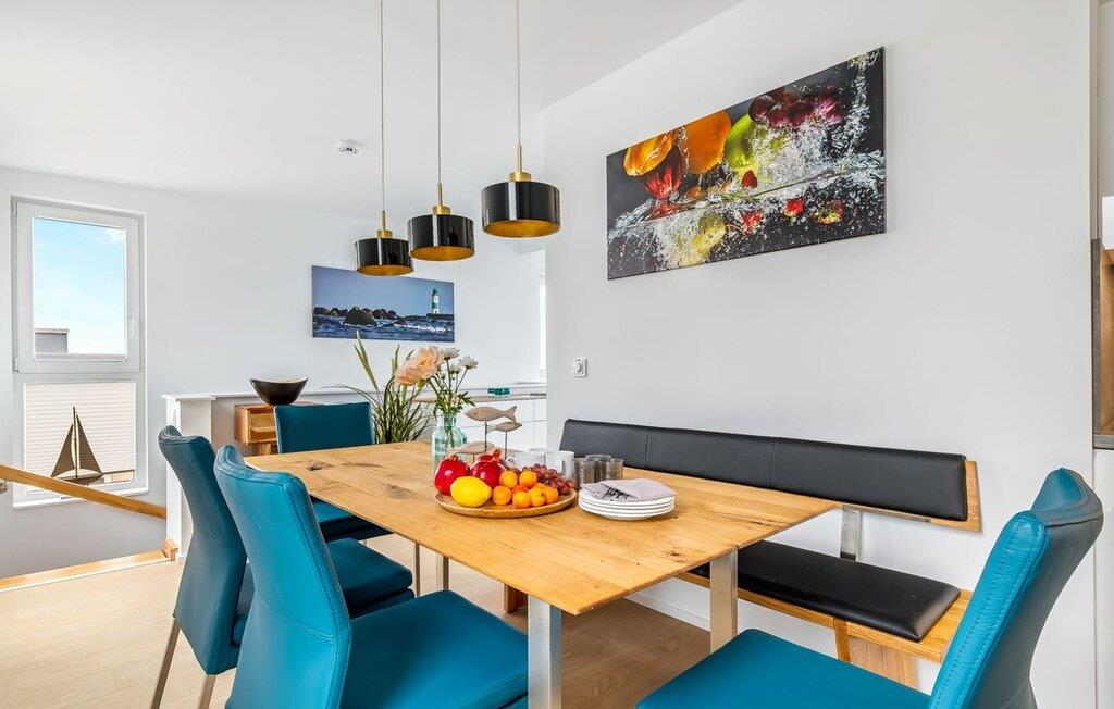 Die großzügige Maisonette-Ferienwohnung Meeresleuchten für 6 Personen in ruhiger Lage am Rande des Resorts liegt im ersten und zweiten Obergeschoss und überzeugt mit ihrer stilvollen und hochwertigen Einrichtung. Besonderer Wert wurde hierbei auf Kunstfotos und Bilder regionaler Künstler gelegt, die das bezaubernde Flair der Schleiregion wiedergeben.