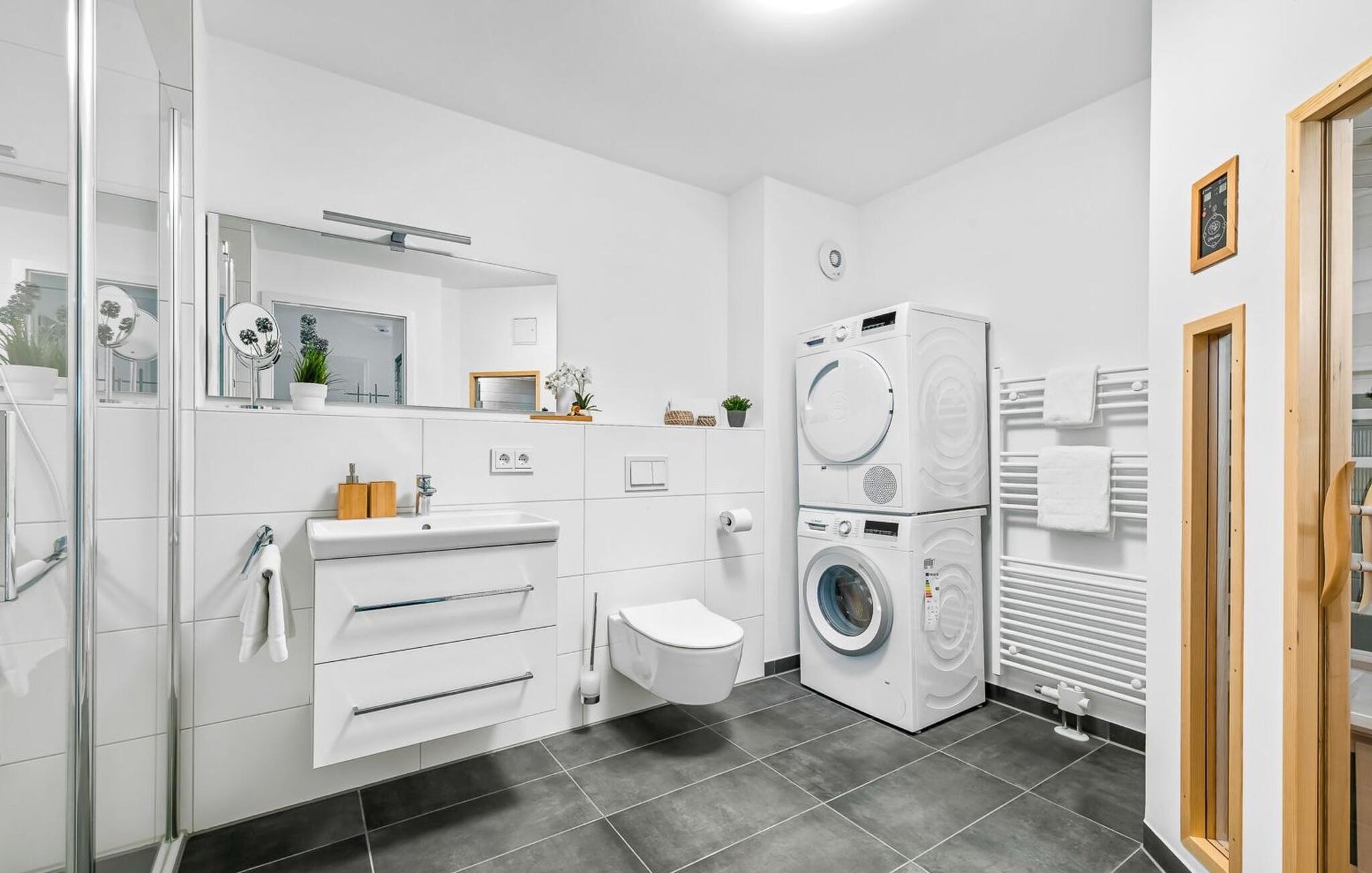 Ebenfalls auf dieser Etage befindet sich eure ganz eigene Wohlfühl-Oase mit bodengleicher Regen-Dusche und Infrarot-Sauna.