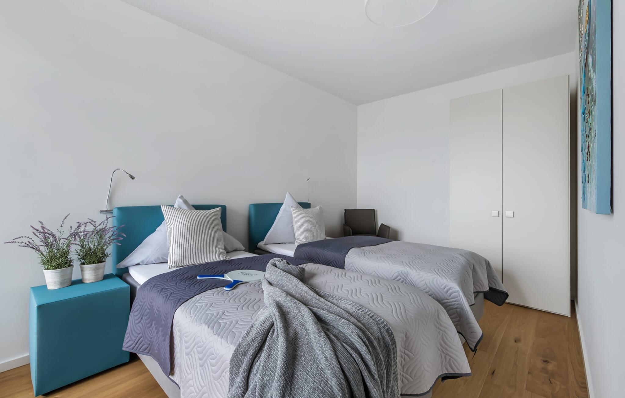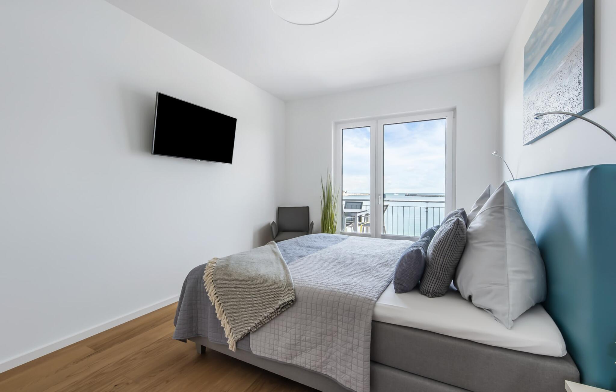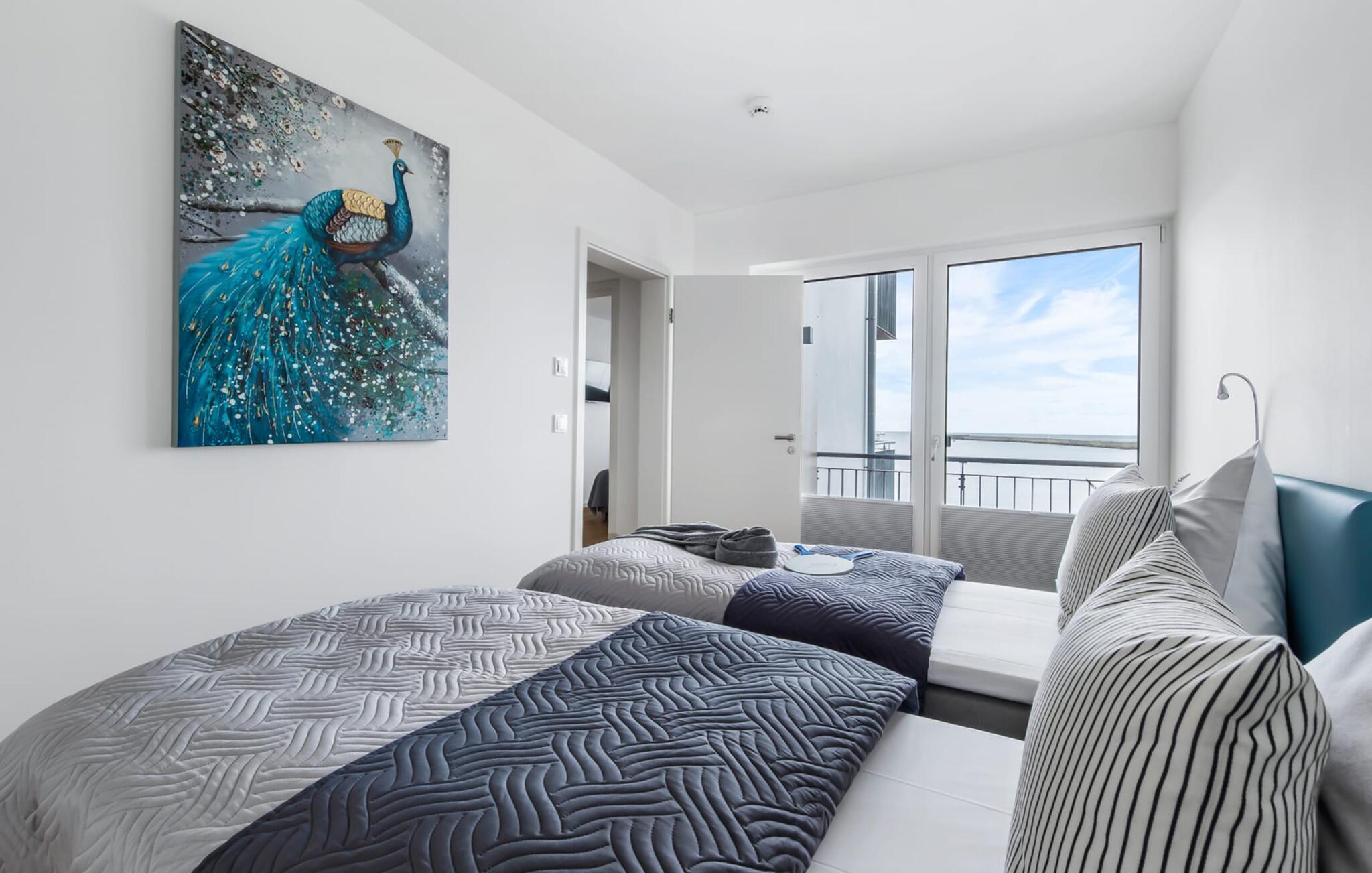 Die beiden Schlafzimmer sind jeweils mit Boxspringbetten ausgestattet. Ihr könnt wählen zwischen dem Doppelbett mit angrenzendem Balkon und phänomenalem Meerblick und dem zweiten Schlafzimmer mit zwei Einzelbetten ebenfalls mit vollem Meerblick. Auch hier habt ihr bodentiefe Fensterelemente für einen Ausblick im Liegen.