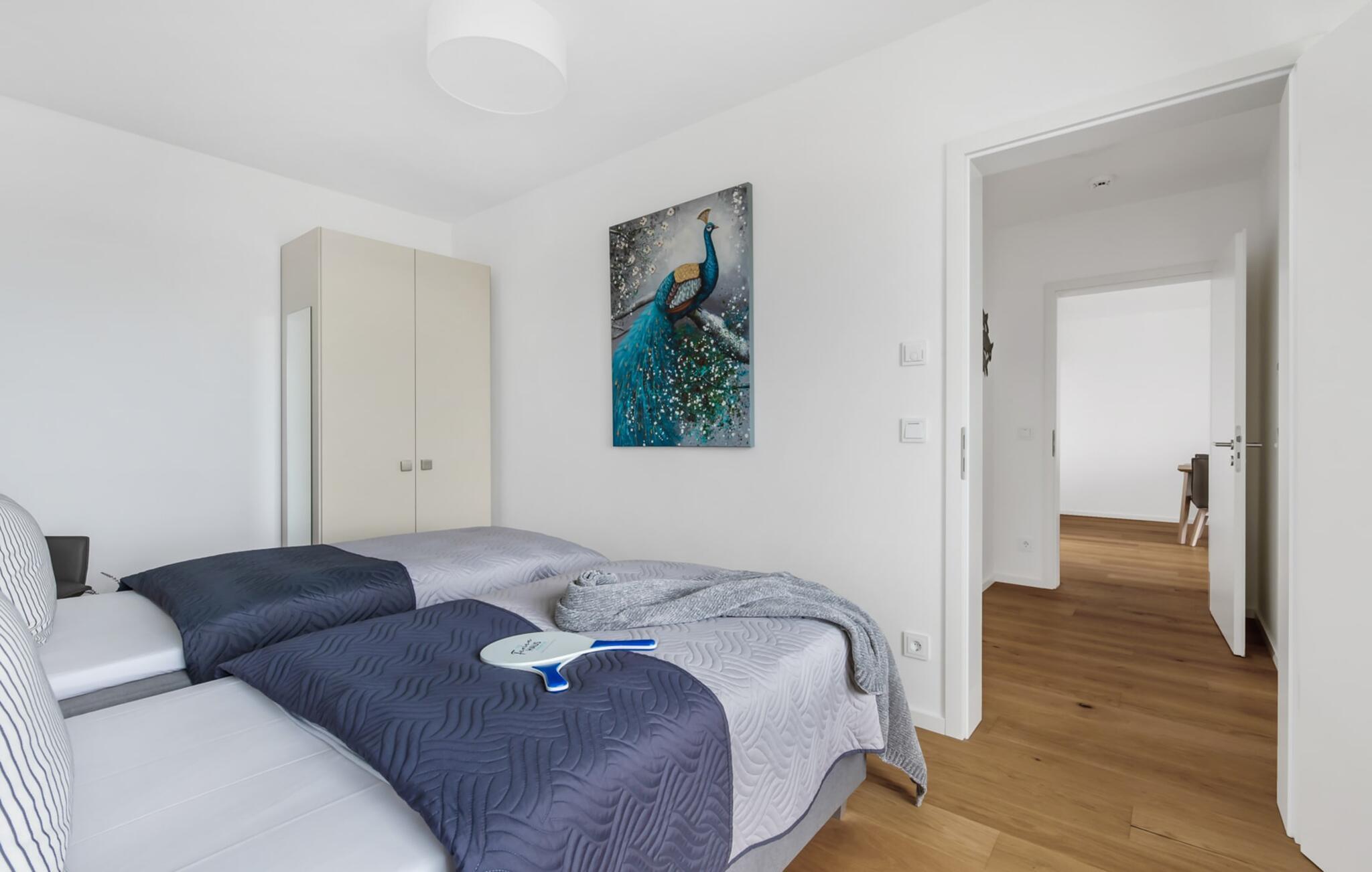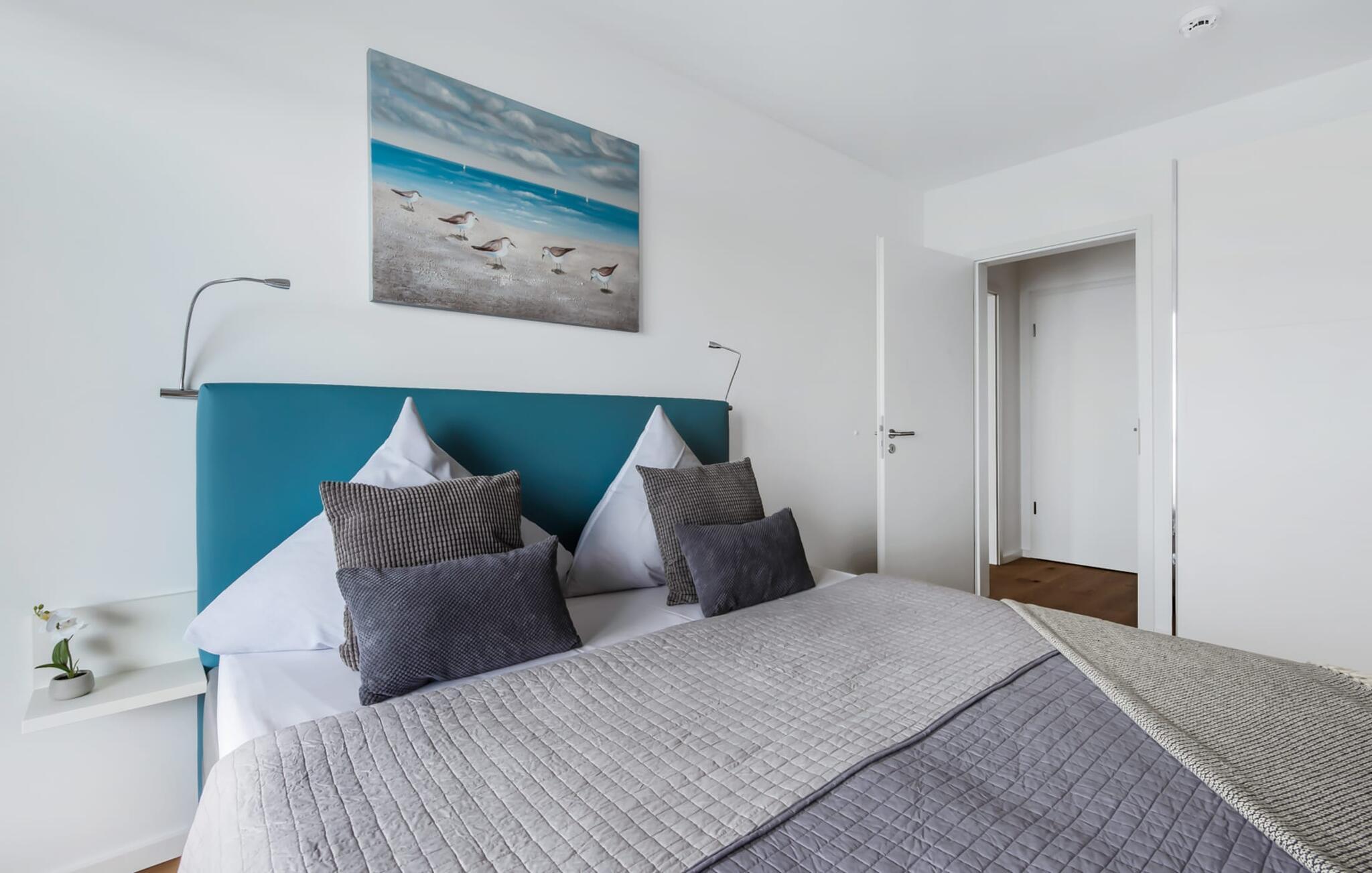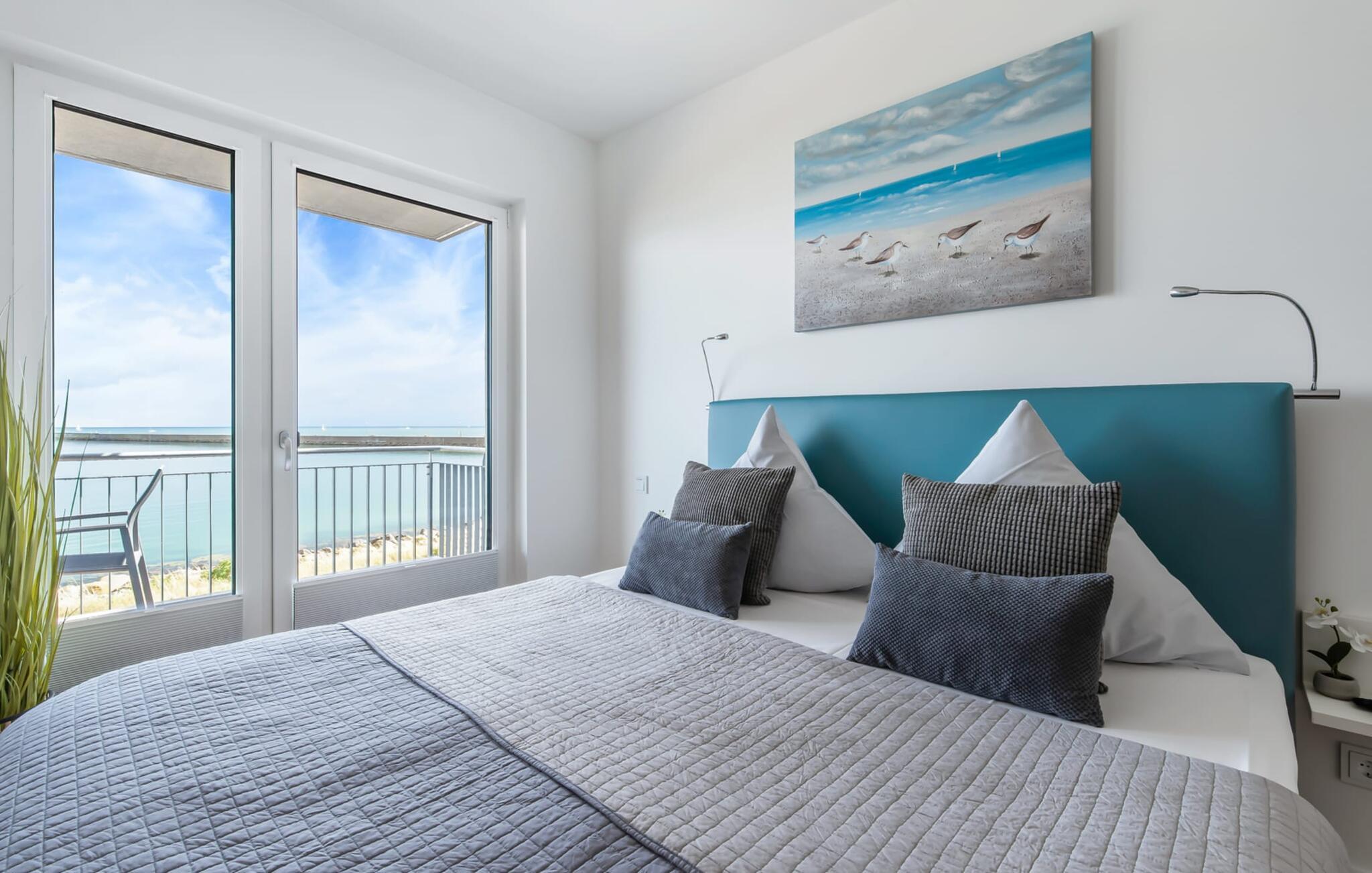 Die beiden Schlafzimmer sind jeweils mit Boxspringbetten ausgestattet. Ihr könnt wählen zwischen dem Doppelbett mit angrenzendem Balkon und phänomenalem Meerblick und dem zweiten Schlafzimmer mit zwei Einzelbetten ebenfalls mit vollem Meerblick. Auch hier habt ihr bodentiefe Fensterelemente für einen Ausblick im Liegen.