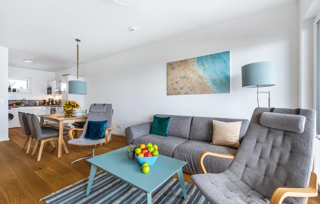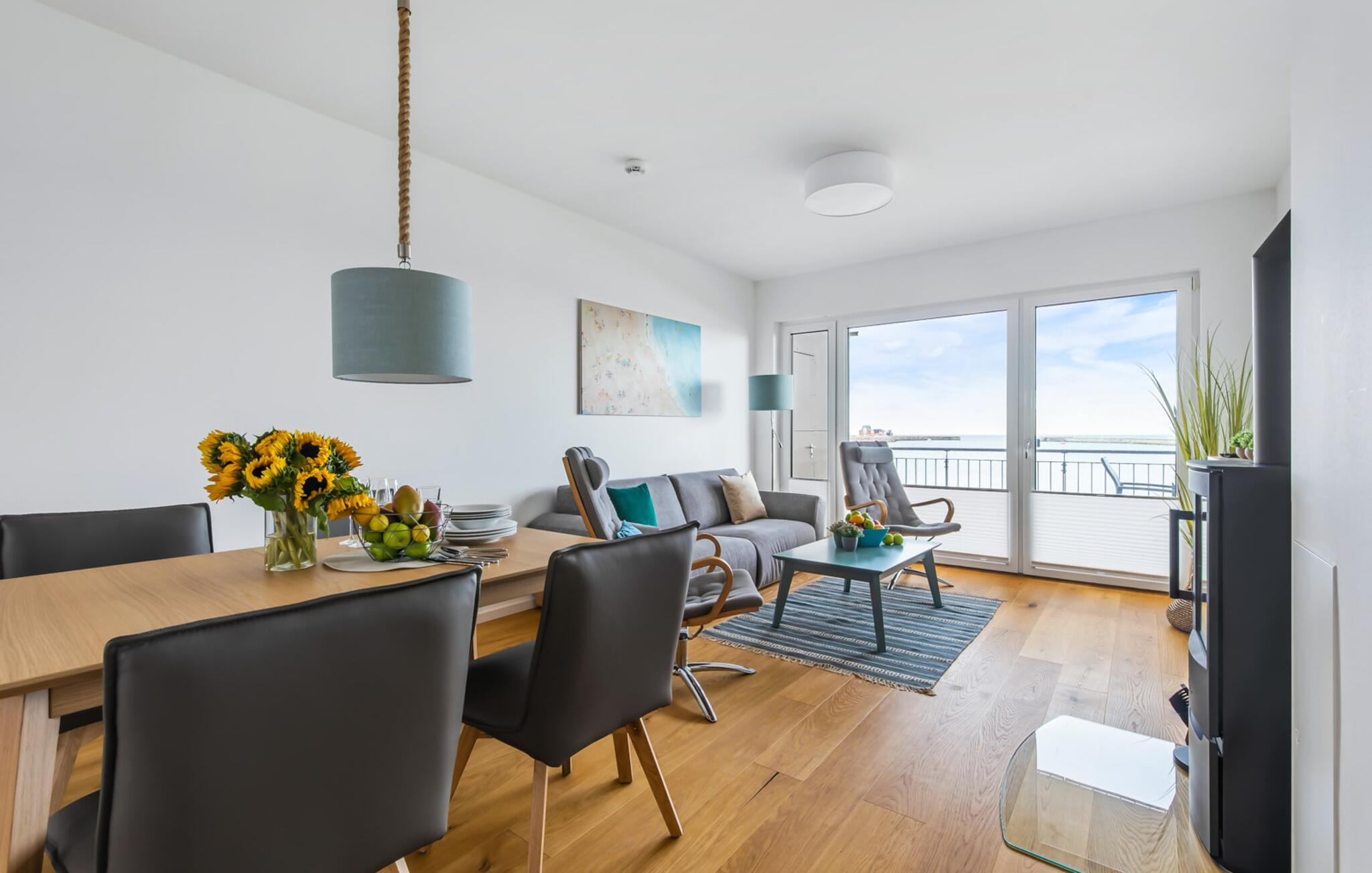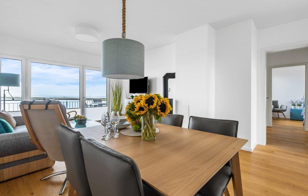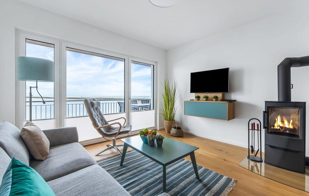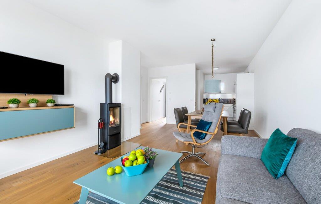 Modern und elegant, in zarten Farben und Holztönen eingerichtet, strahlt der offene Wohn- und Essbereich eurer Ferienwohnung euch entgegen. Ein Fernseher und der Kaminofen sorgen für abwechslungsreiches Programm, wenn ihr mal nicht mehr durch die bodentiefen Fenster auf's Wasser schauen möchtet. Das bequeme Sofa lässt sich mit nur wenigen Handgriffen zu einem Schlafplatz für zwei weitere Gäste umbauen.