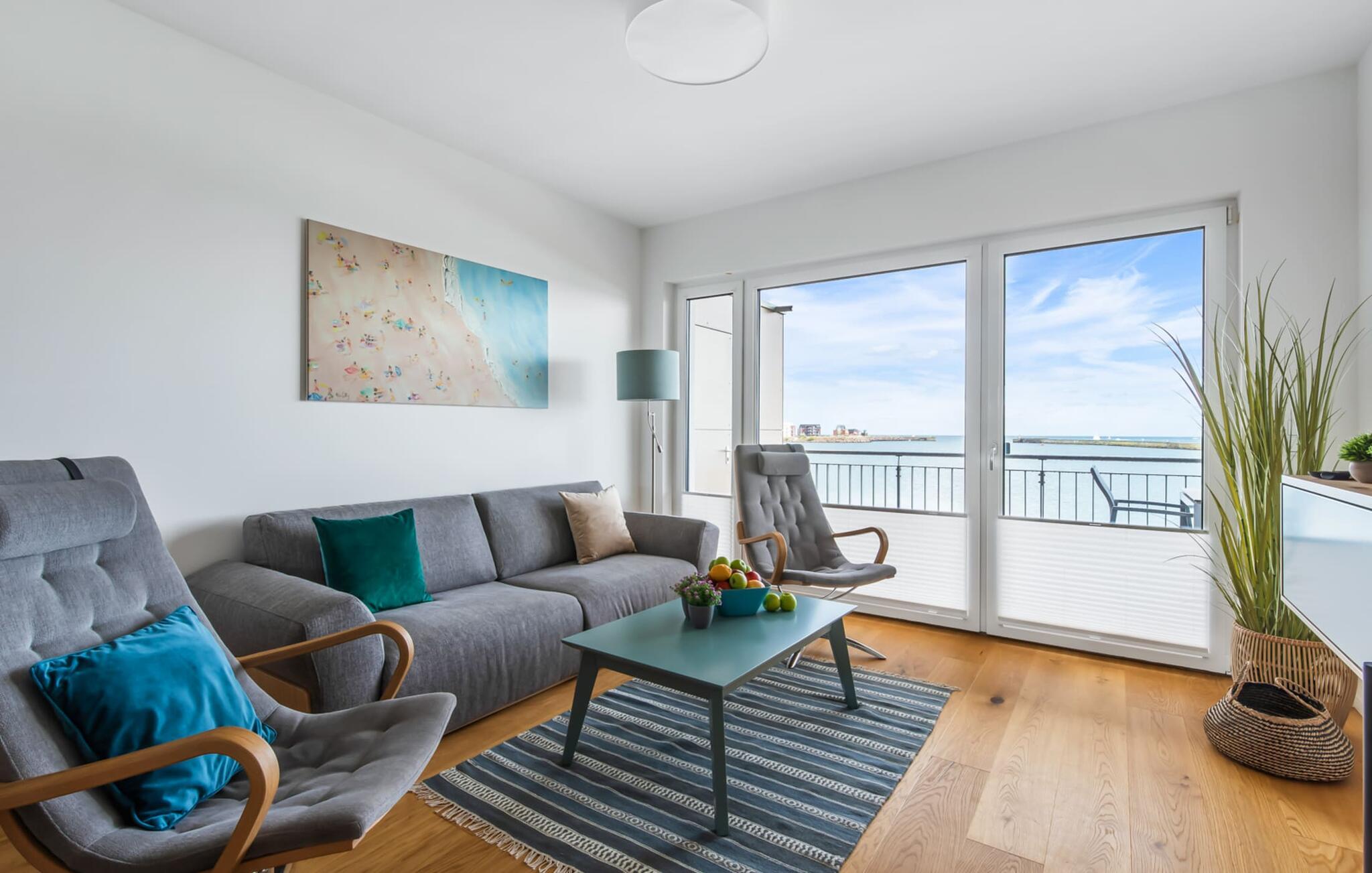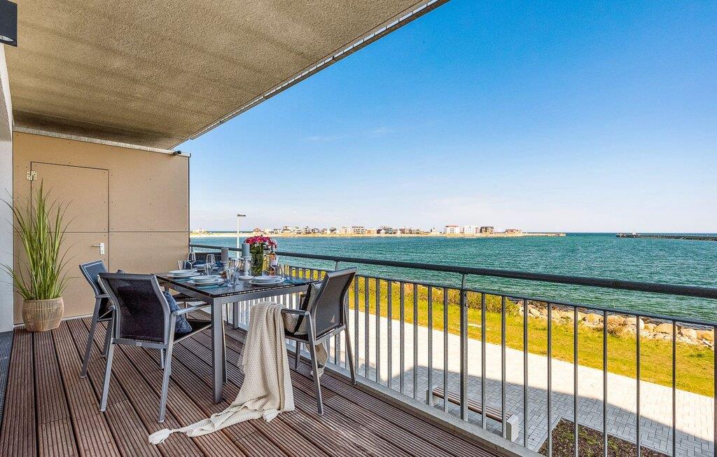 Vom gesamten Wohn- und Essbereich habt ihr einen atemberaubenden Blick auf die Ostsee und die Marina vom Ostseeresort Olpenitz. Ihr könnt Schiffe und Segelboote beim Ausfahren in die Ostsee beobachten. Das ist ein Ausblick, der kaum zu toppen ist!