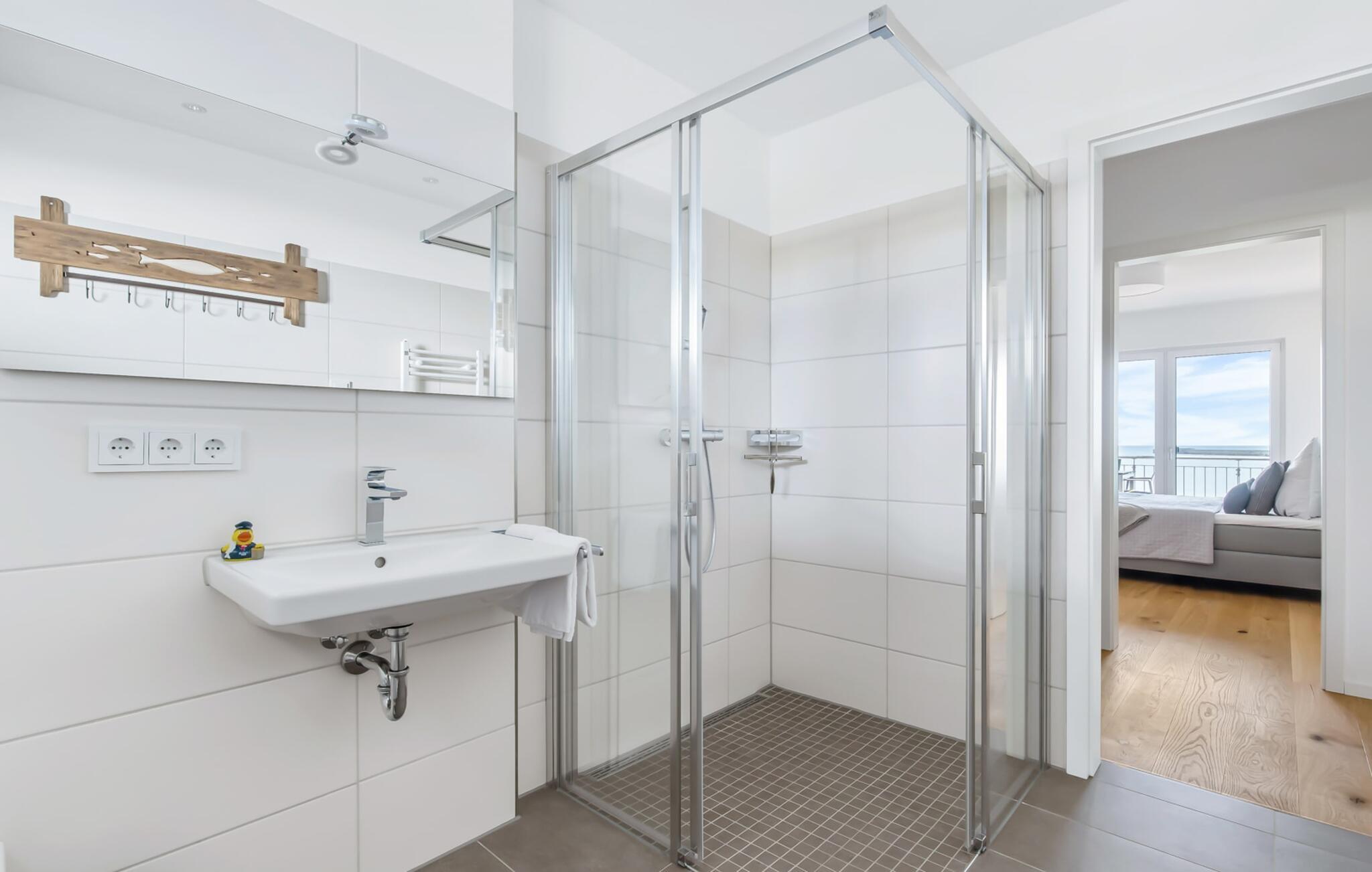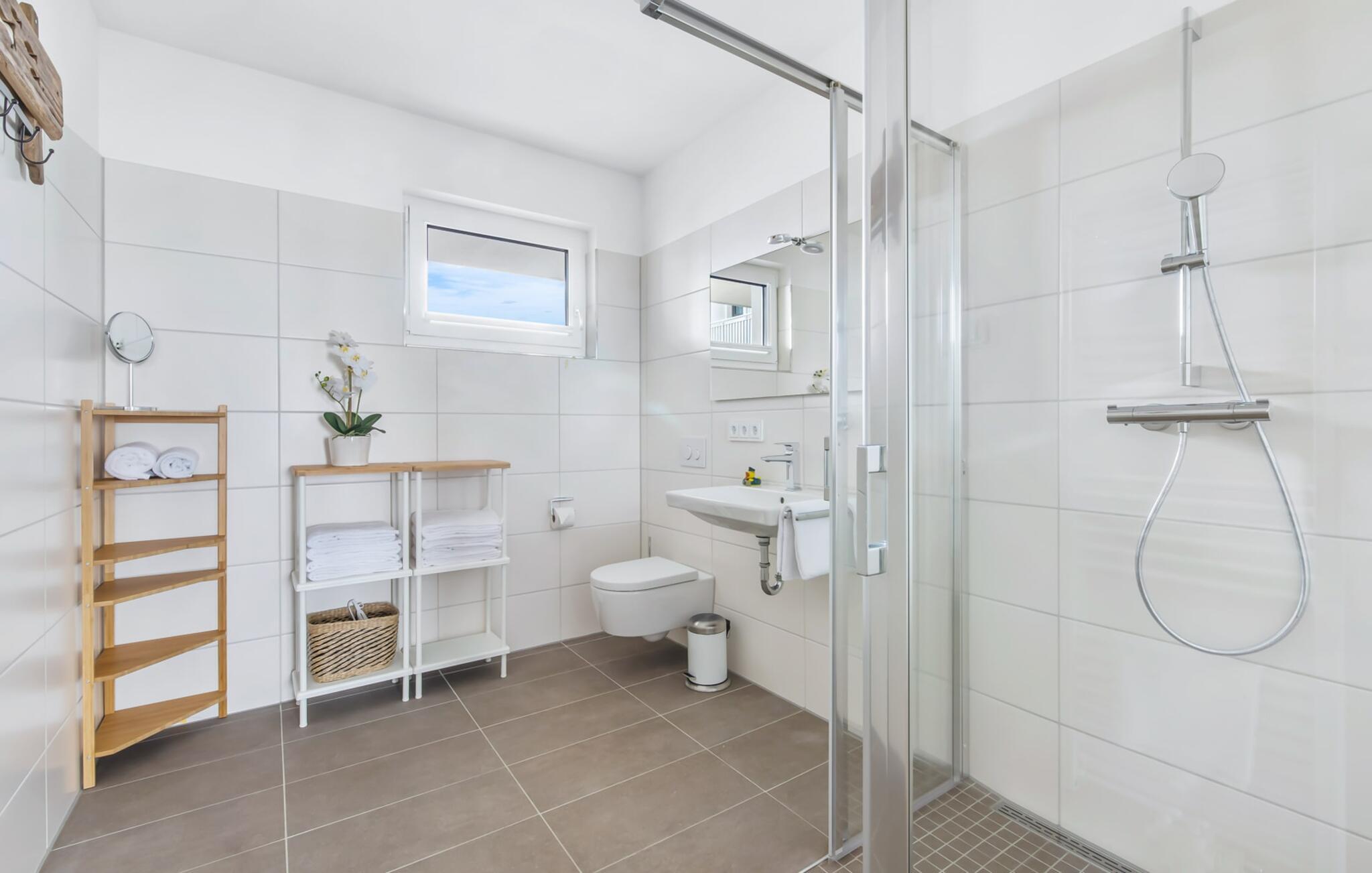 Das Bad ist großzügig und modern und mit bodengleicher Dusche ausgestattet.