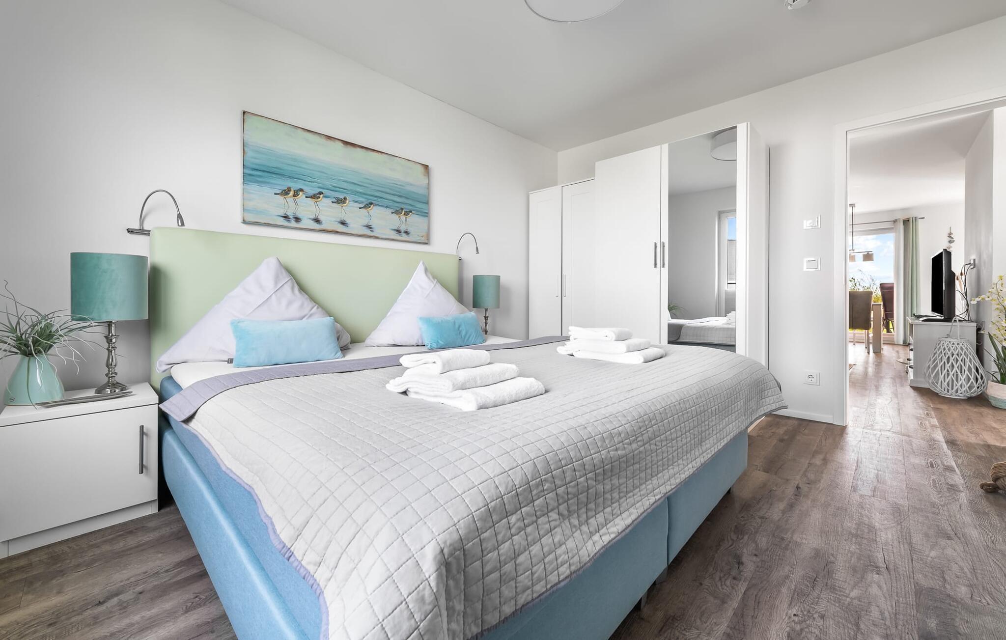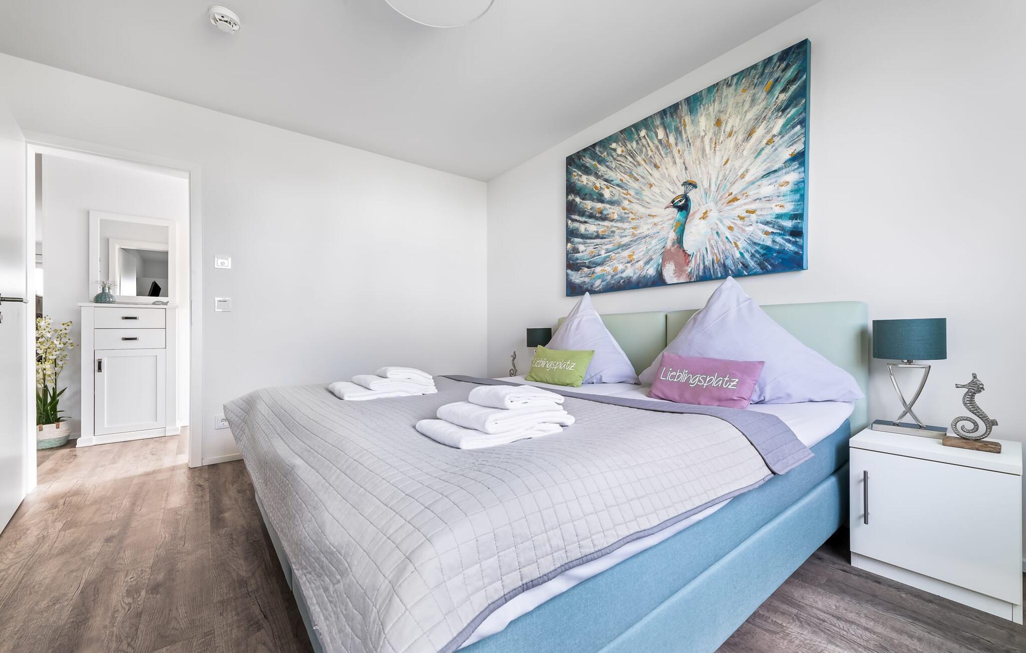 Nach einem erfolgreichen Urlaubstag möchtet ihr Ruhe und Erholung? Die Wohnung verfügt über ein Schlafzimmer mit Doppelboxspringbett sowie ein Schlafzimmer mit zwei Einzelboxspringbetten. In den verdunkelbaren Zimmern lässt es sich nach Belieben schlummern und träumen. Beide Schlafzimmer sind mit einem TV ausgestattet.