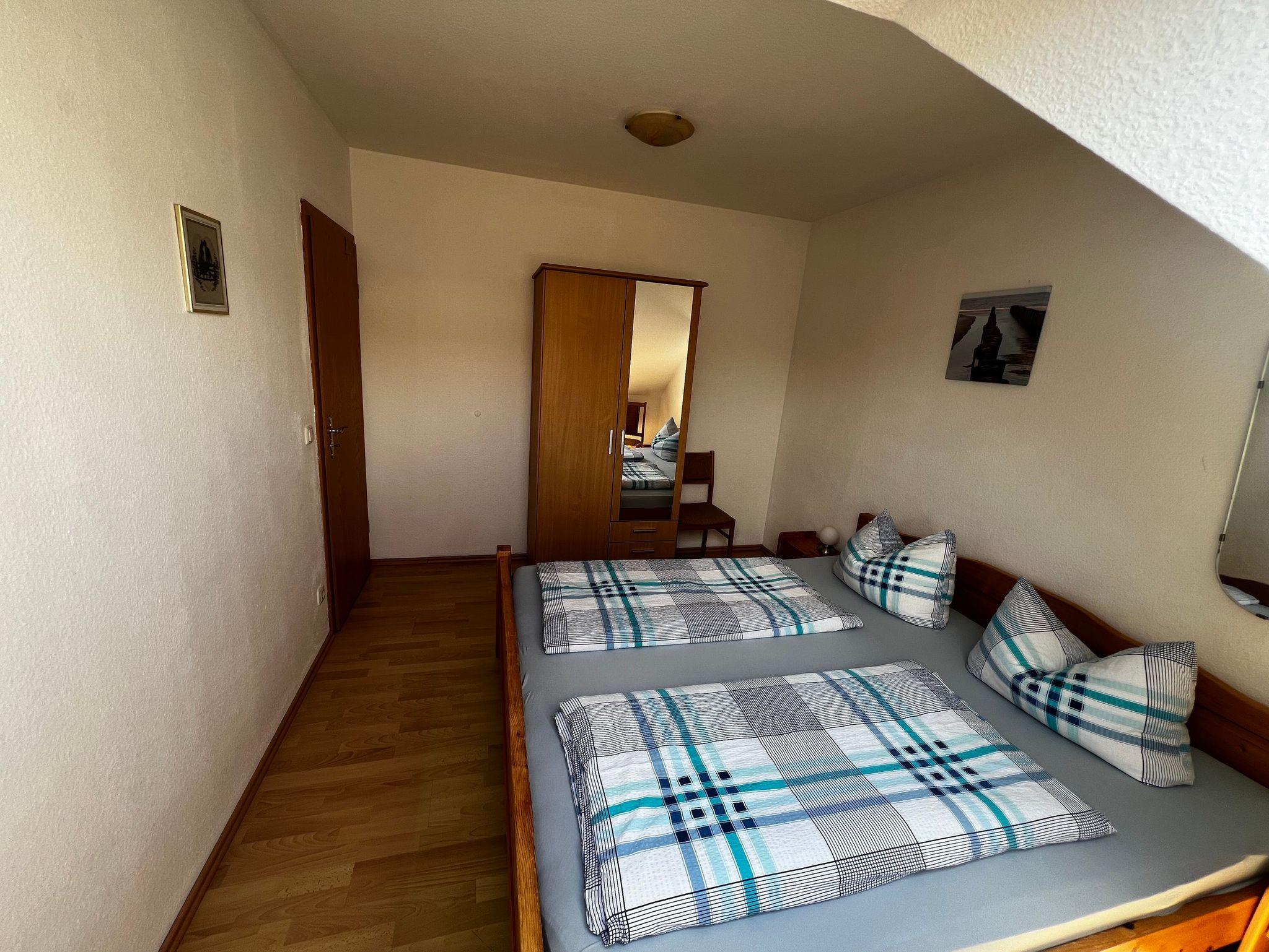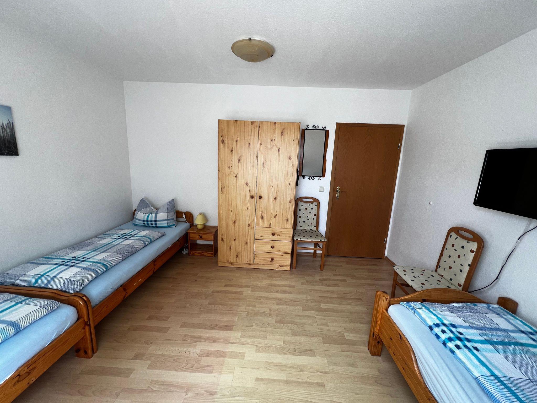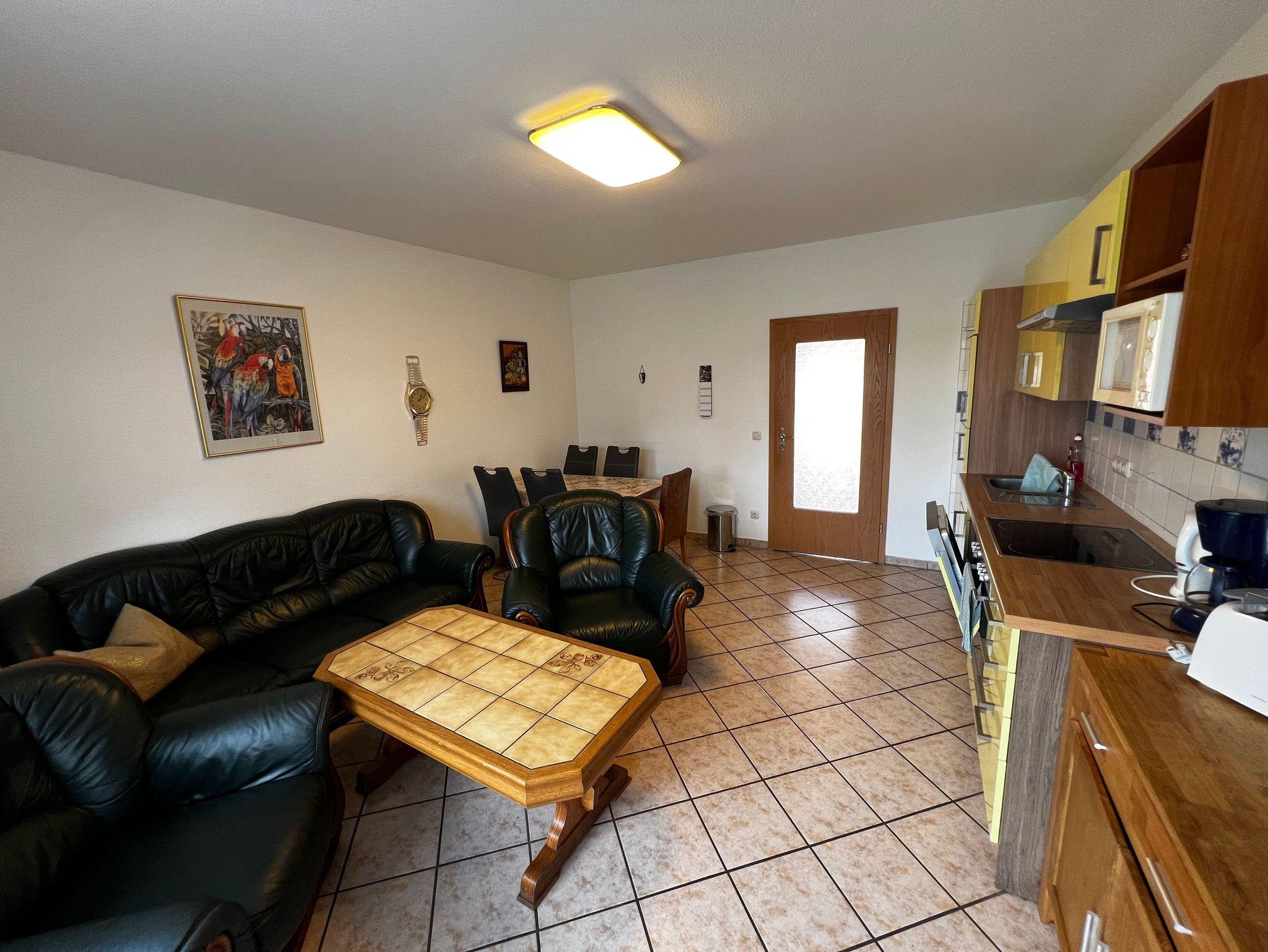 FeWo für max. 5 Personen, ca. 65 m², auf 2 Etagen, separater Eingang, im EG Wohnraum mit Essecke und Kochnische, Dusche, WC, im OG 2 Schlafräume, Sat-TV, möblierte Terrasse,