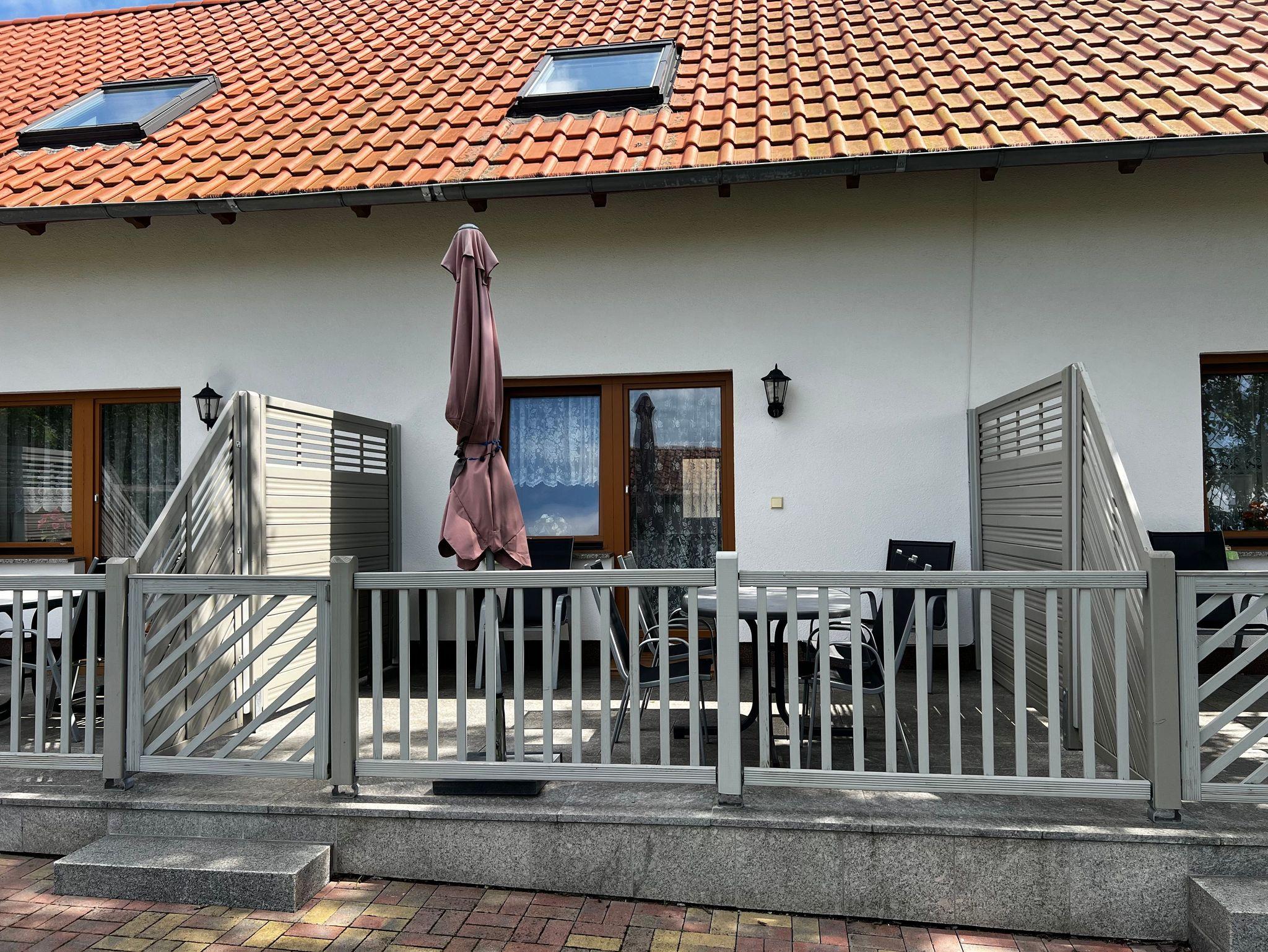 Moderne Ferienwohnung in Mellenthin mit separatem Eingang, offener Küche und möblierter Terrasse für entspannte Urlaubstage.