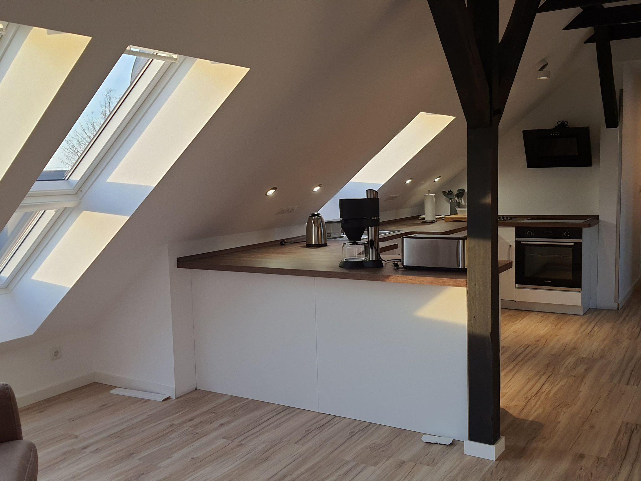 auf den Balkon gelangen können, und einer offenen Küche mit Essecke.