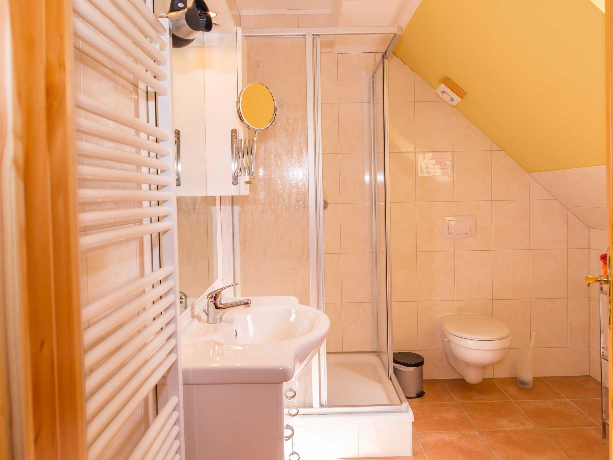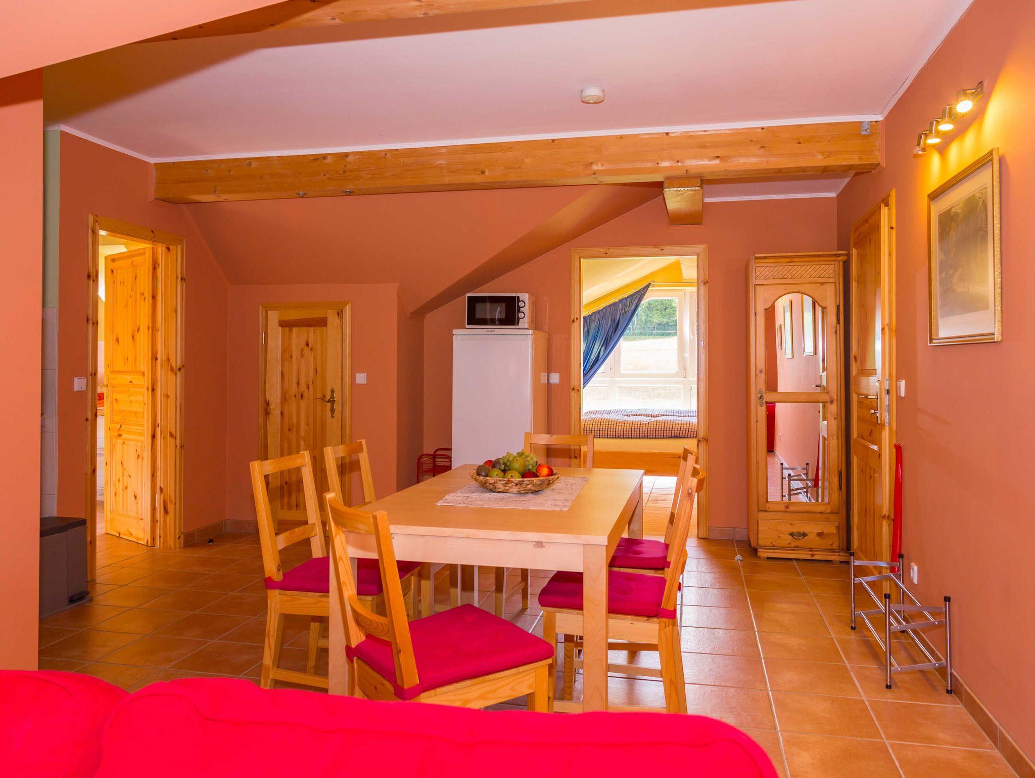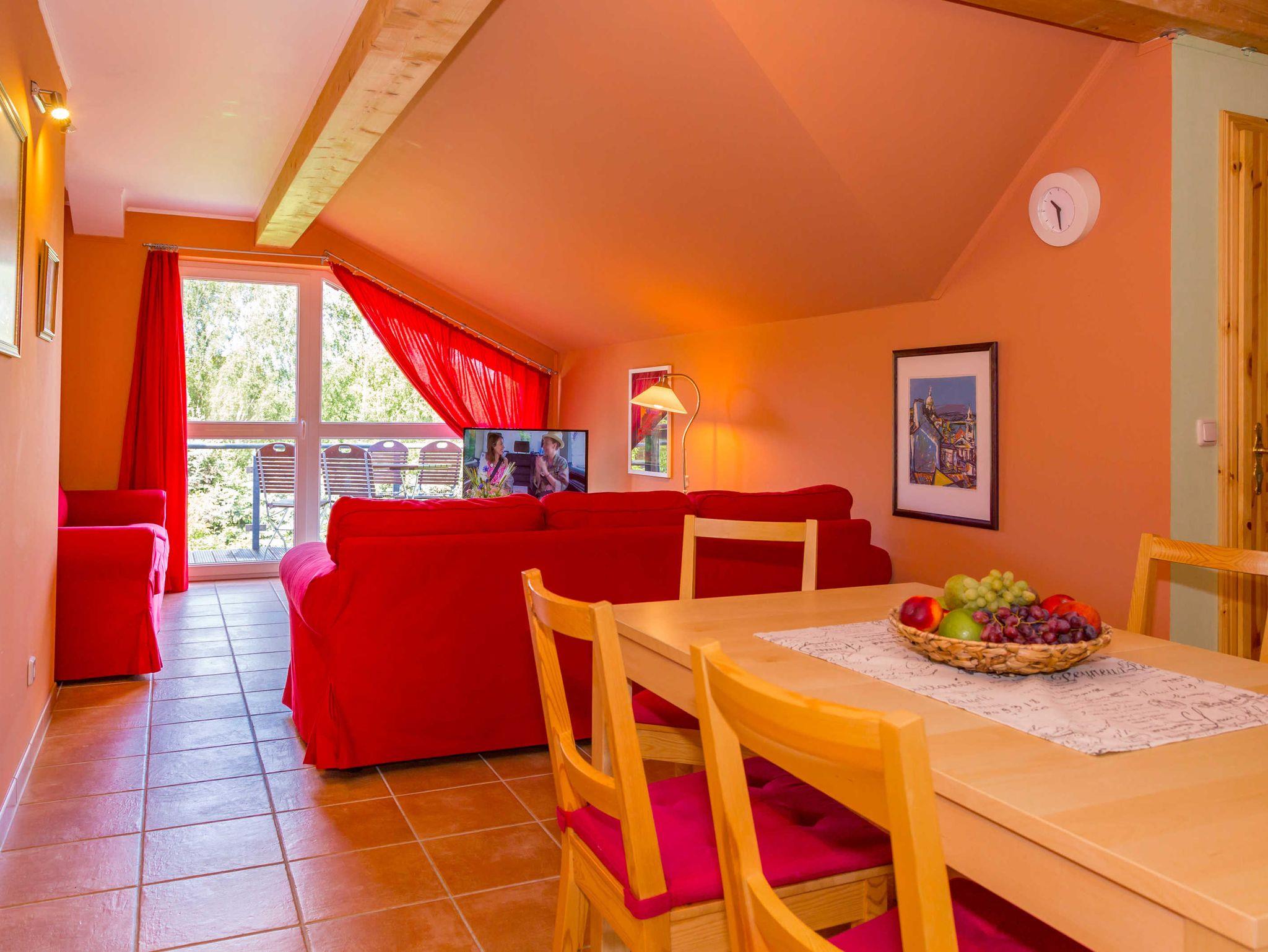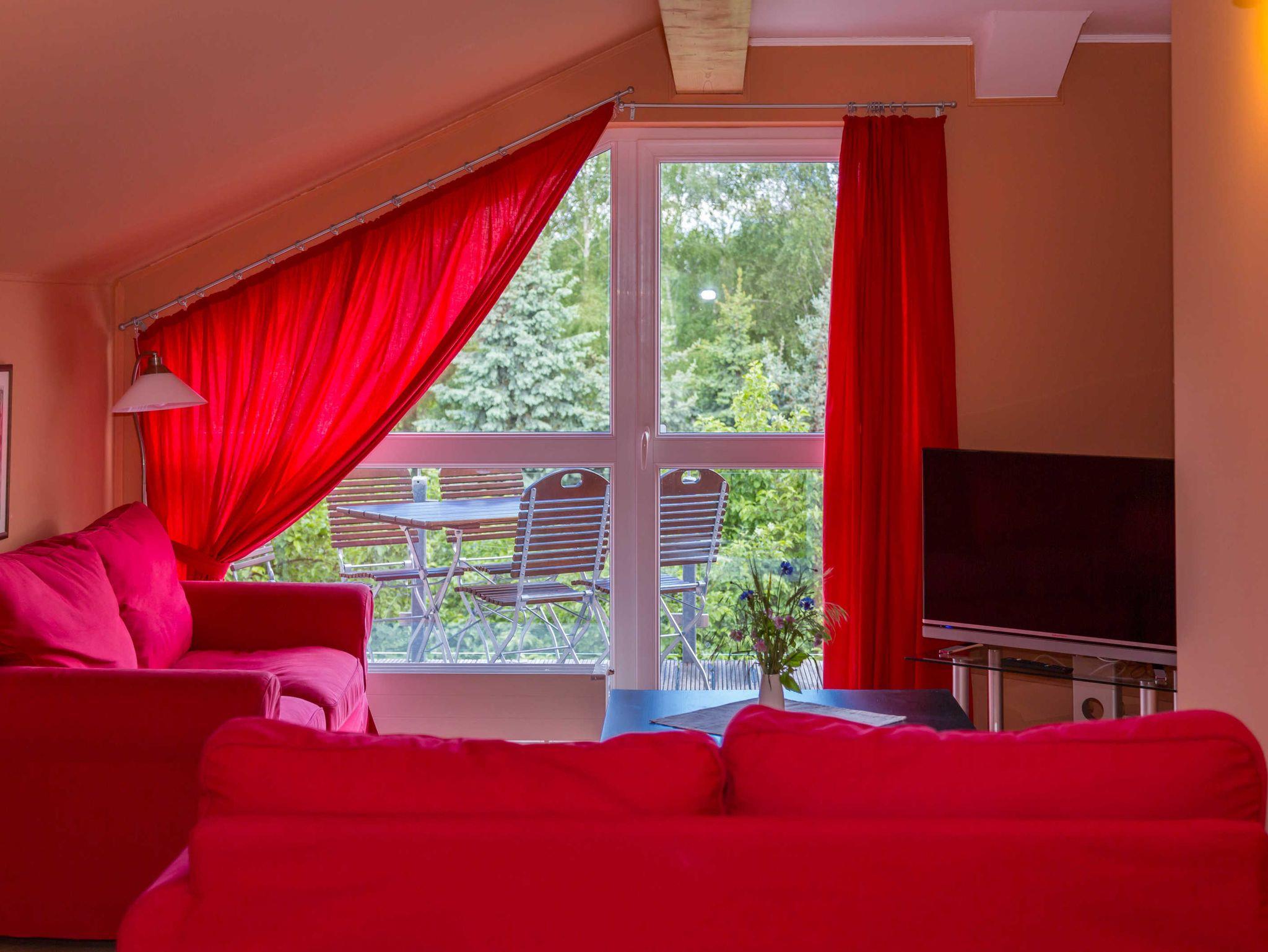 Die Ferienwohnung 5 (70qm - Mansarde) befindet sich in der zweiten Etage des Ferienhauses und besteht aus einem Wohnzimmer mit großem Esstisch für 4-6 Personen, Couchsitzecke mit TV-Gerät und der Ausgang zum gemütlichen Balkon. Eine sehr gut ausgestattete Küche (Ceranherd mit Backofen, Mikrowelle, Kaffeemaschine, Wasserkocher, Toaster) integriert sich mit ein. Ein Bad mit Dusche, WC und Waschbecken, ein großes separates Schlafzimmer mit Doppelbett, ein kleineres Schlafzimmer (Dachschräge, niedrige Deckenhöhe) mit 2 getrennten Betten und ein kleines Kinderschlafzimmer (ganz niedrige Butzentür, mit Dachschräge, ideal für Kinder oder junge Erwachsene geeignet) fügen sich mit ein. Die Wohnung ist von der Westseite aus über eine kurze Außen- und Innentreppe erreichbar. Das WLAN ist kostenfrei nutzbar.