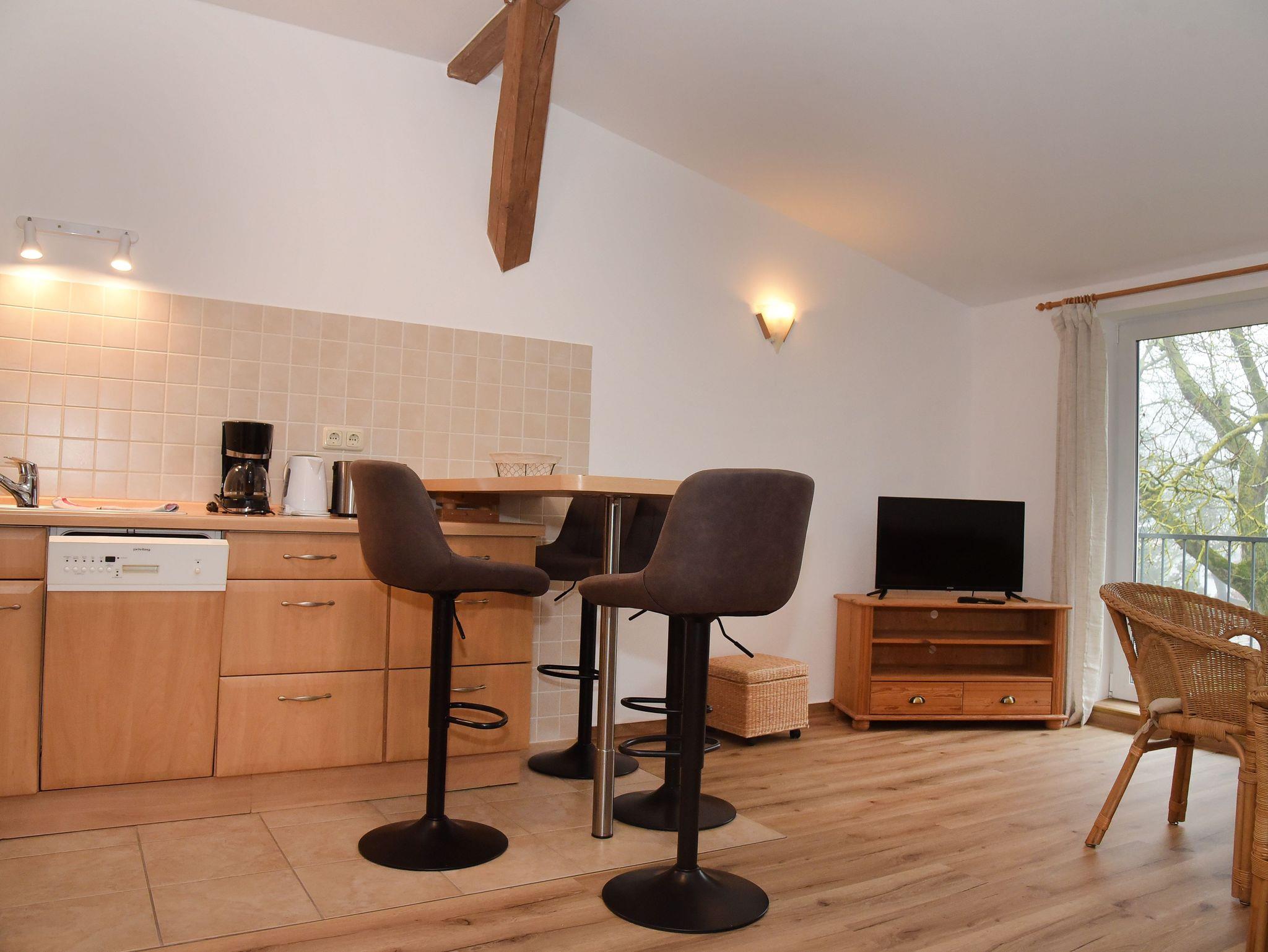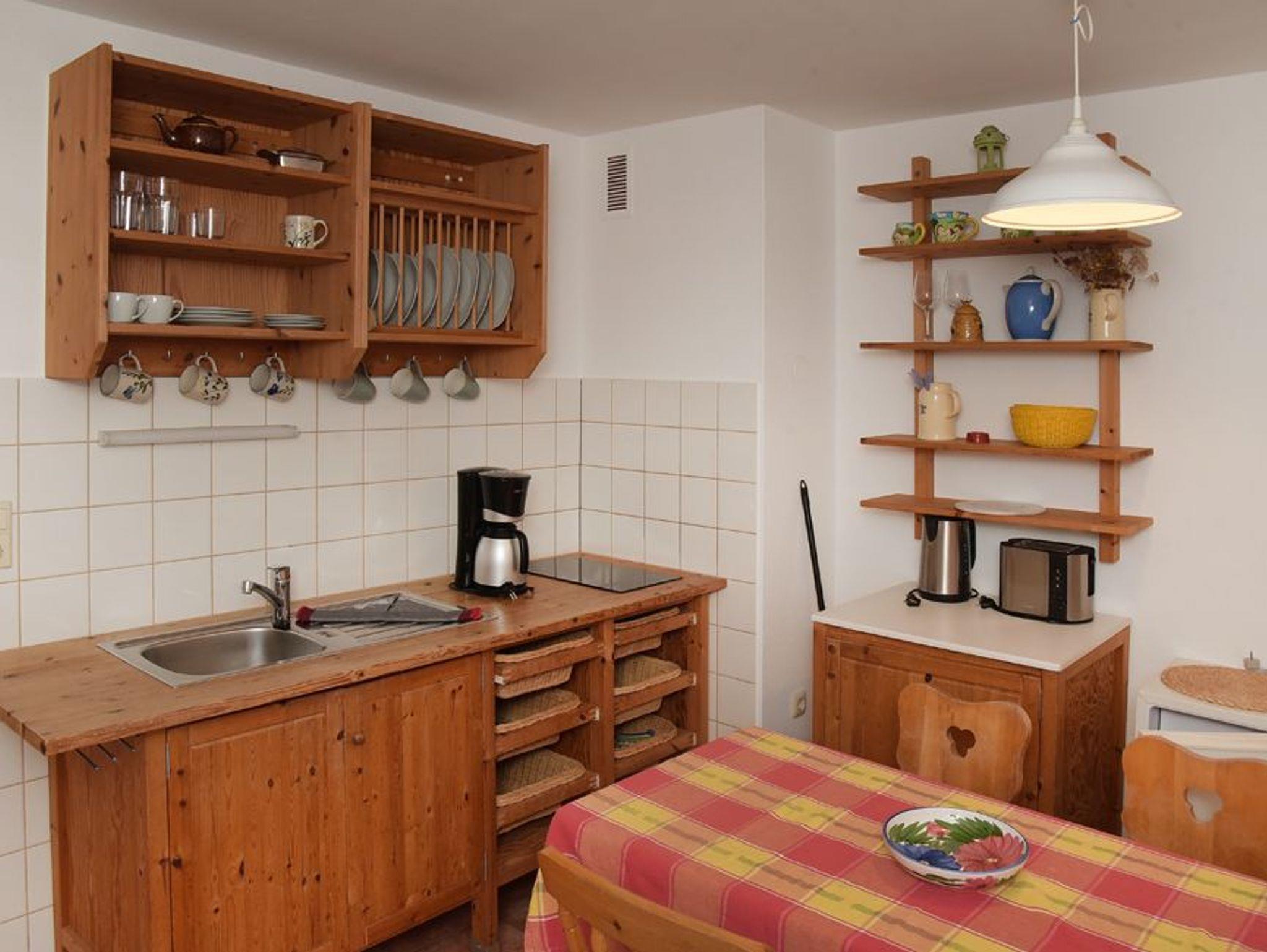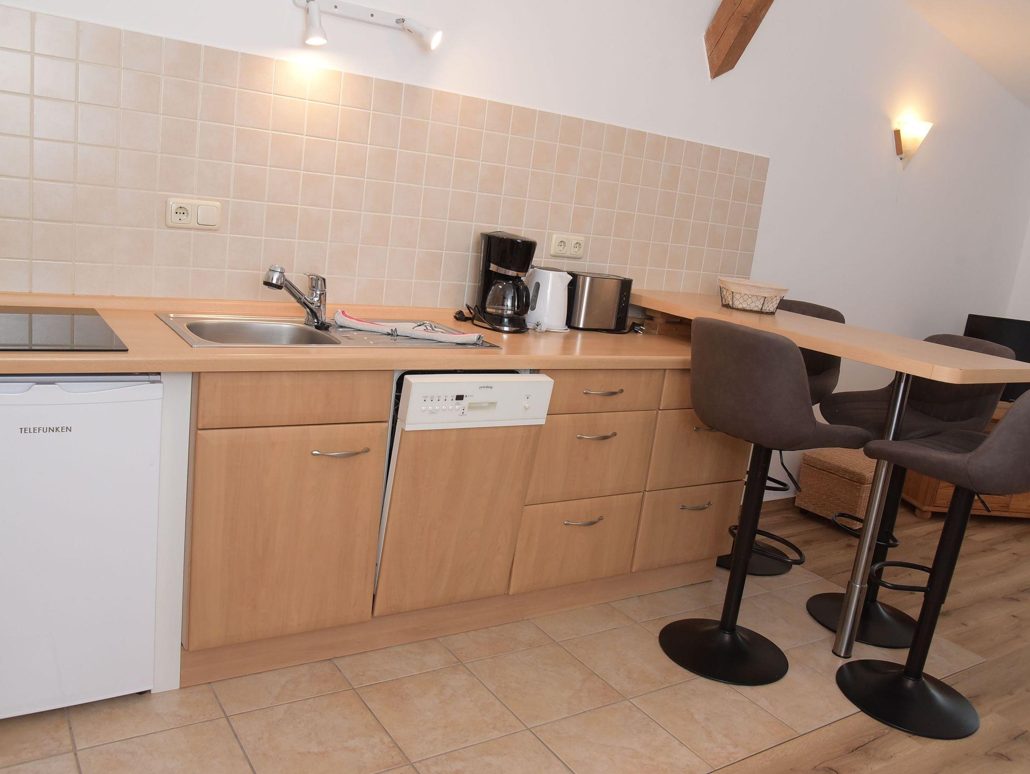 De, Wasserkocher, Toastie gemütliche 3-Raum-Nichtraucher-Ferienwohnung Heuboden 5 befindet sich im 1. Obergeschoss und ist ca. 55 m² groß. Im Wohnzimmer befindet sich ein gemütliches Sofa, ein Tresen mit vier Stühlen, der als Essbereich genutzt wird und eine kleine offene Küchenzeile. Die Küchenzeile ist mit einem 2-Platten-Herd, Kühlschrank, Spülmaschiner und Kaffeemaschine ausgestattet. Das Badezimmer verfügt über eine Dusche und einen Haartrockner.