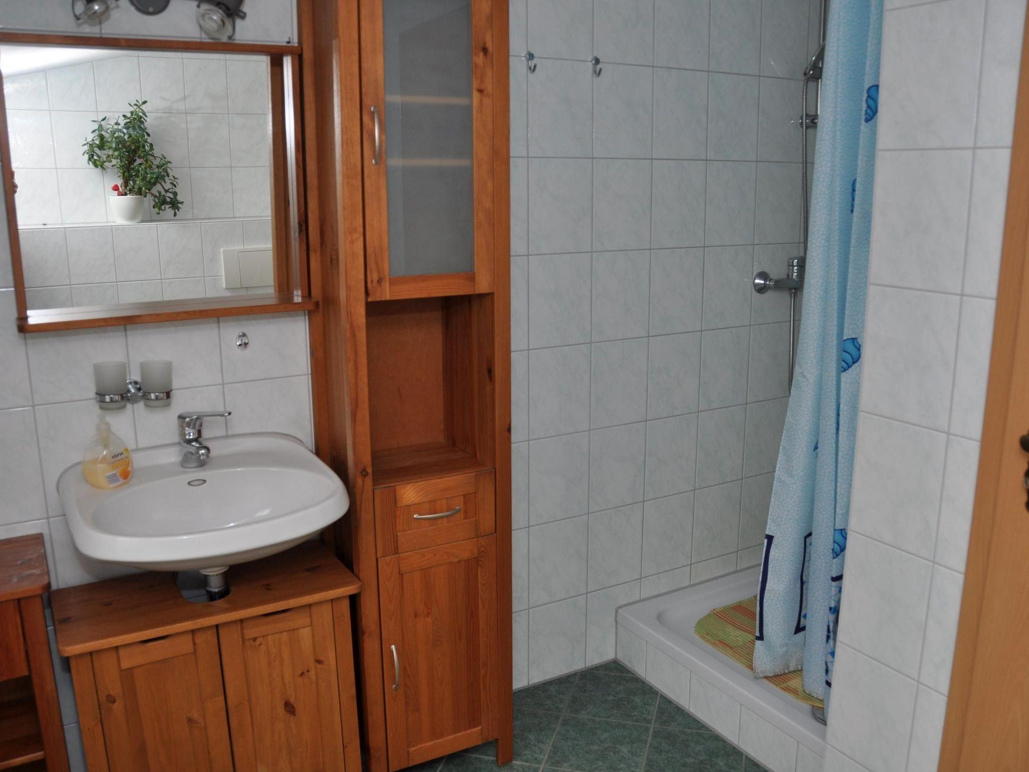 Das Bad ist sehr groß, es hat eine Dusche, ein Waschbecken und ein WC.