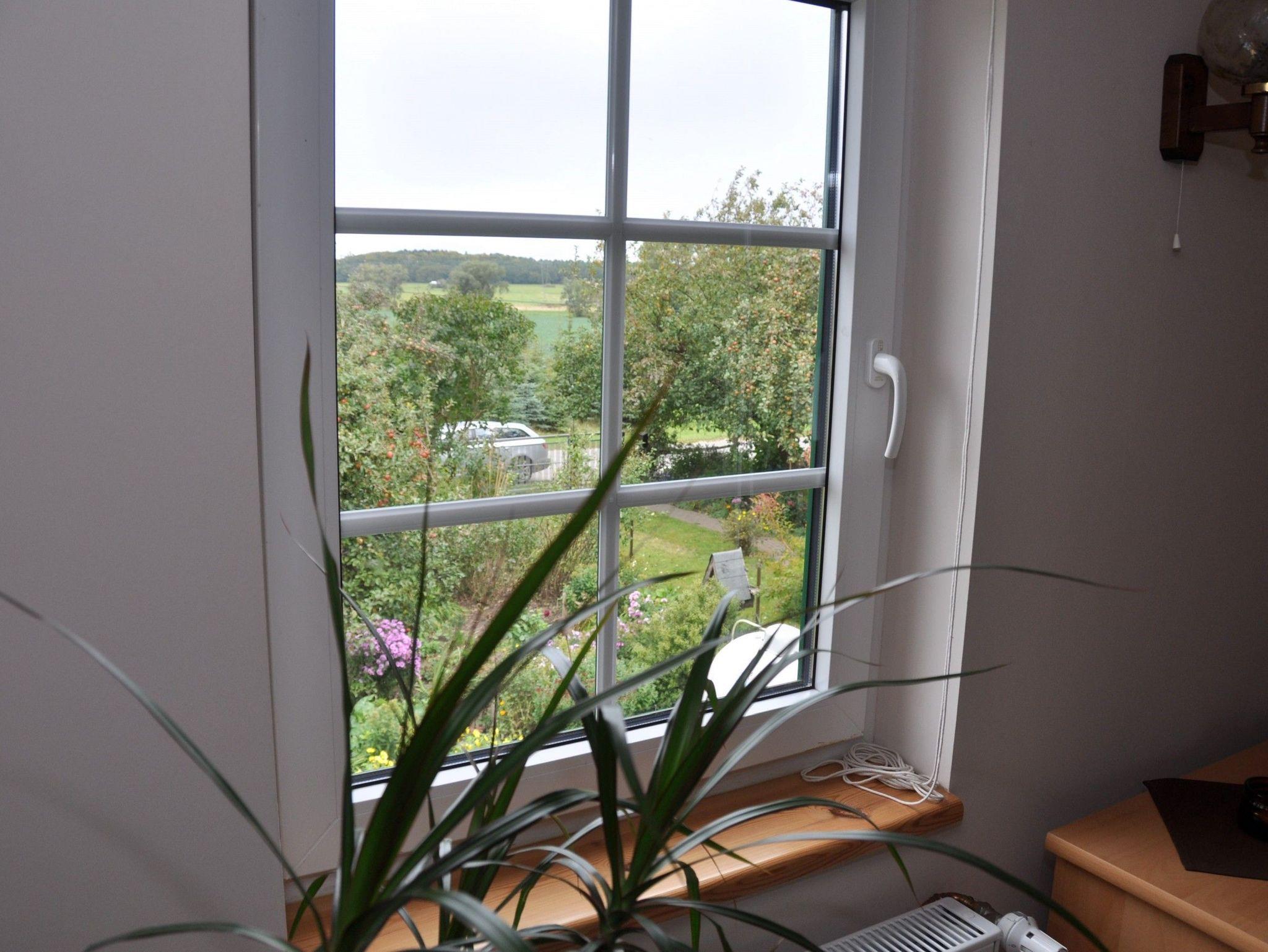 Vor der Wohnung befindet sich eine große Terrasse mit angrenzender Wiese. Genießen Sie die Sonne im Strandkorb und erfreuen Sie sich am Blick auf Feld und Flur.