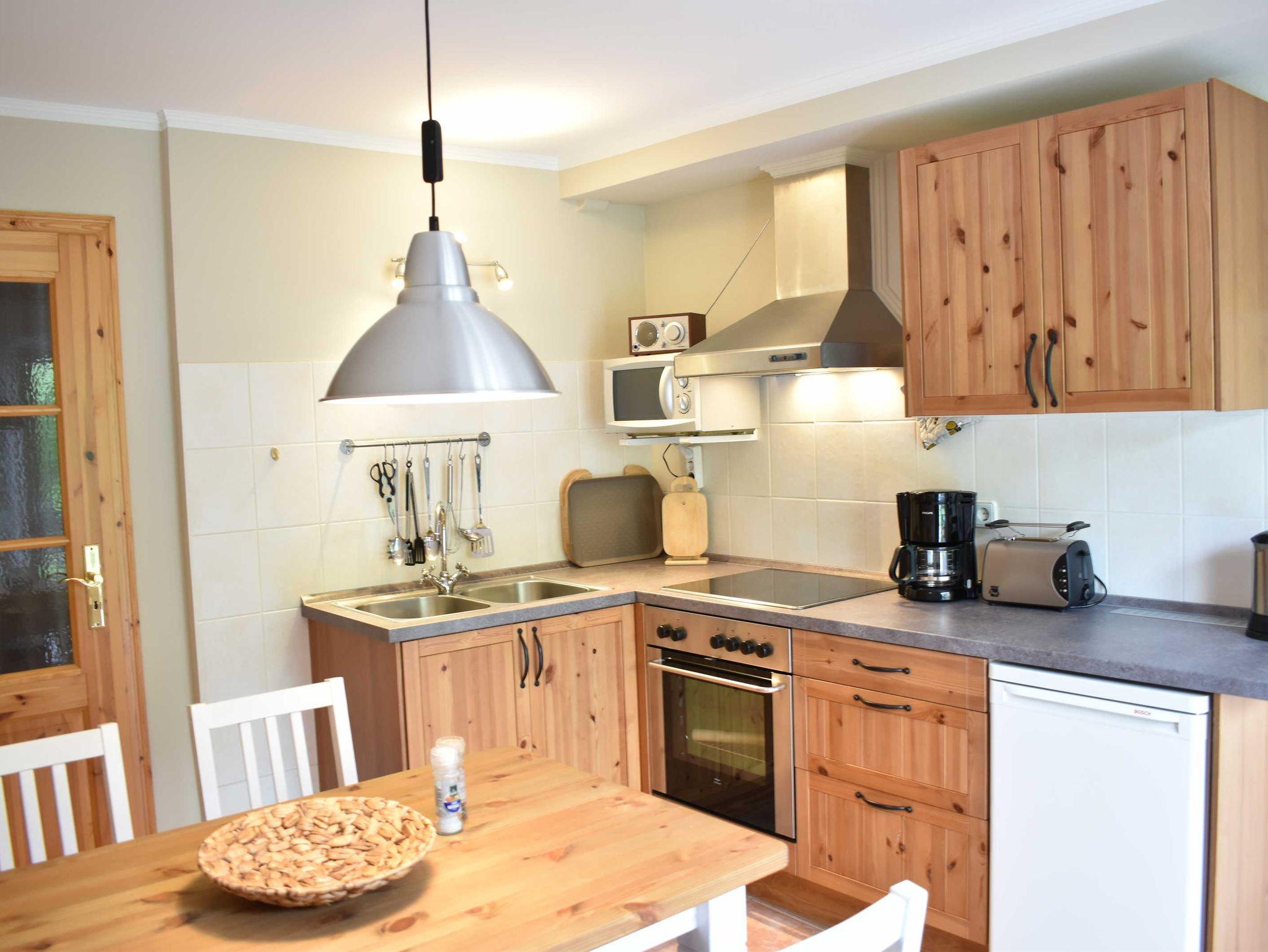 Die Ferienwohnung 1 (45qm) besteht aus einer gemütlichen Wohnküche (mit Kühlschrank mit eingebautem Gefrierfach, Mikrowelle, Kaffeemaschine, Wasserkocher, Toaster, Backofen) mit Digital- TV, einem Bad mit Dusche, WC und Waschbecken, einem kombinierten Wohn- und Schlafraum (2 Personen) mit altem Gebälk und einem weiteren Schlafzimmer für zwei Personen. Sie ist ideal für vier Personen geeignet, da jeder Raum separat liegt. Das Bad ist über einen kleinen Flur erreichbar. Das WLAN ist kostenfrei nutzbar.