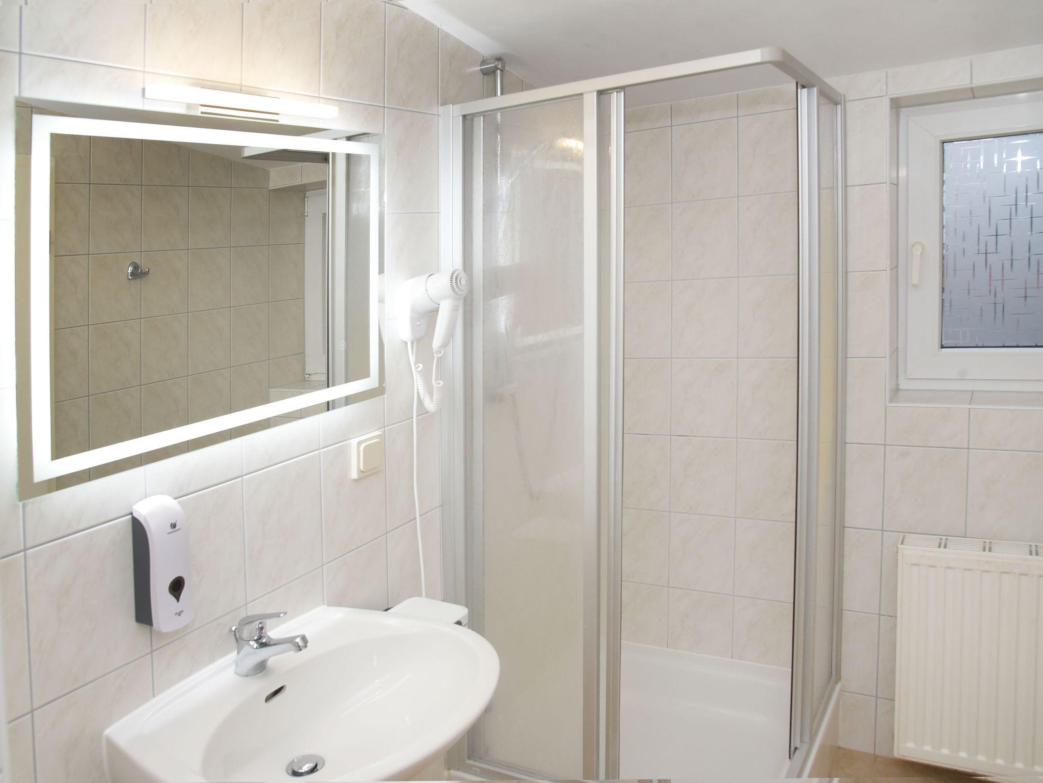 Badezimmer verfügt über eine Dusche und einen Haartrockner. Das