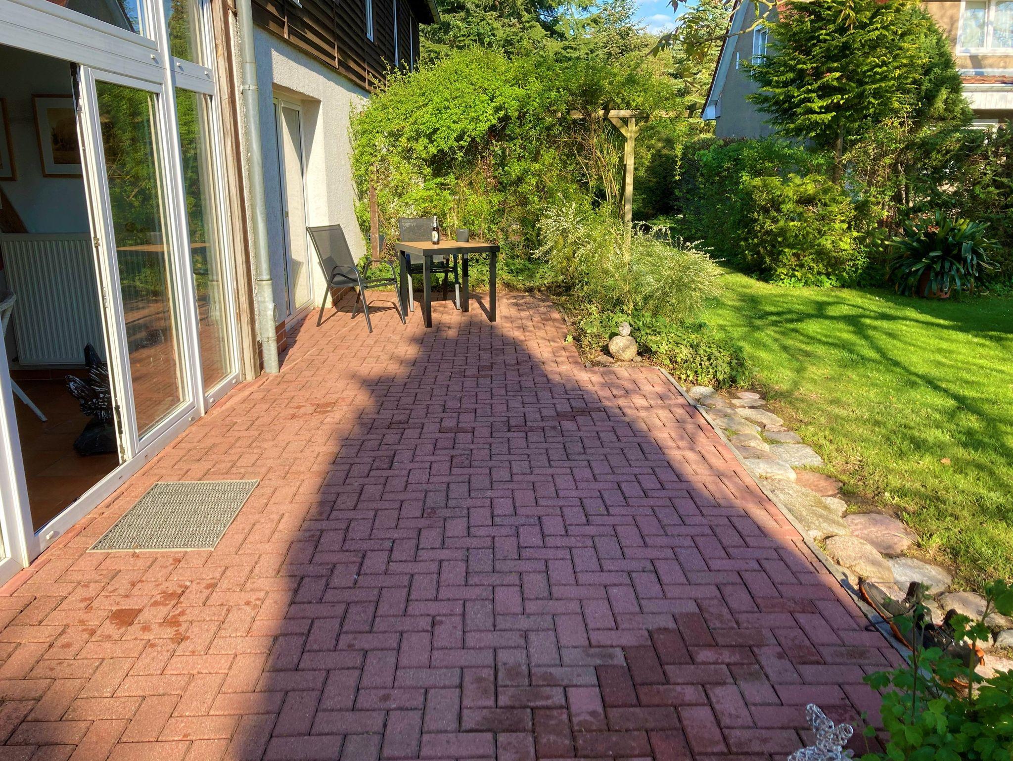 Die große Gemeinschaftsterrasse im Garten kann gern genutzt werden.