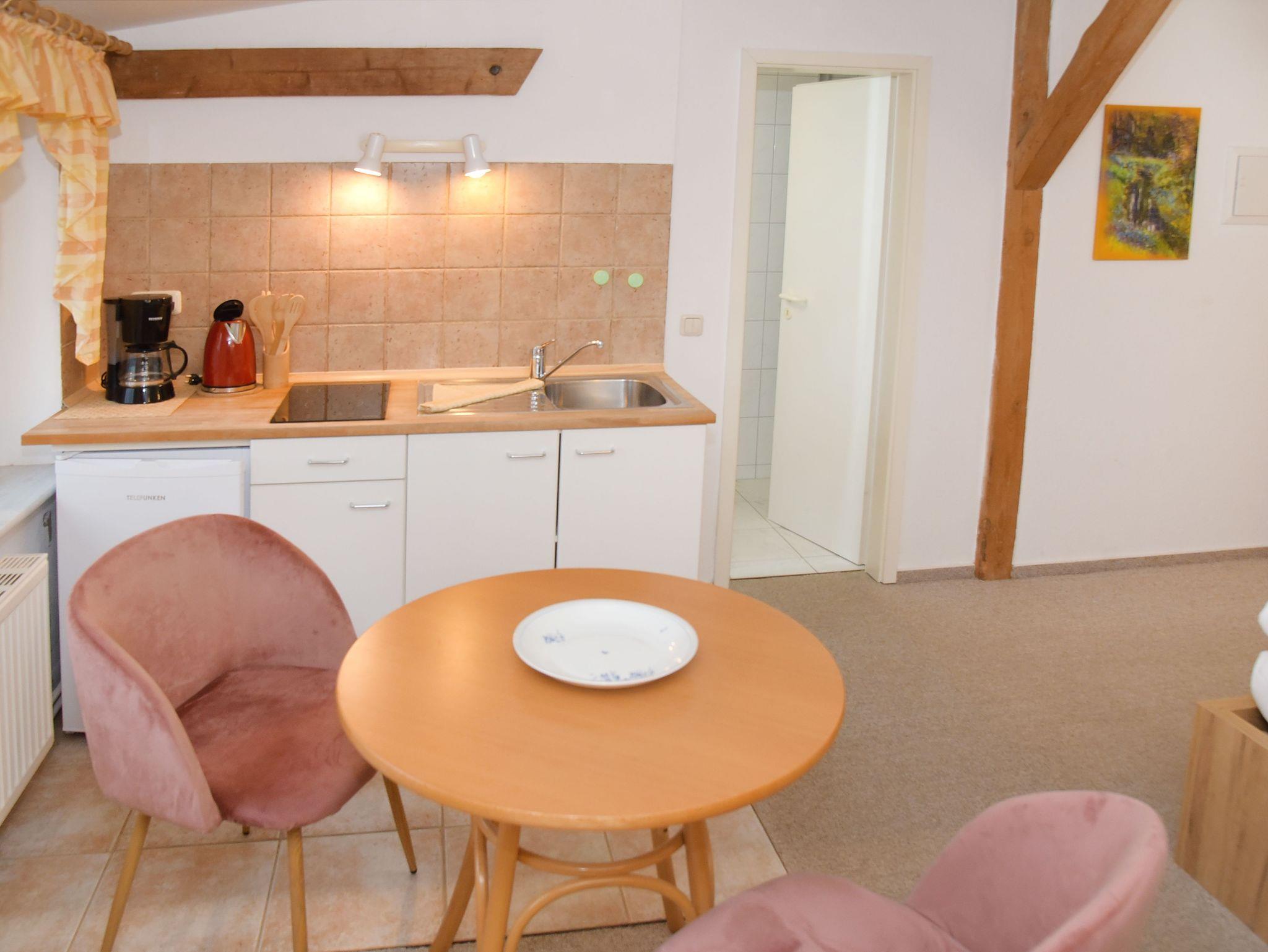 Die gemütliche 1-Raum-Nichtraucher-Ferienwohnung Heuboden 1 befindet sich im 1. Obergeschoss und ist ca. 22 m² groß. Im kombinierten Wohn- und Schlafraum befindet sich ein Doppelbett, eine Sitzgelegenheit mit zwei Stühlen, sowie eine kleine offene Küchenzeile. Die Küchenzeile ist mit einem 2-Platten-Herd, Kühlschrank, Wasserkocher, Toaster und Kaffeemaschine ausgestattet. Das Badezimmer verfügt über eine Dusche und einen Haartrockner.