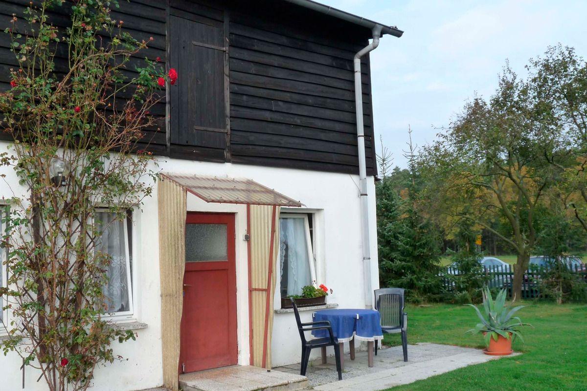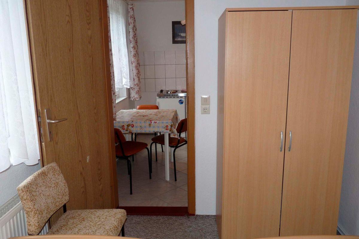 Über den Flur mit Flurgarderobe betreten Sie das Ferienhaus. Hier ist auch das Bad mit Dusche und WC. In der Küche stehen Küchenschränke und ein Modul mit zwei Kochplatten, einem Kühlschrank mit Gefrierfach und einer Spüle. Des weiteren finden Sie hier eine Kaffeemaschine, Toaster, Wasserkocher und einen Tisch mit Stühlen. Von hier gelangen Sie in das kleine Schlafzimmer mit zwei Einzelbetten und einem Kleiderschrank. Im Wohnzimmer stehen ein Doppelbett, ein Kleiderschrank, eine Couch, ein Tisch, zwei Sessel und der Fernseher. Zur Ferienwohnung gehört eine eigene Südterrasse mit Gartenmöbeln, Sonnenschirm und Grill. Wenn Sie möchten können Sie auch gern die große überdachte Terrasse mit Grill nutzen. PKW Stellplätze sind auf dem Grundstück vorhanden.