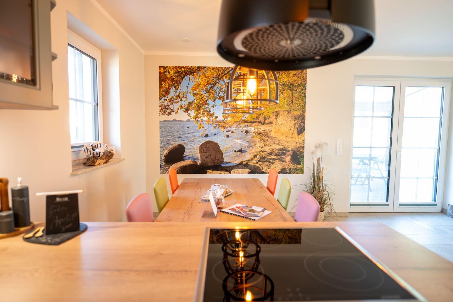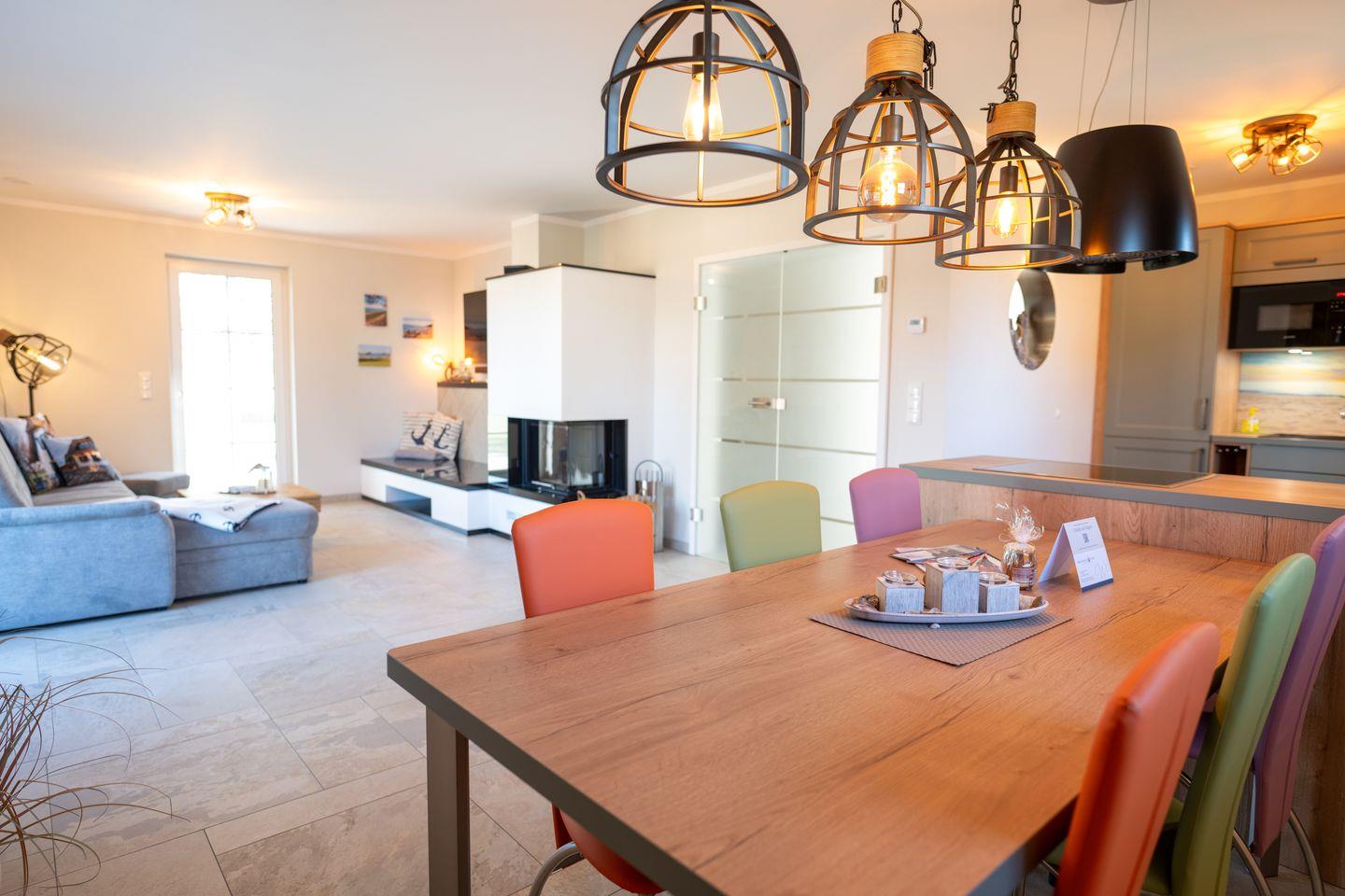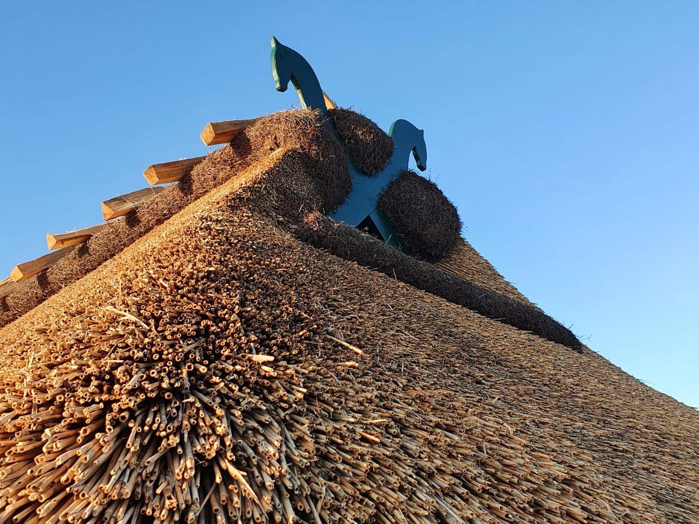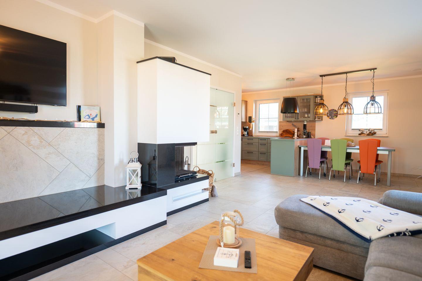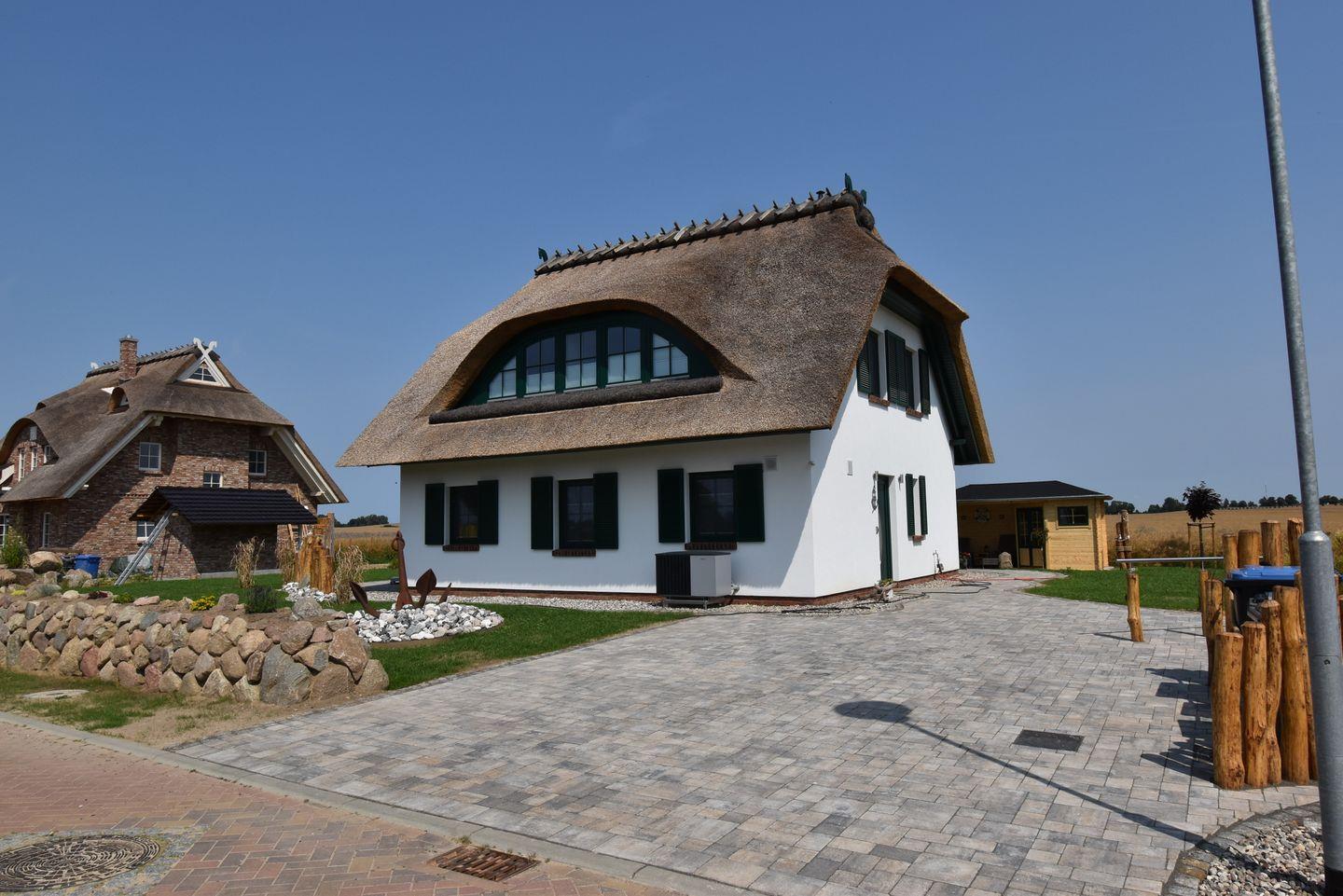 Das reetgedeckte Ferienhaus bietet auf 110 m² Platz für bis zu 6 Personen (5 Erwachsene und 1 Kind) und verbindet modernen Wohnkomfort mit behaglichem Landhausflair. Im offenen Erdgeschoss lädt der großzügige Wohnbereich mit Kamin, gemütlicher Sofaecke und hochwertiger Landhausküche zu gemeinsamen Stunden ein. Auf der überdachten Terrasse lässt sich der Tag wunderbar beim Essen im Freien oder einem Glas Wein ausklingen.