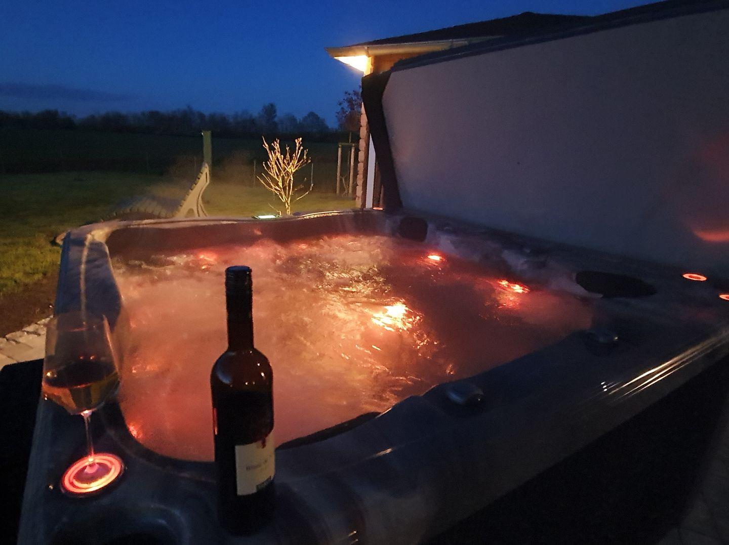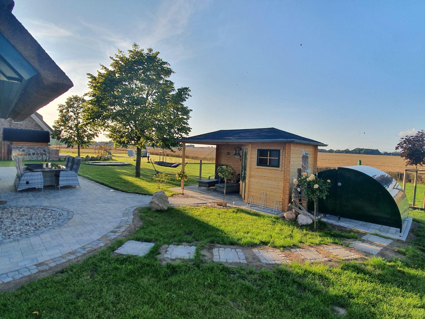 Ein echtes Highlight ist der überdachte, beheizte Whirlpool – wettergeschützt und zu jeder Jahreszeit nutzbar. Im kleinen Wellnessbereich mit finnischer Sauna und direktem Gartenzugang entspannen Sie nach einem Spaziergang oder einer Radtour durch die idyllische Landschaft.